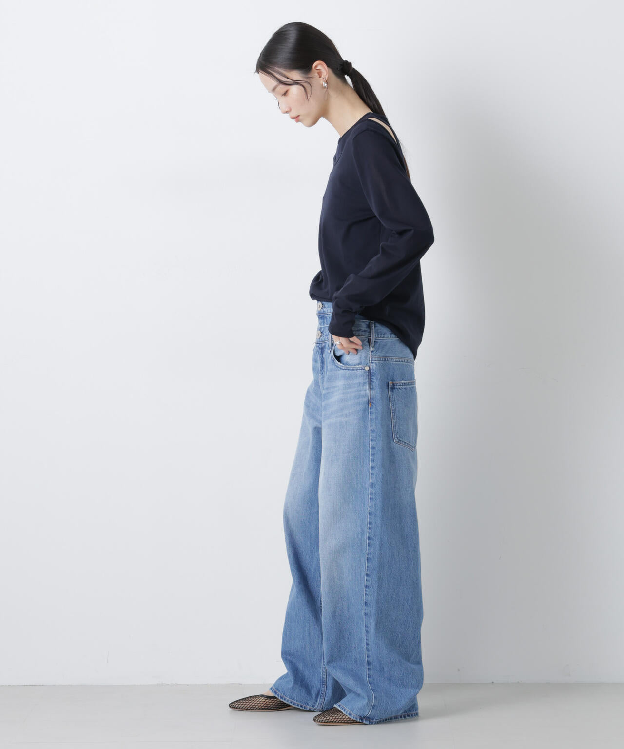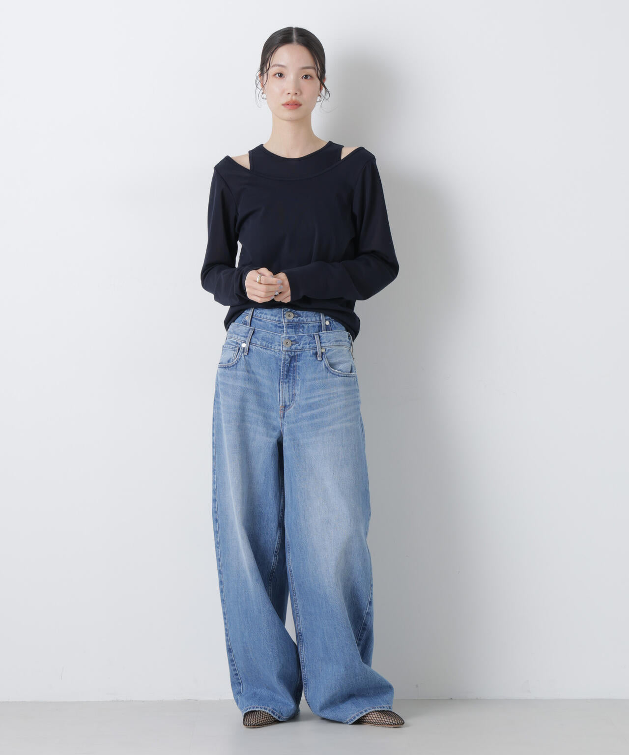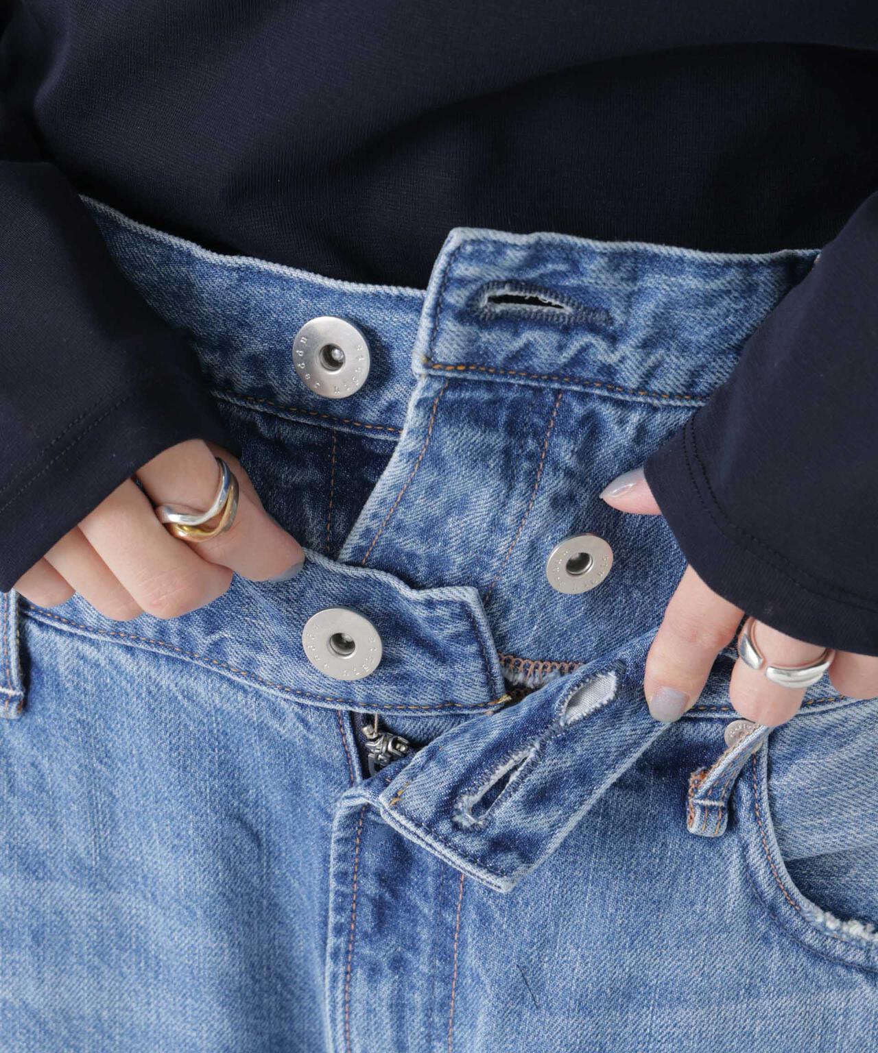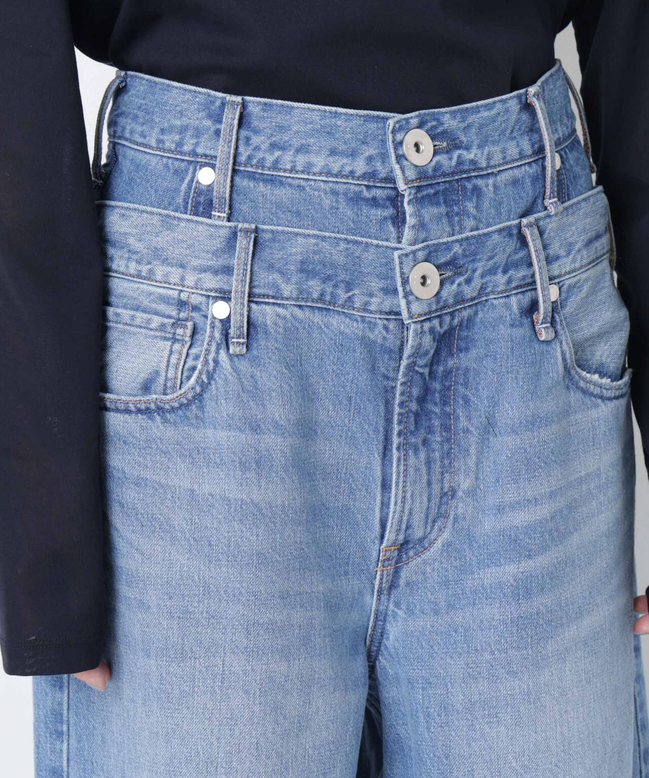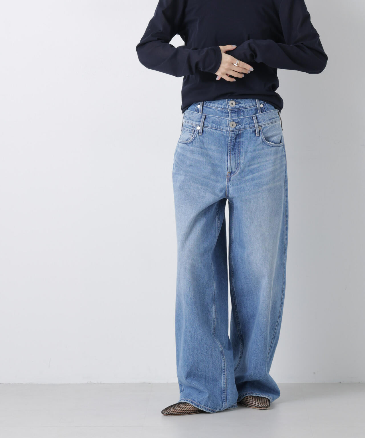 2枚のパンツを重ねて穿いているようなデザインの新型ワイドモデル「THE TWINS(ザ ツインズ)」。ダブルウエスト部分は取り外し可能で、ミドルライズのパンツとして着こなしたり、取り外したベルトパーツを単品使いでお手持ちのパンツやスカートにレイヤードしたり、アレンジを楽しめる万能なアイテムです。
