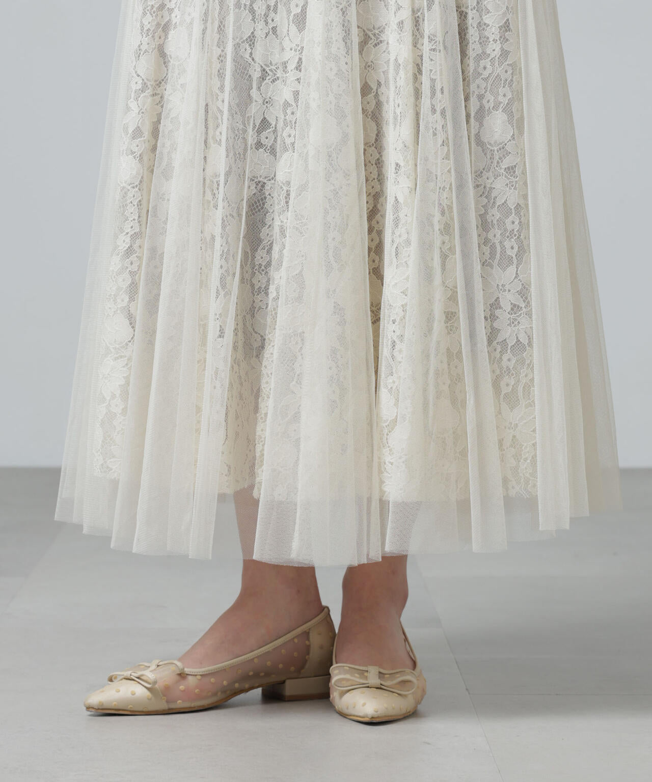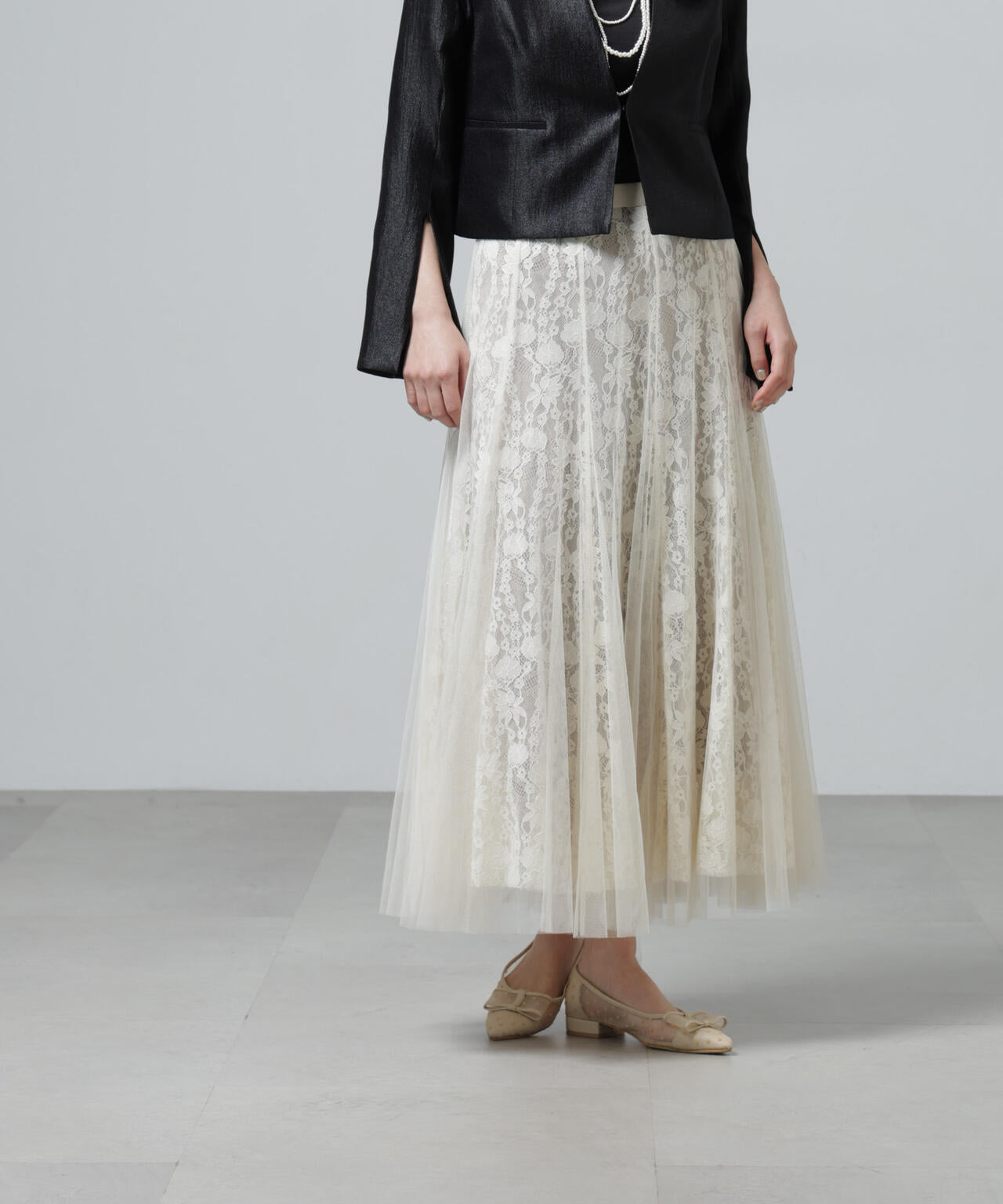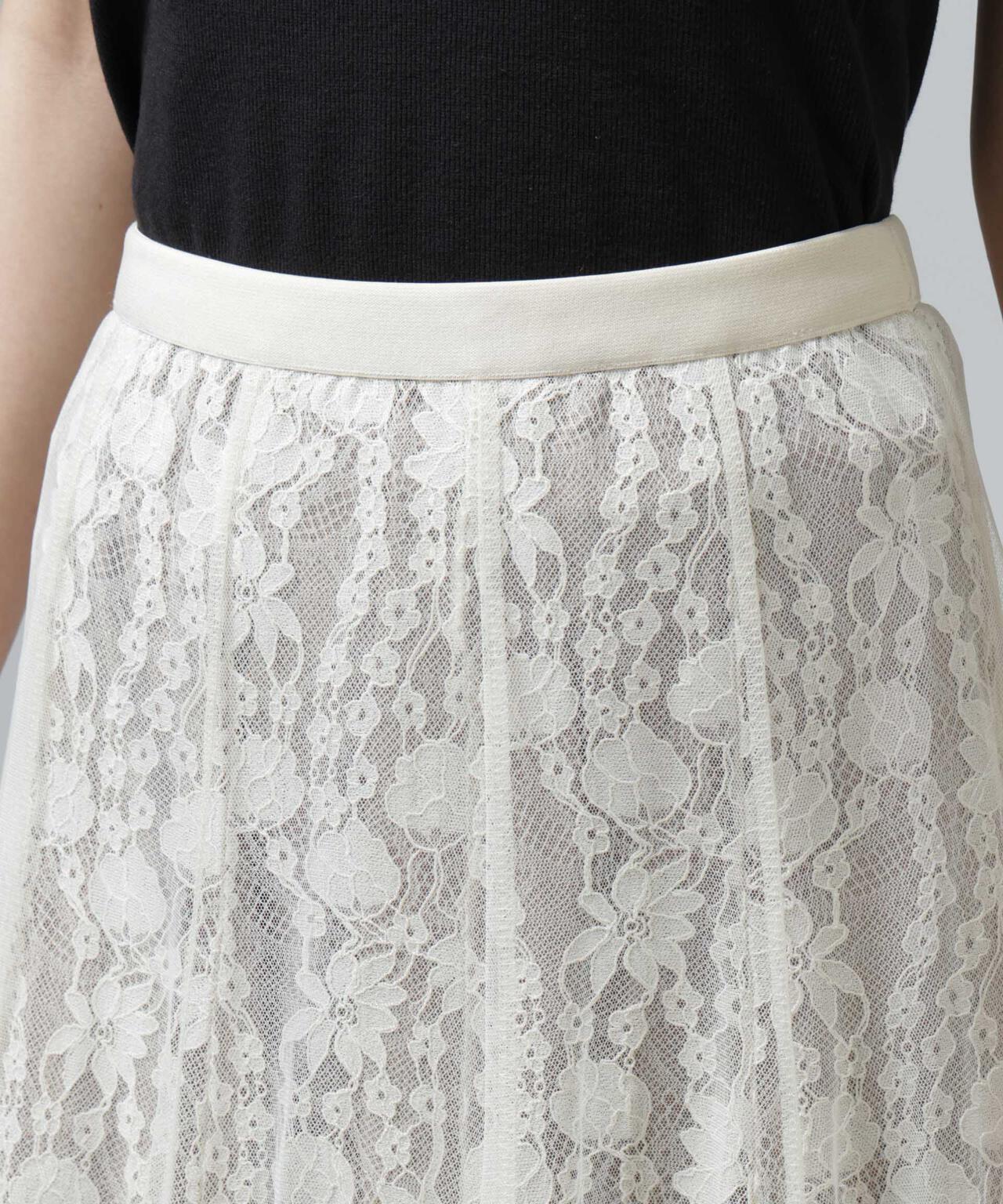 チュールから覗くレースが華やかで上品なロングスカート