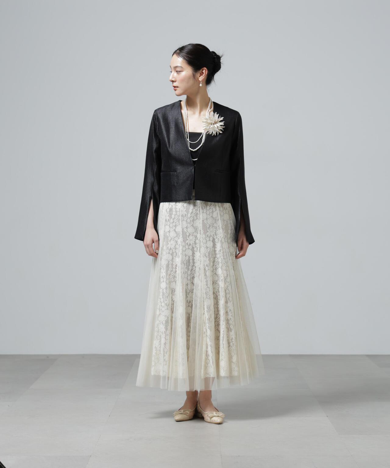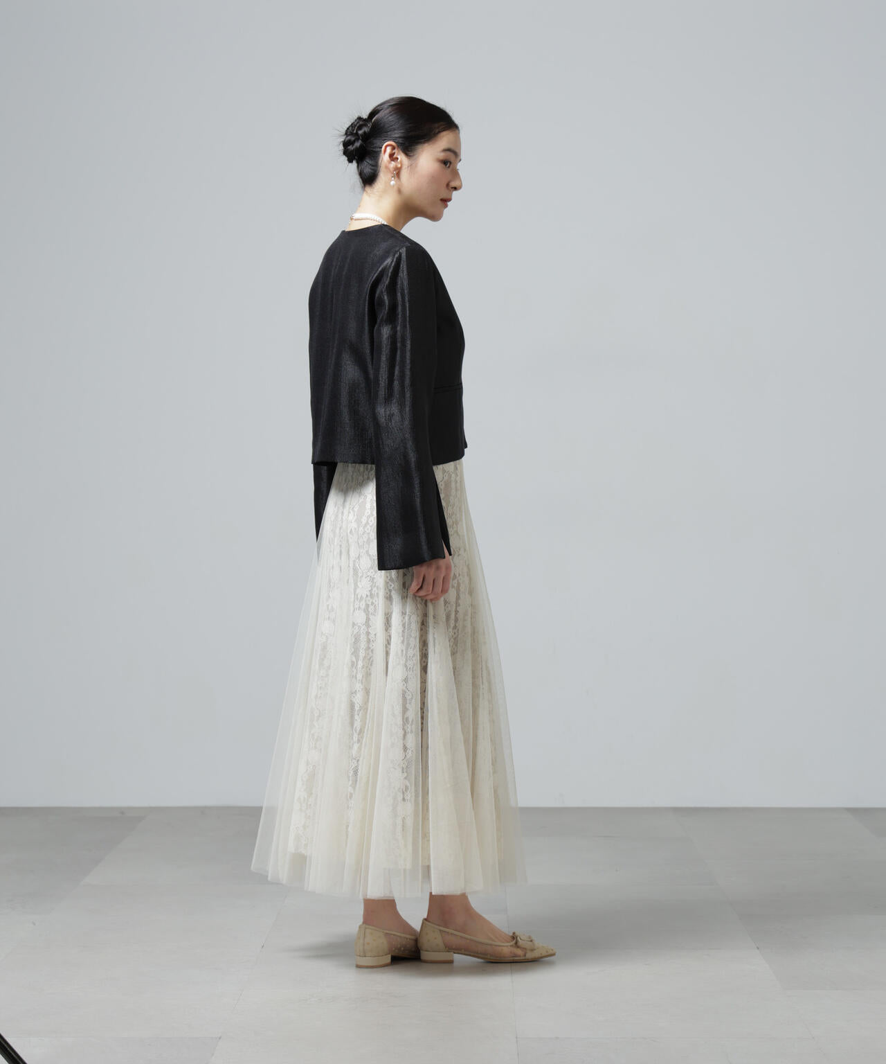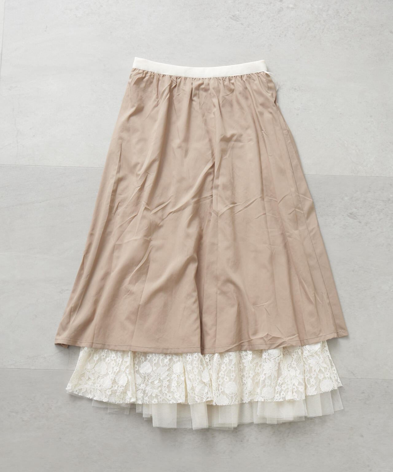 チュールから覗くレースが華やかで上品なロングスカート