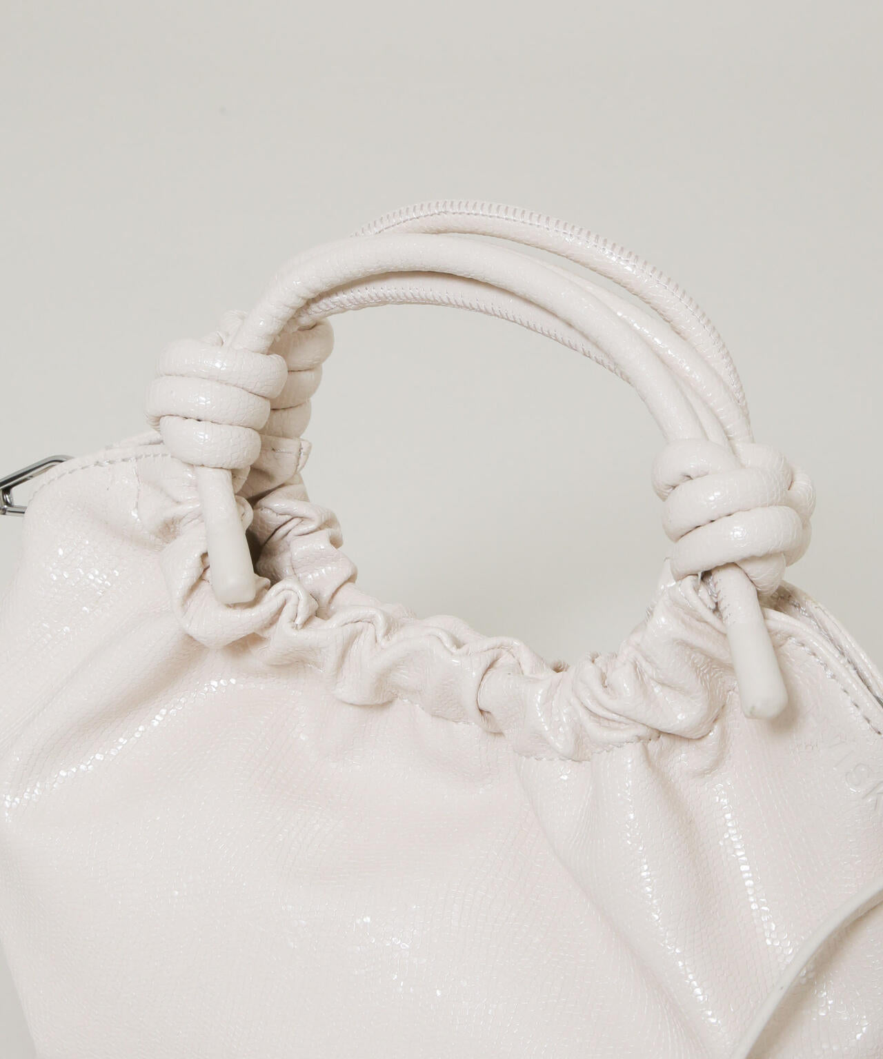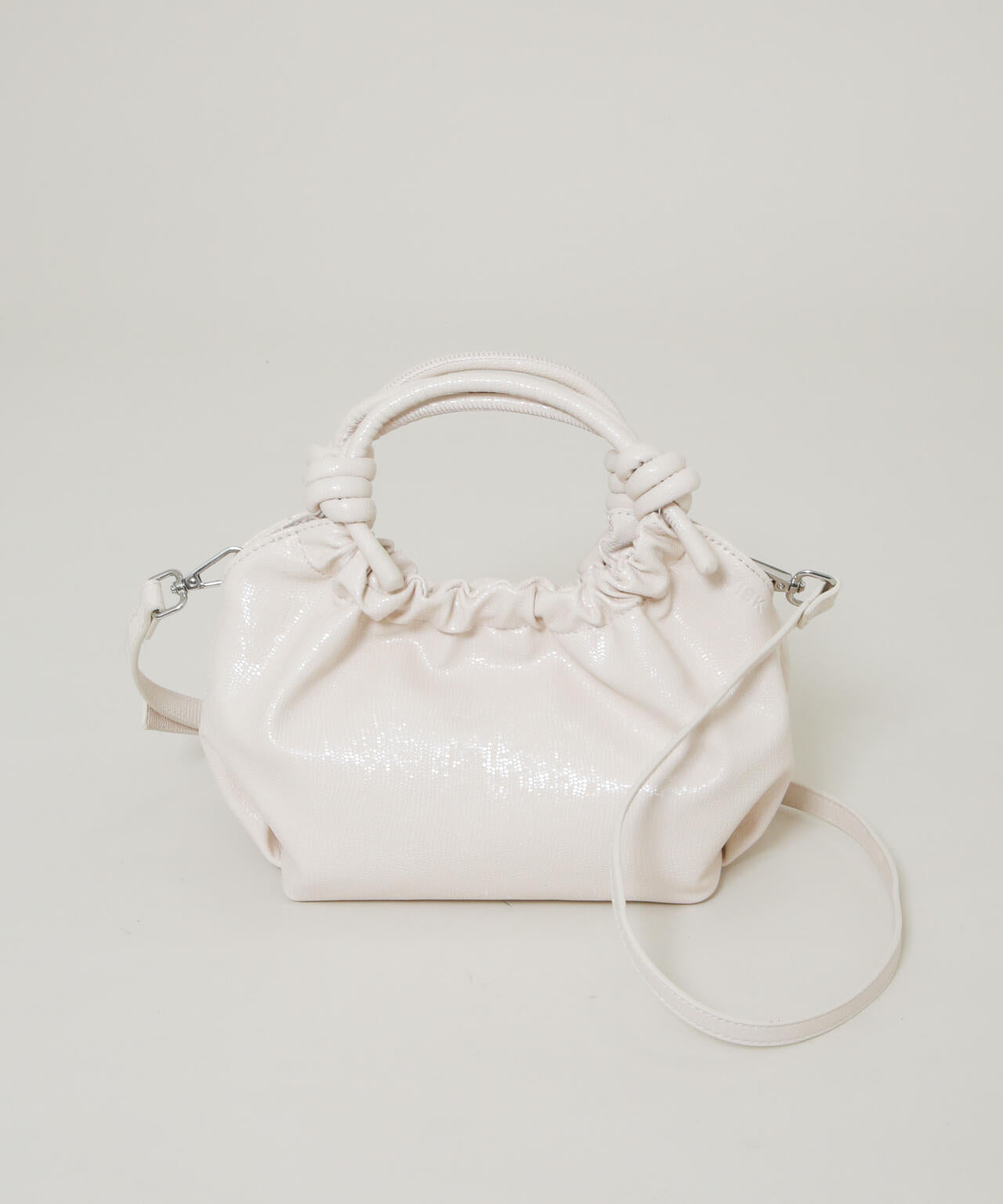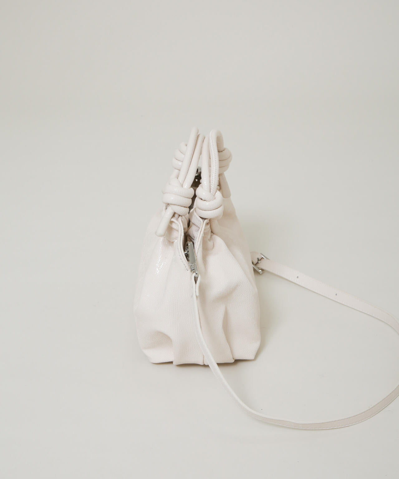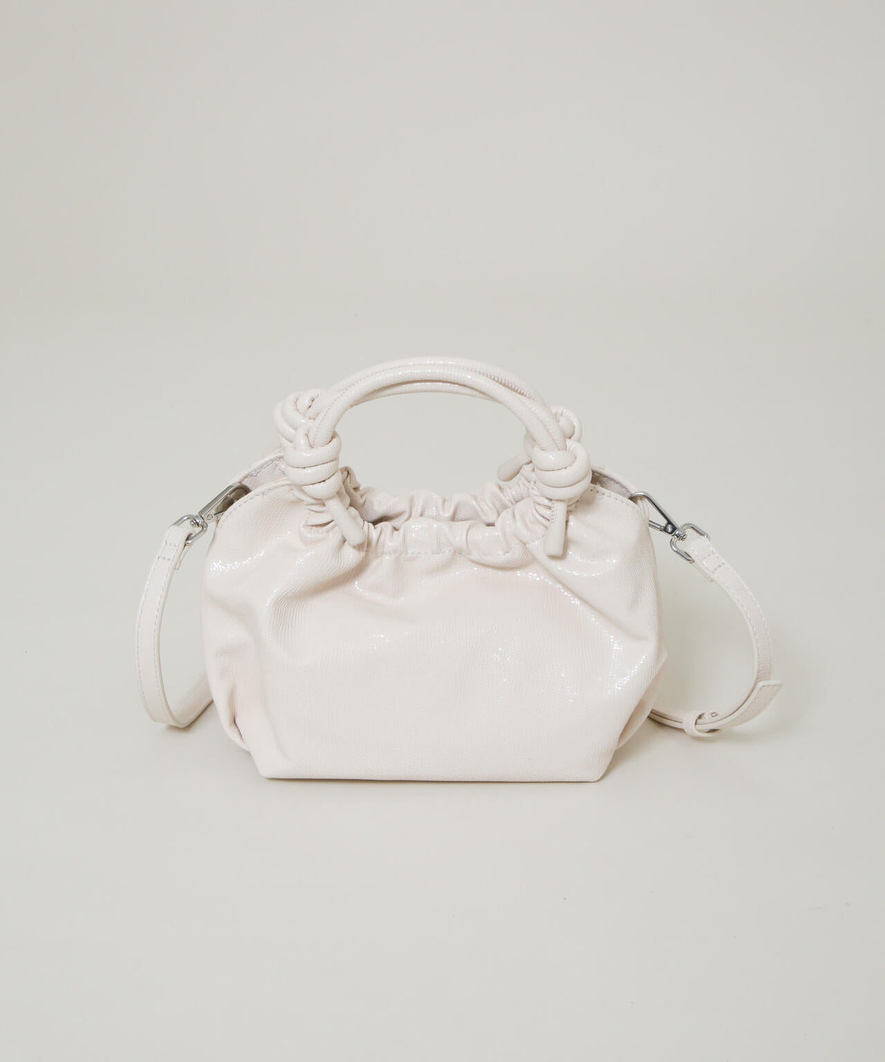 シンプルながらも個性的なノットデザインのハンドルが目を引く、コンパクトなミニハンドバッグ