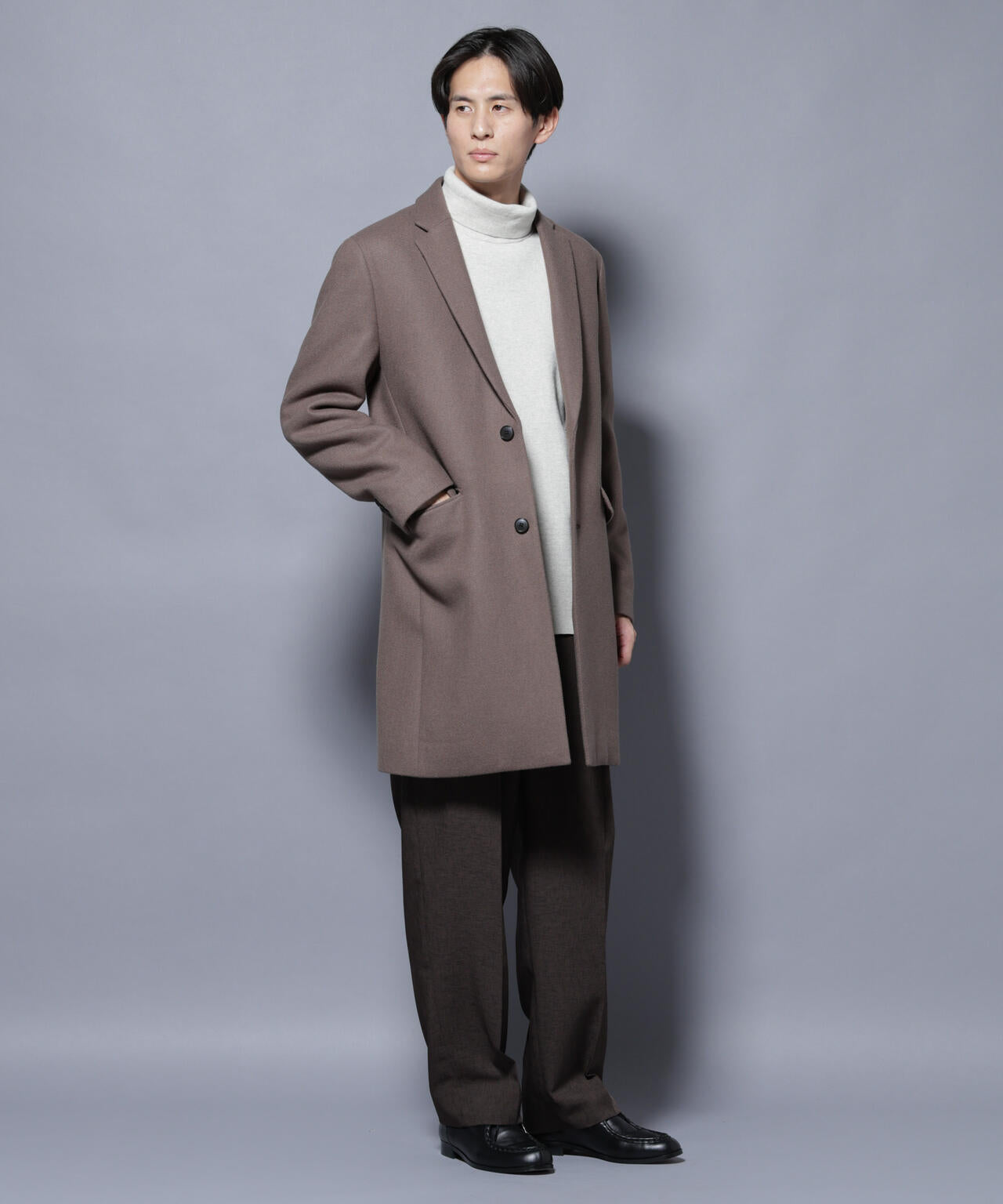 柔らかなウールブレンドメルトン素材で仕上げた、王道かつ洗練されたチェスターコート。細身でシャープなシルエットに、ややシェイプを効かせたウエストラインがスタイルをすっきり見せてくれる一着。ビジネスシーンはもちろん、休日のカジュアルスタイルにも活躍する汎用性の高いアイテムです。