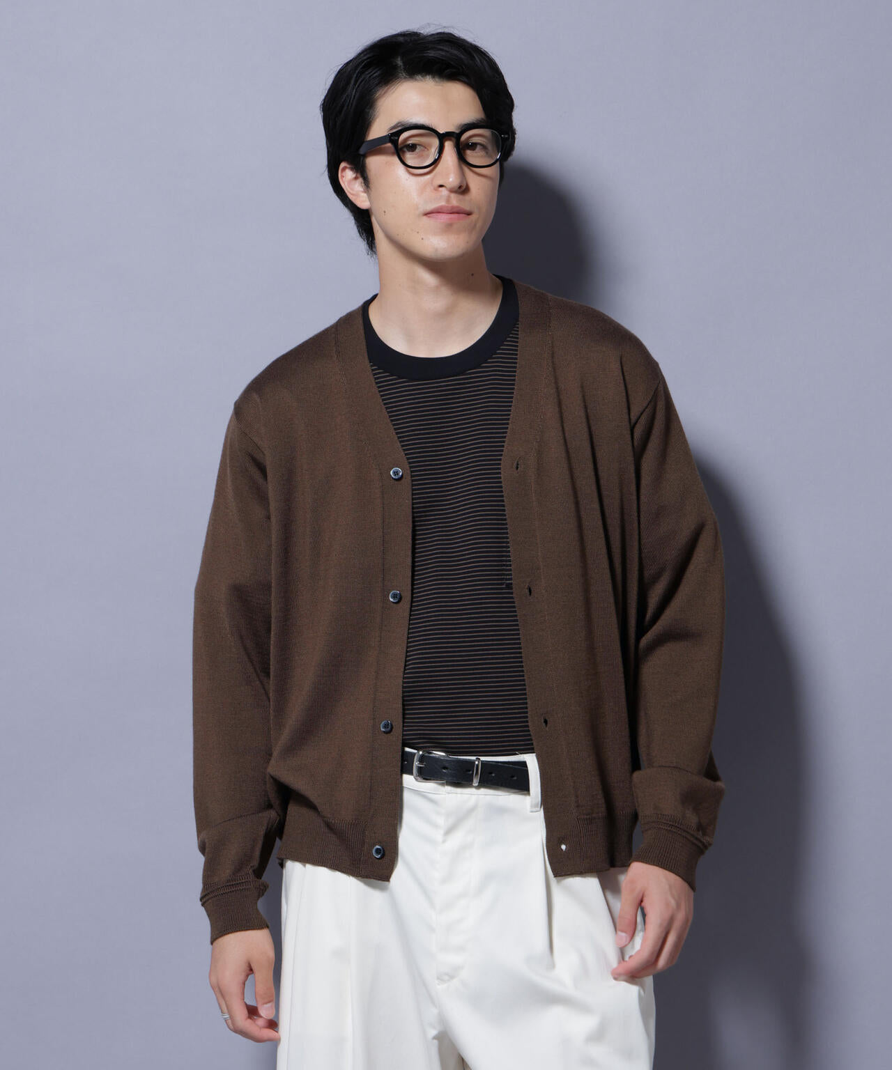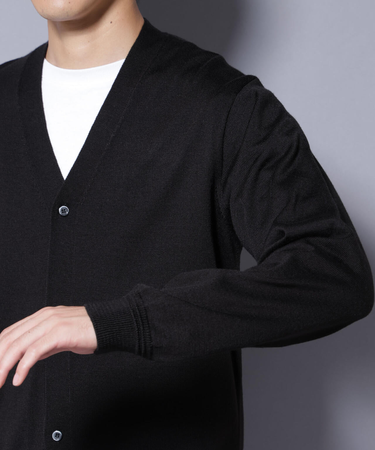希少なウールを使用した、ナノ定番のニットカーディガン。スーツのインナーやビジネスシーンなどでも使いやすい細身のシルエットが特徴。端境期から冬の寒い時期まで活躍する、一枚は持っておきたいアイテムです。