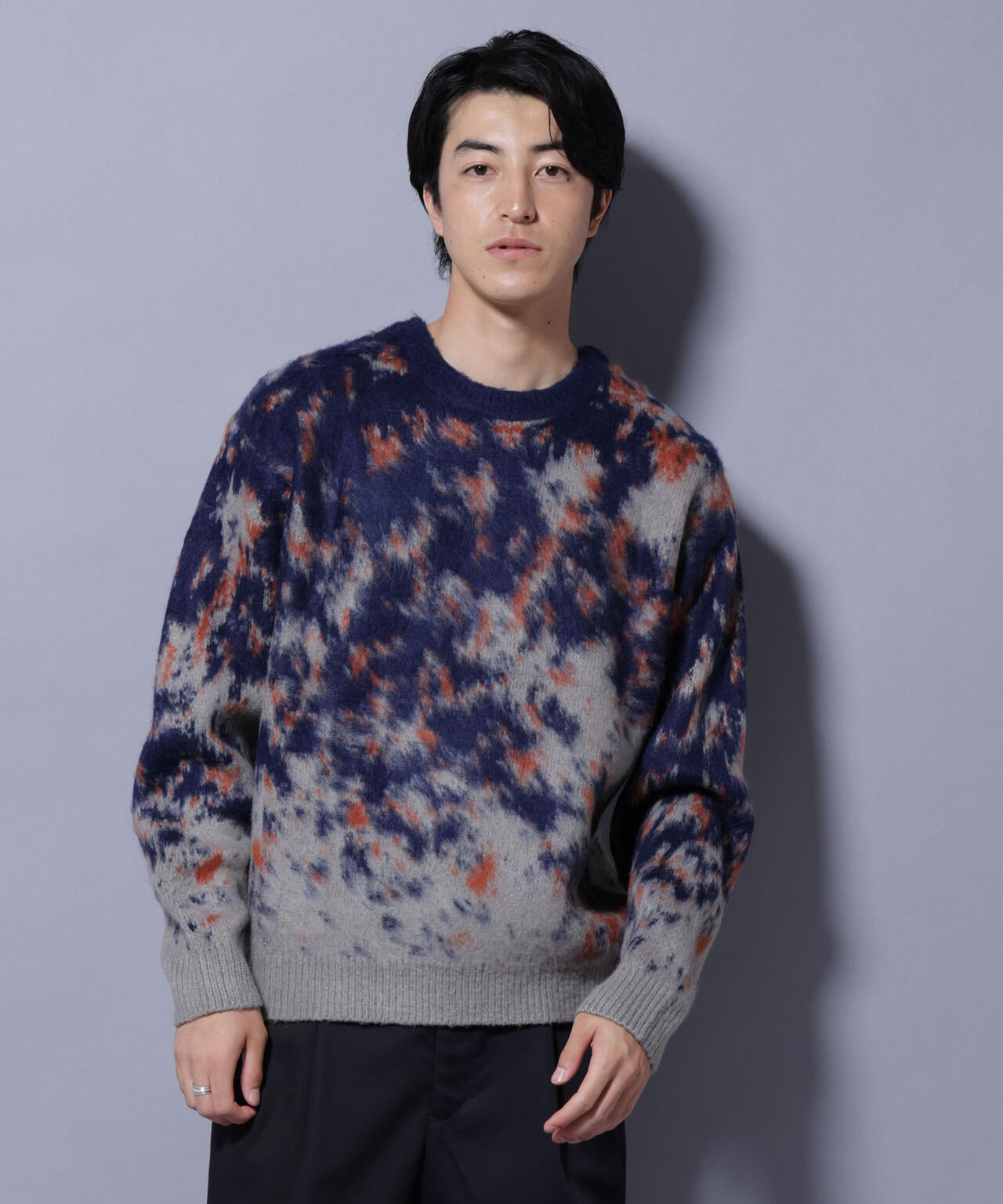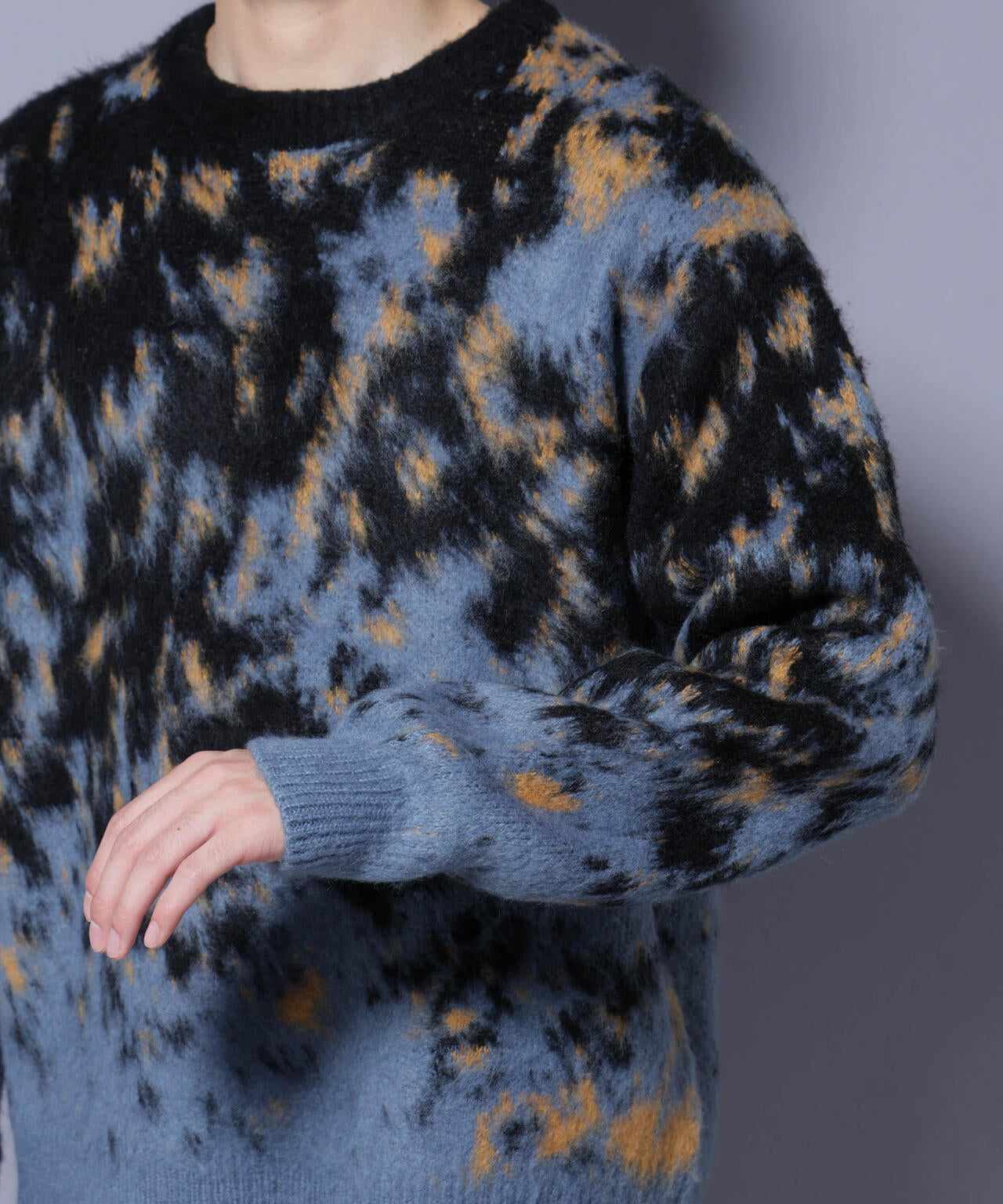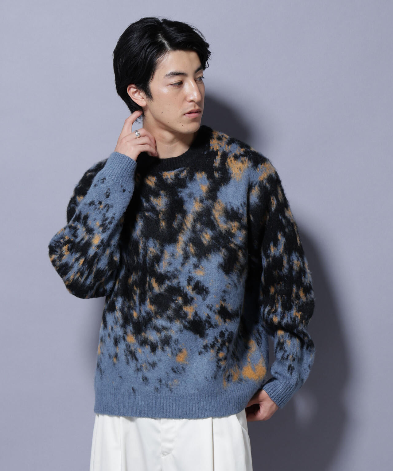 毛足が長くウォーム感のある秋冬活躍の総柄ニット。キャンパスにペンキを無造作にまき散らしたようなデザインが、一枚でもインナーとしても様になる1着です。
