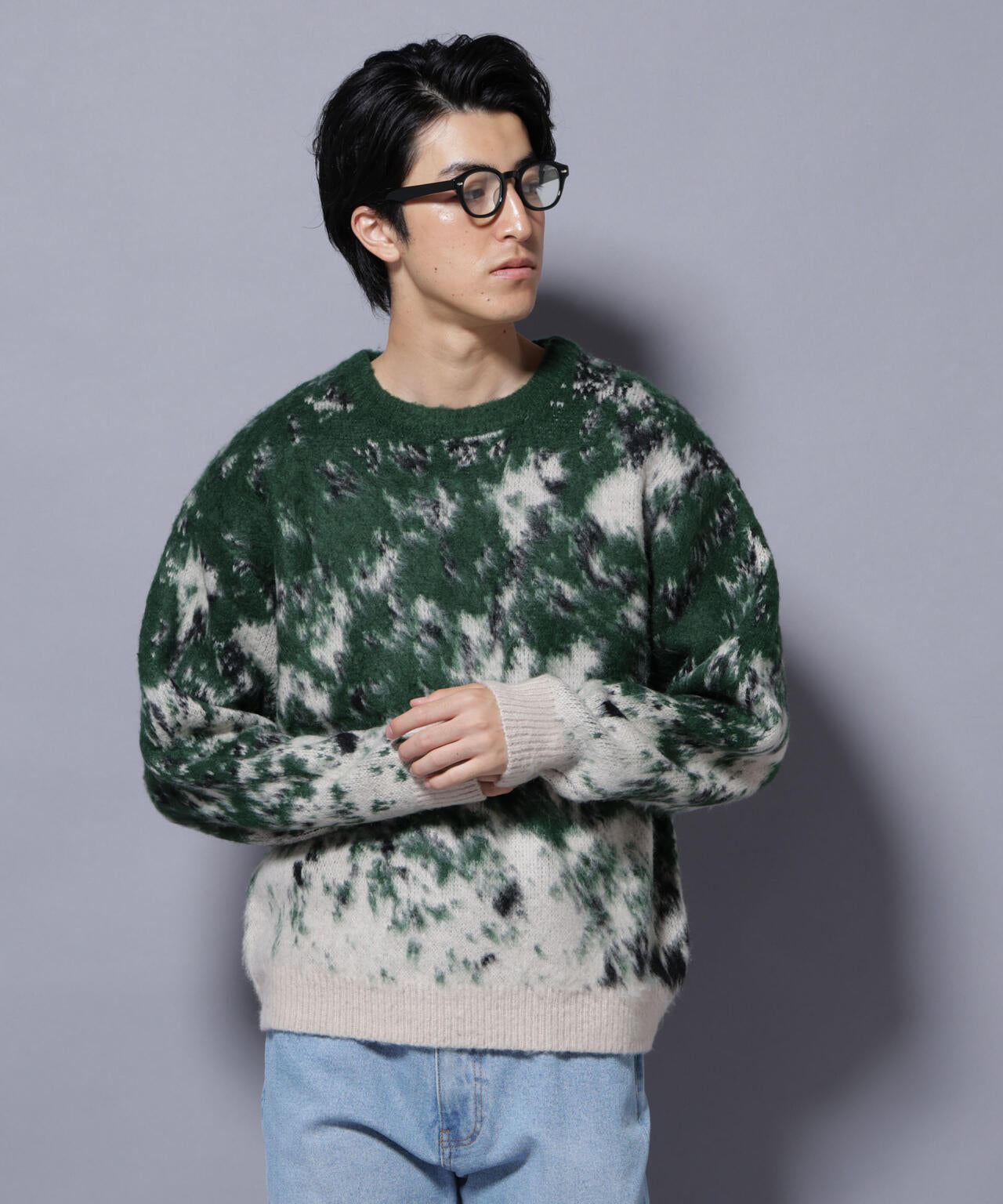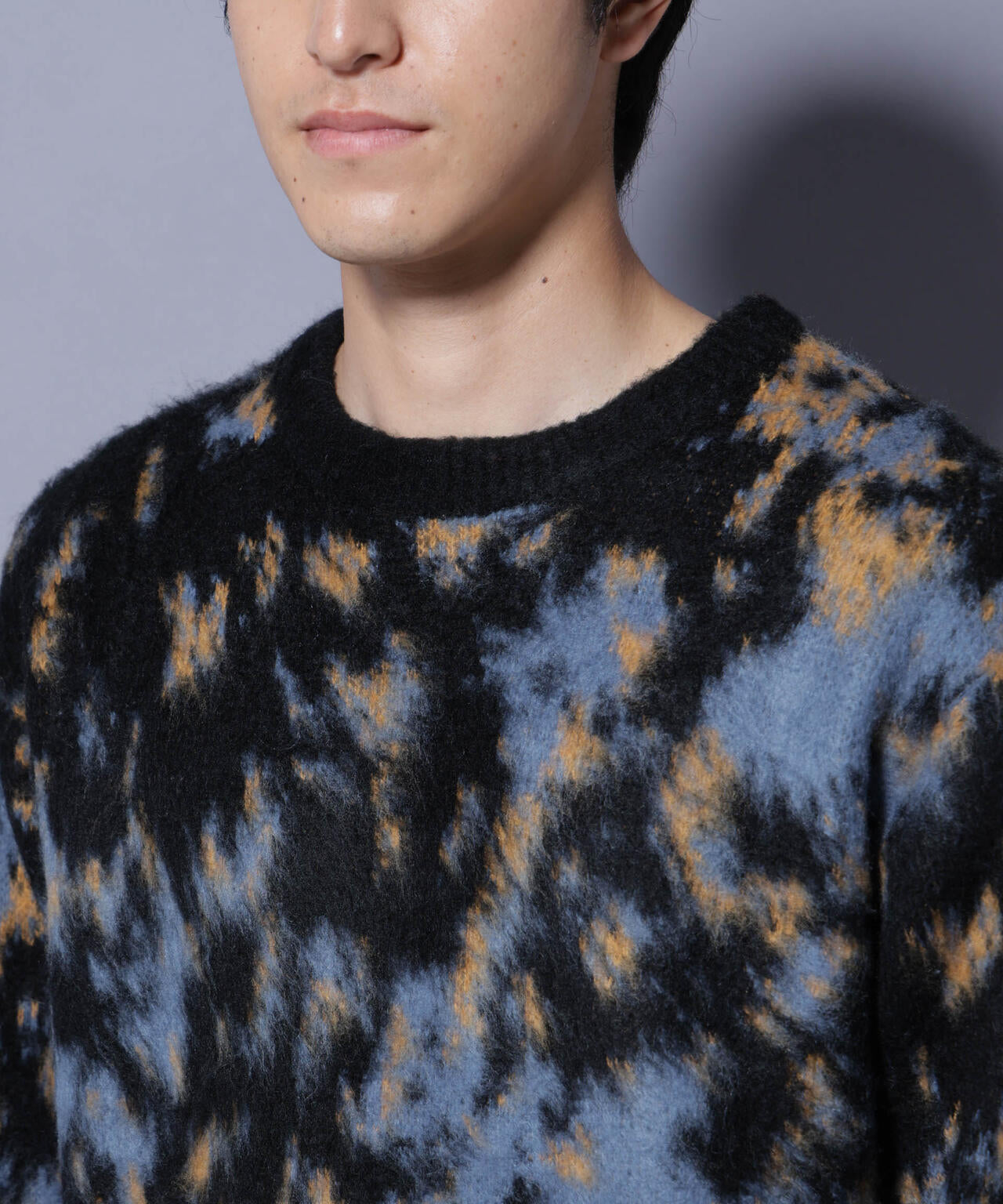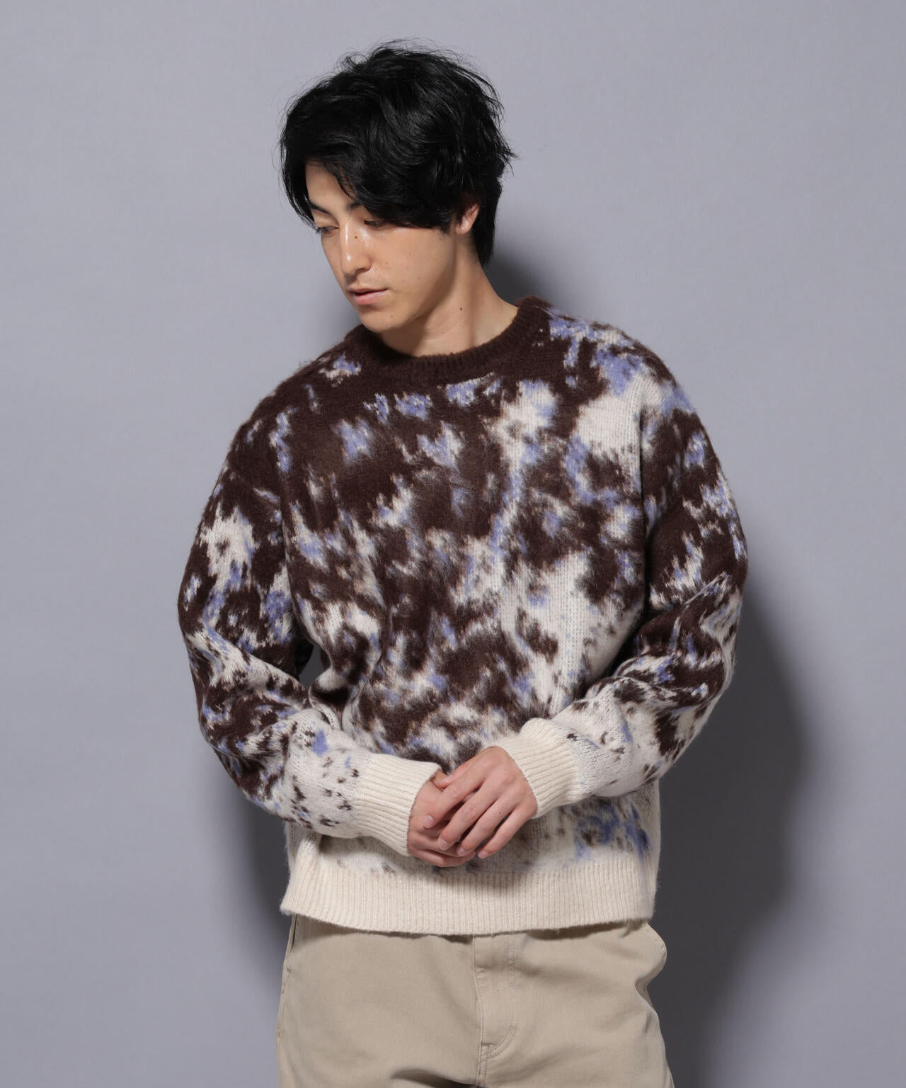 毛足が長くウォーム感のある秋冬活躍の総柄ニット。キャンパスにペンキを無造作にまき散らしたようなデザインが、一枚でもインナーとしても様になる1着です。