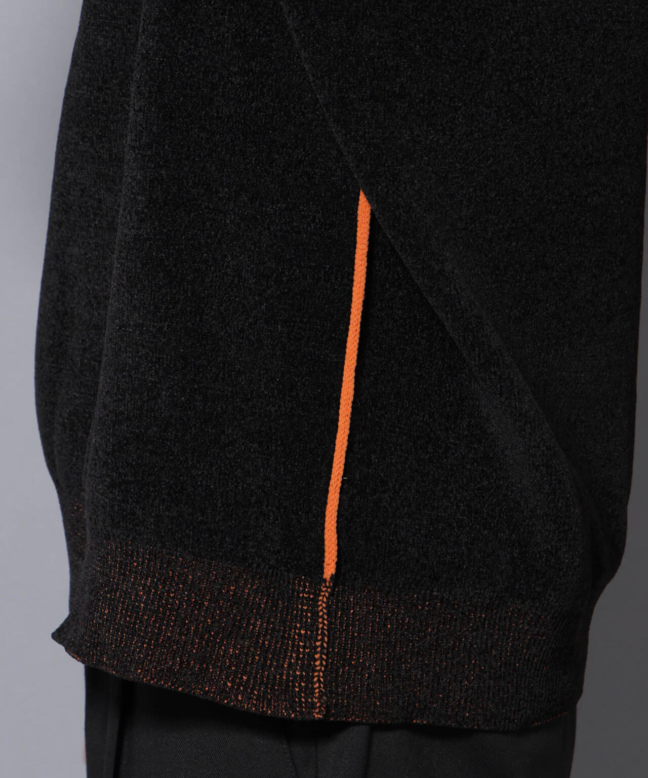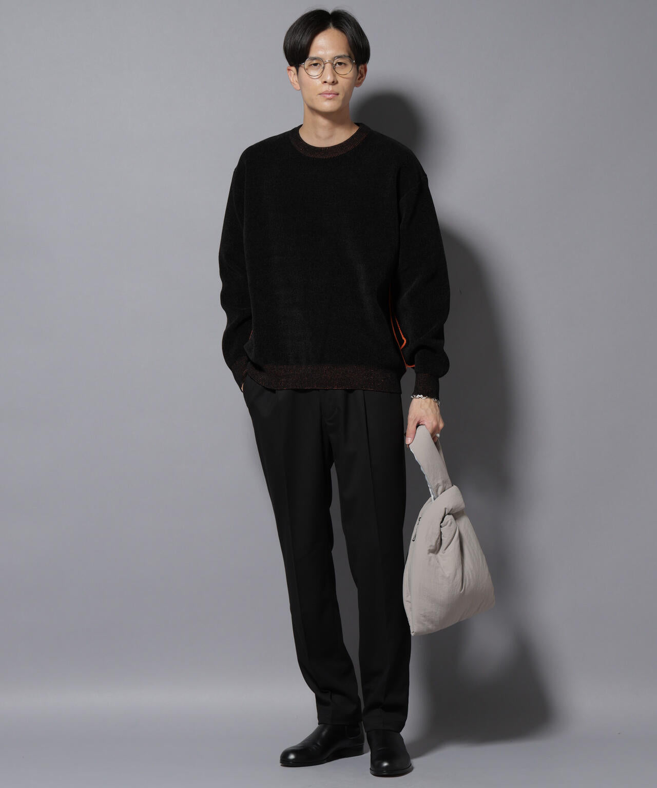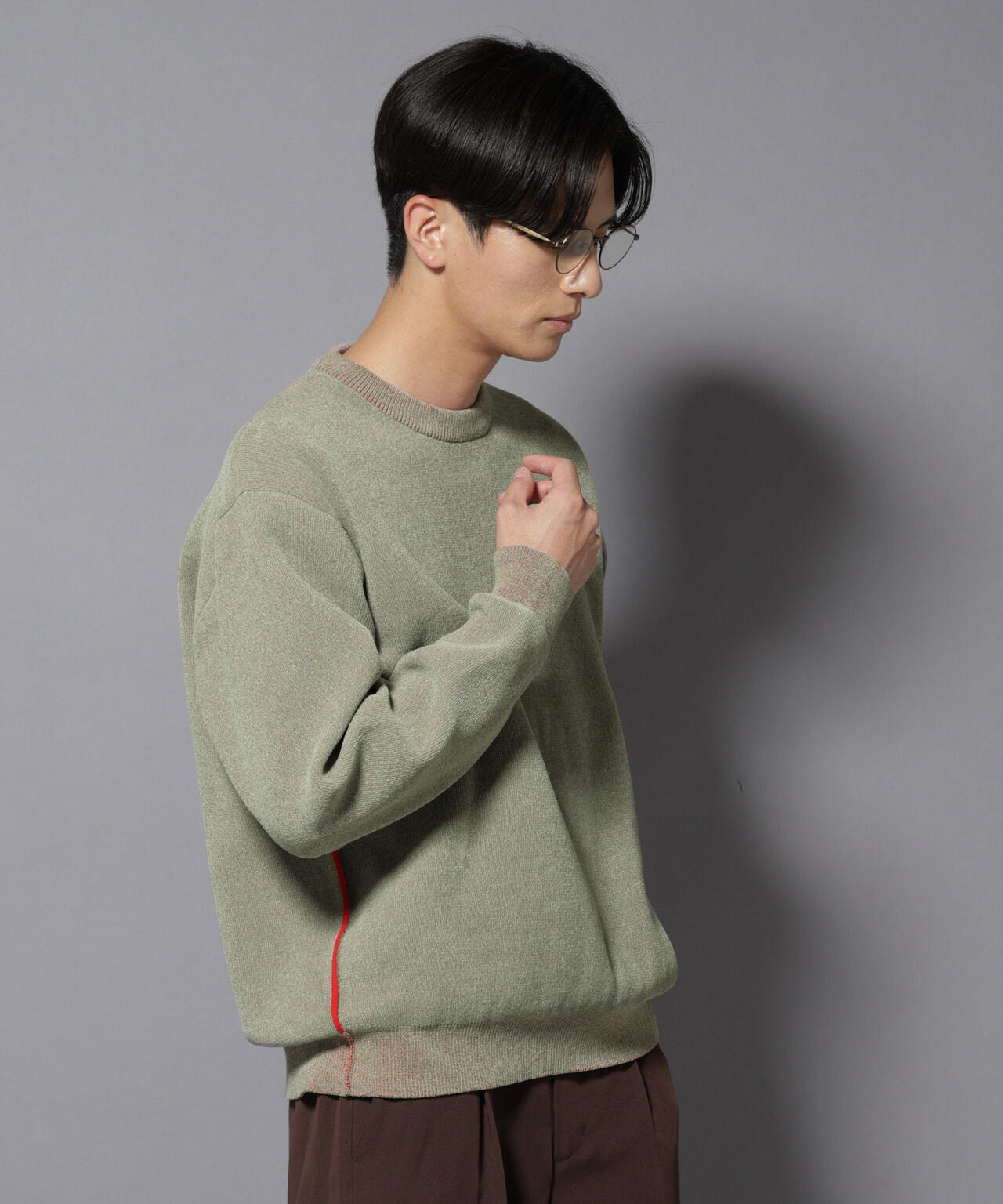 ウォーム感のあるモールヤーンを使用したクルーネックニット。裏糸にはポリエステルの糸を使用した組織で編みたてた一枚で、表と裏で2色使われた配色が面白いアイテムです。