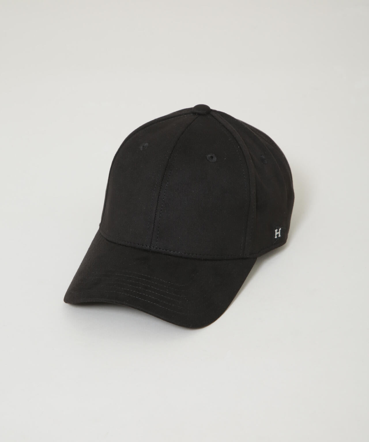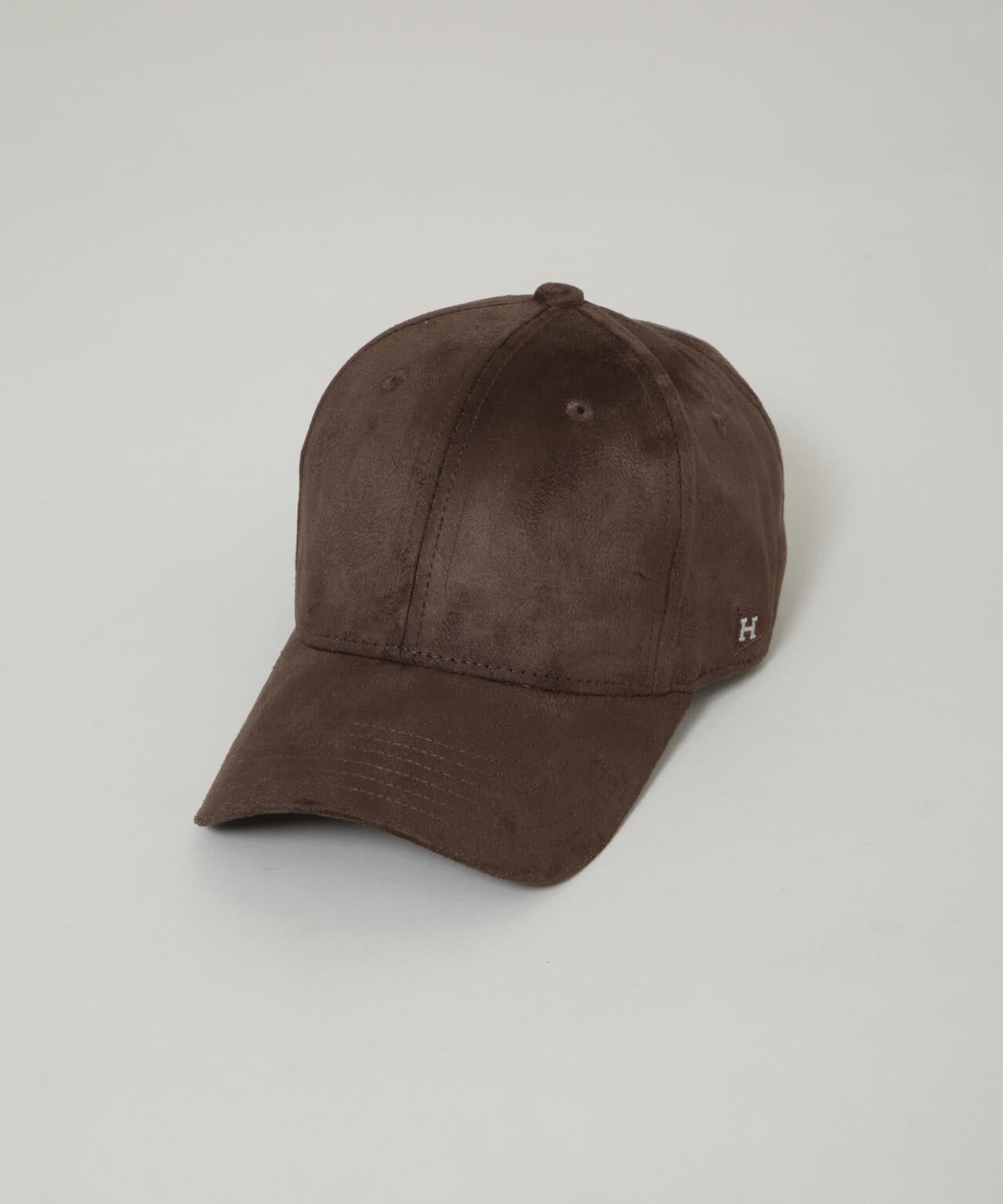 ペナント刺繍を施したフェイクスエードキャップ。キャップボディと同系色のペナントがアクセントを加えるアイテム。