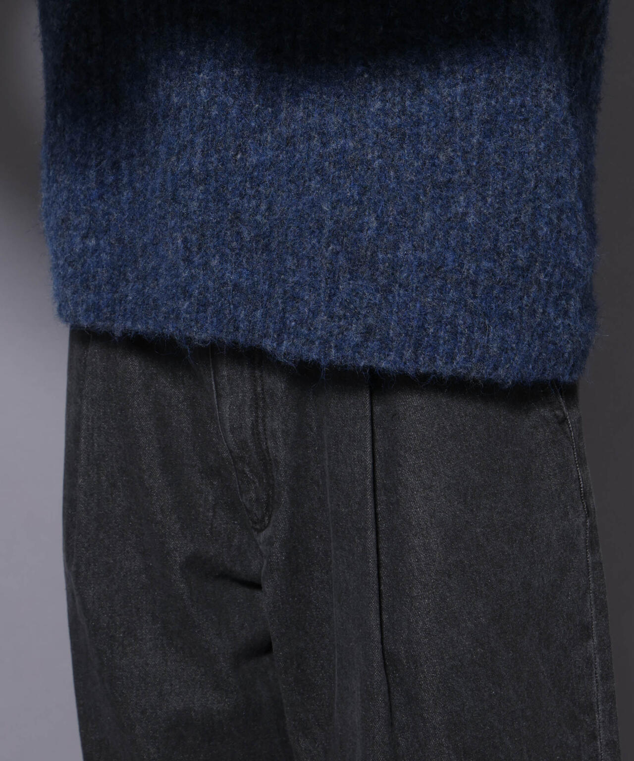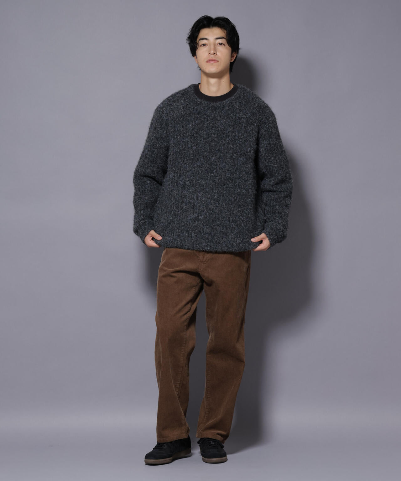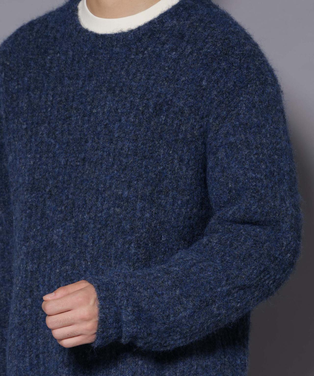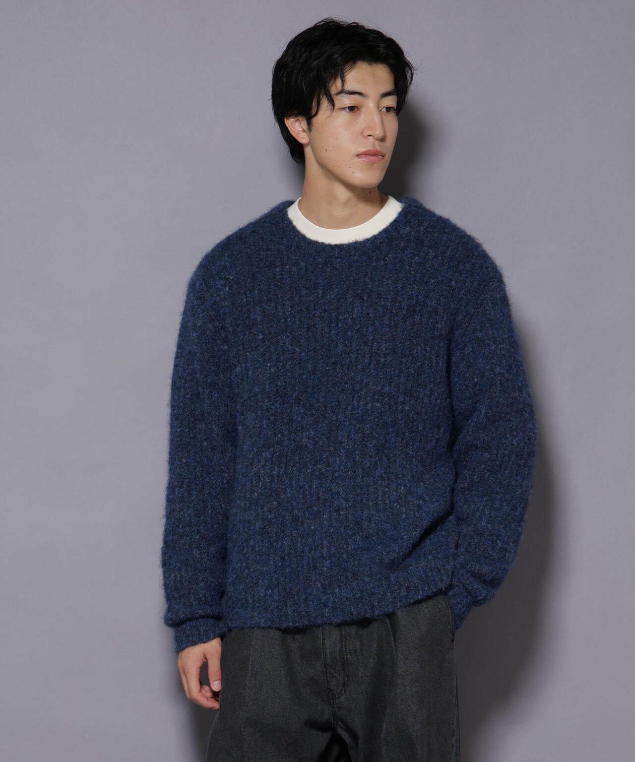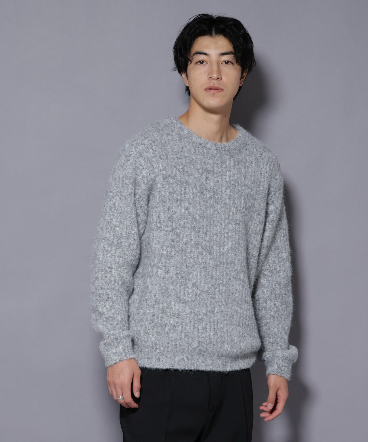ザックリとしたローゲージで編み立てたリラックスニット。毛足の長いフェザーヤーンを使用した、軽くて暖かいアイテムです。