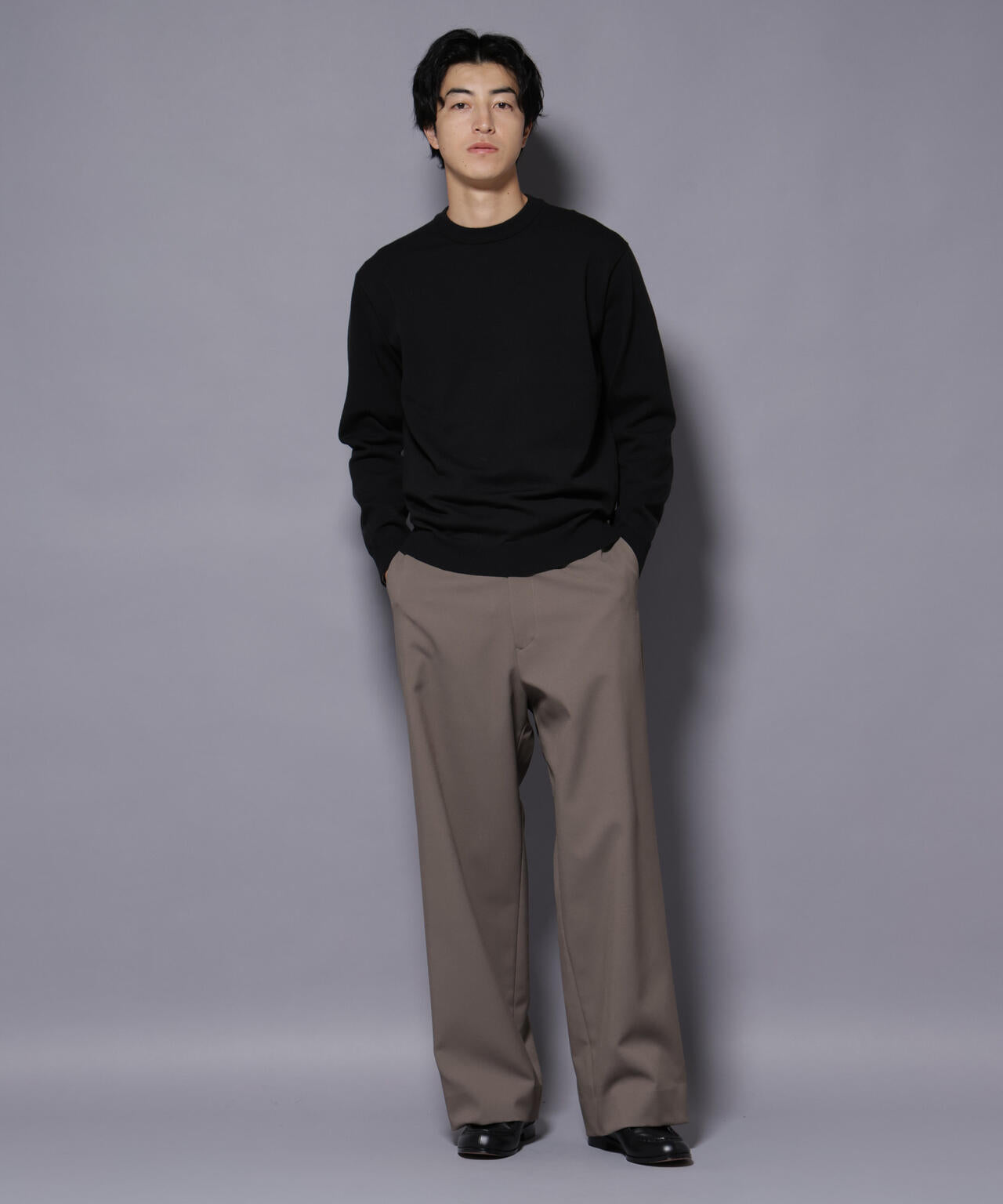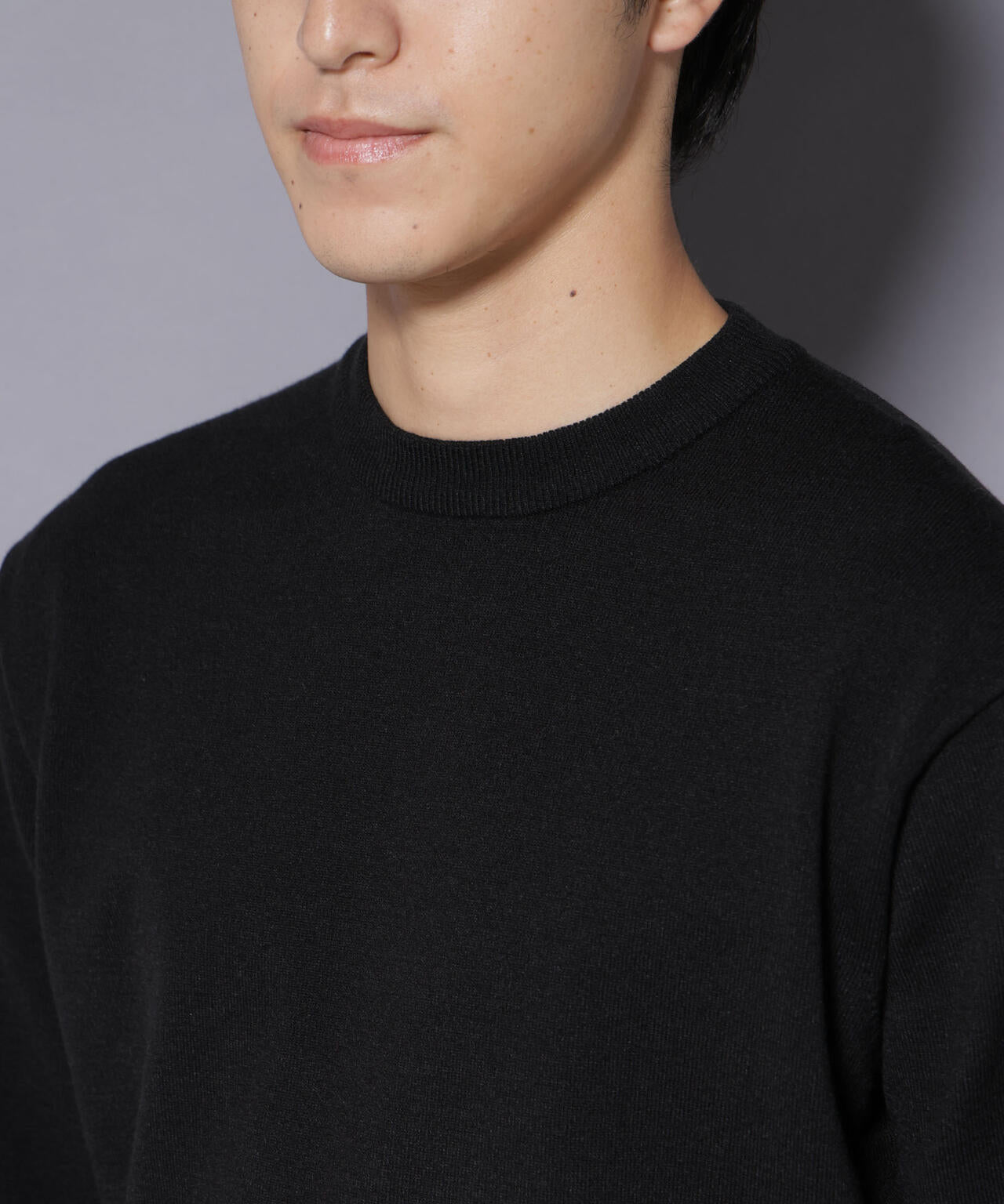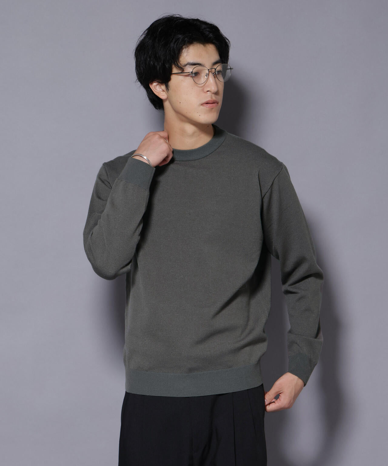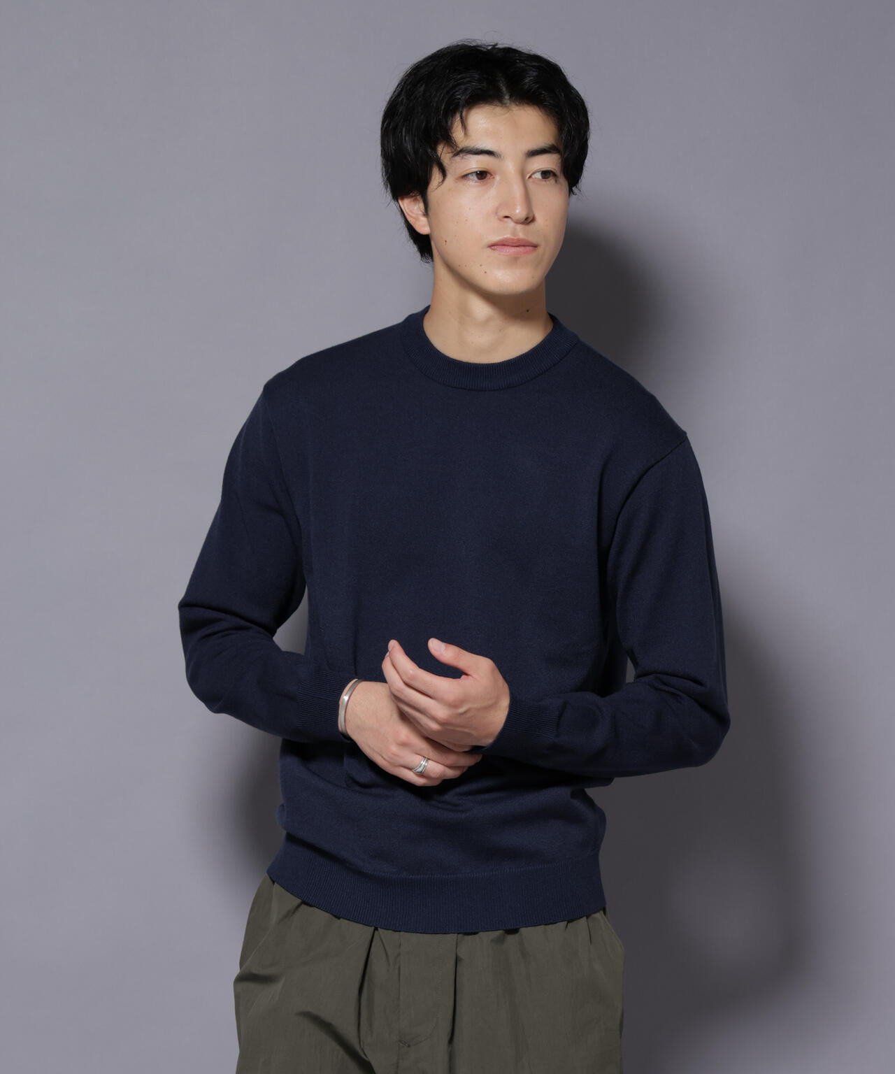 毛羽になりにくいスパン糸を使用し、裏側に微配色のプレーティング編みを施したデザインニット。シンプルなデザインで一枚でもインナーとしても活躍するアイテムです。