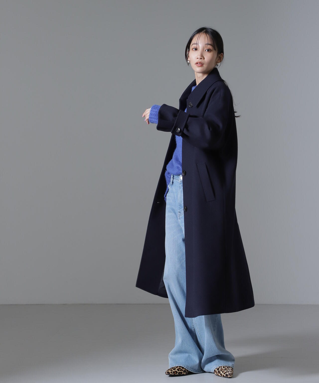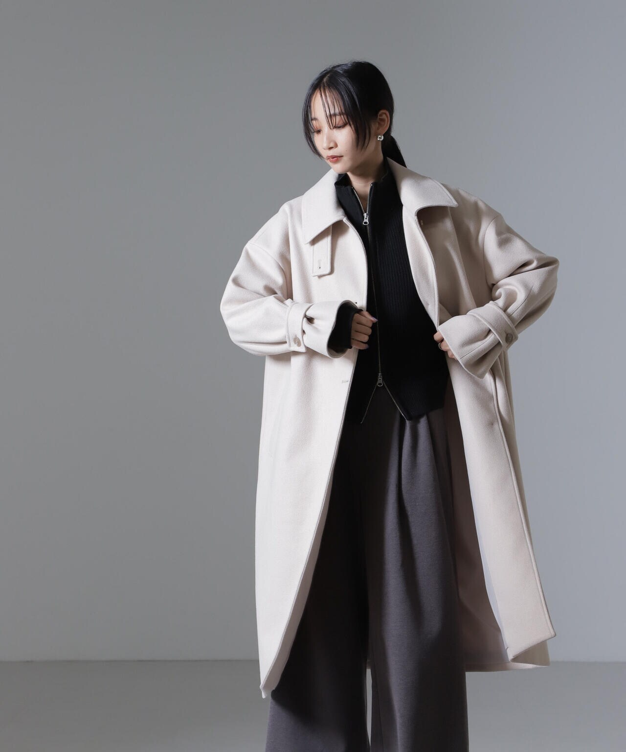 布帛ライクなウール見えのジャージー素材で仕立てた大人顔ロングコート。衿は釦を止めてスタンドカラー、釦を外してステンカラーの2wayで着こなしのアレンジが可能。程よいワイドシルエットで厚手のニットの上にも羽織りやすく、ON/OFFで重宝する逸品です。