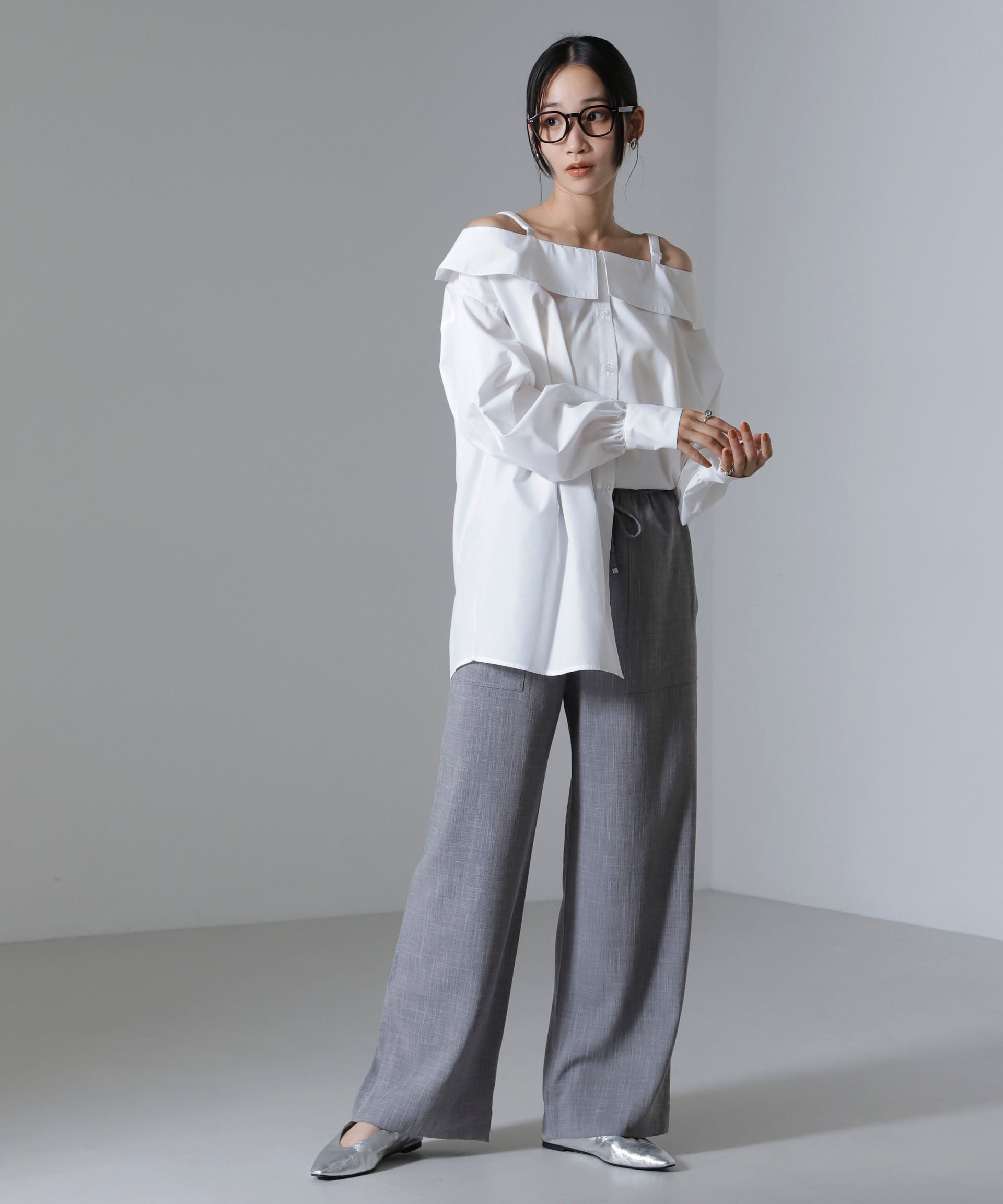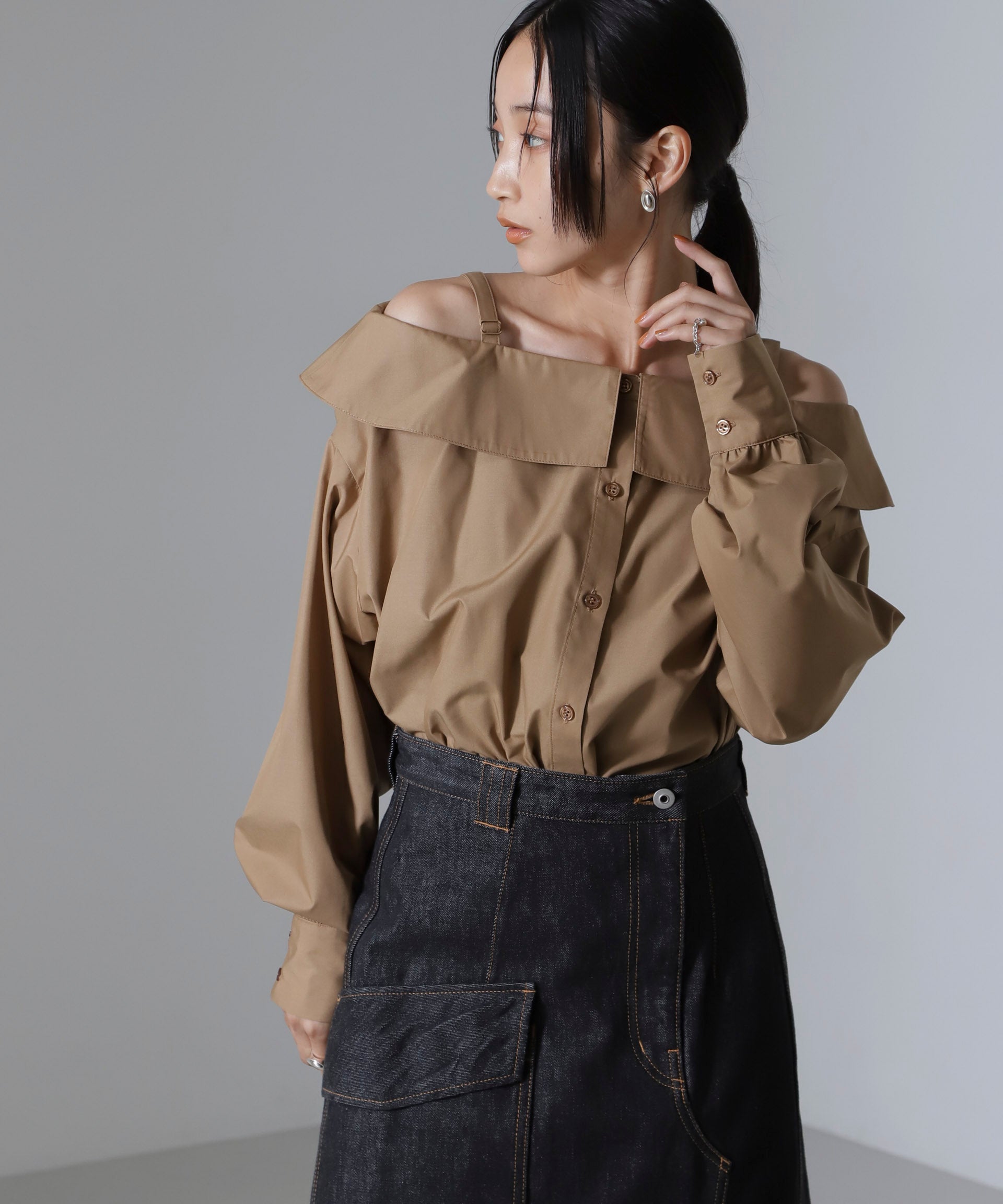 ・シャツ×オフショルダーの新鮮な組み合わせのデザインがポイント