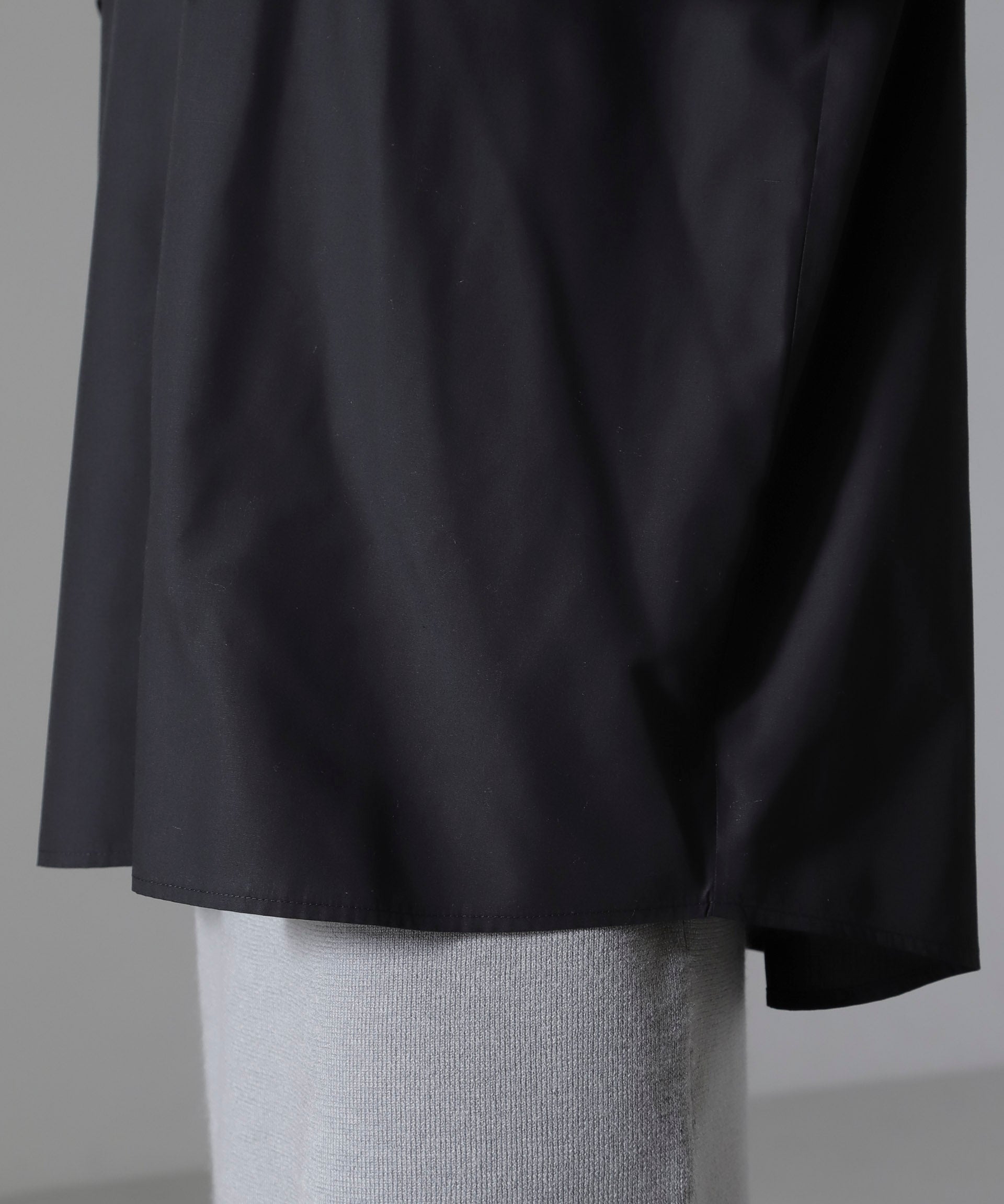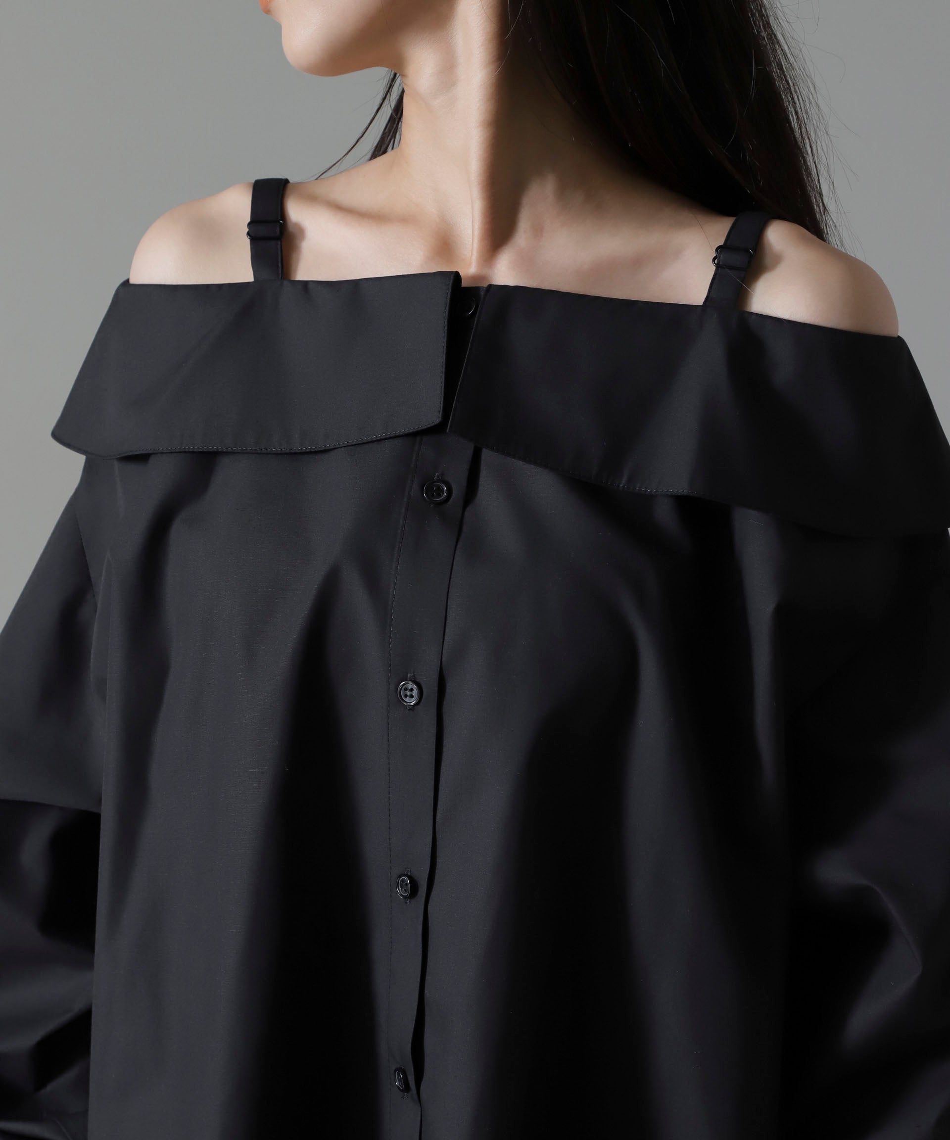 シャツ×オフショルダーの新鮮な組み合わせのデザインがポイント