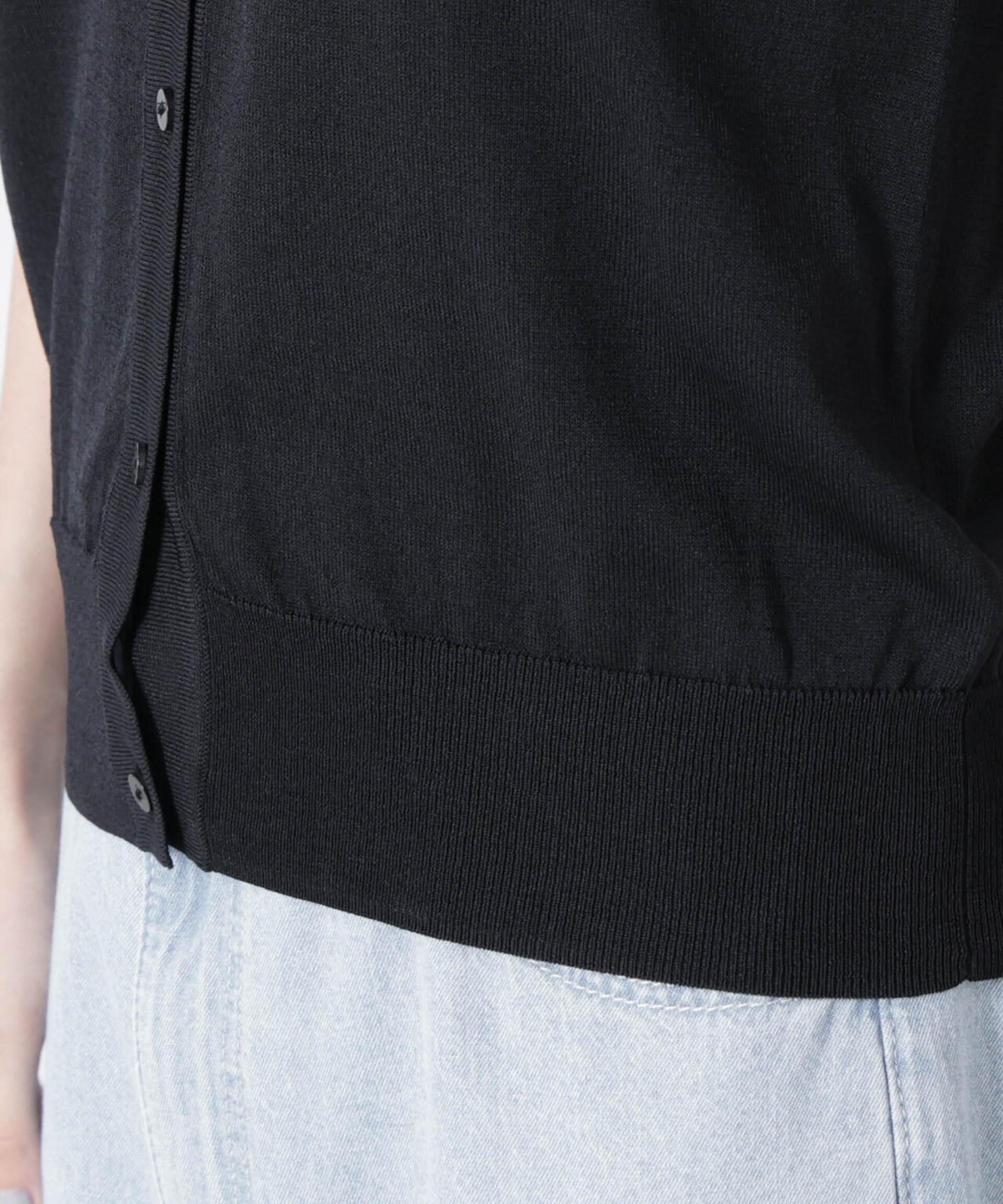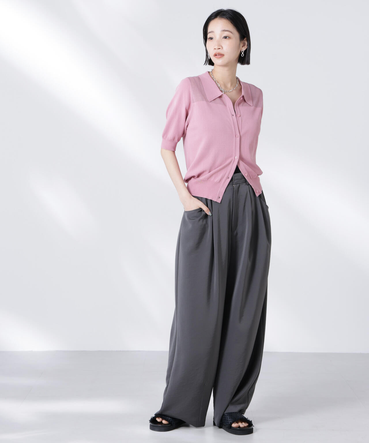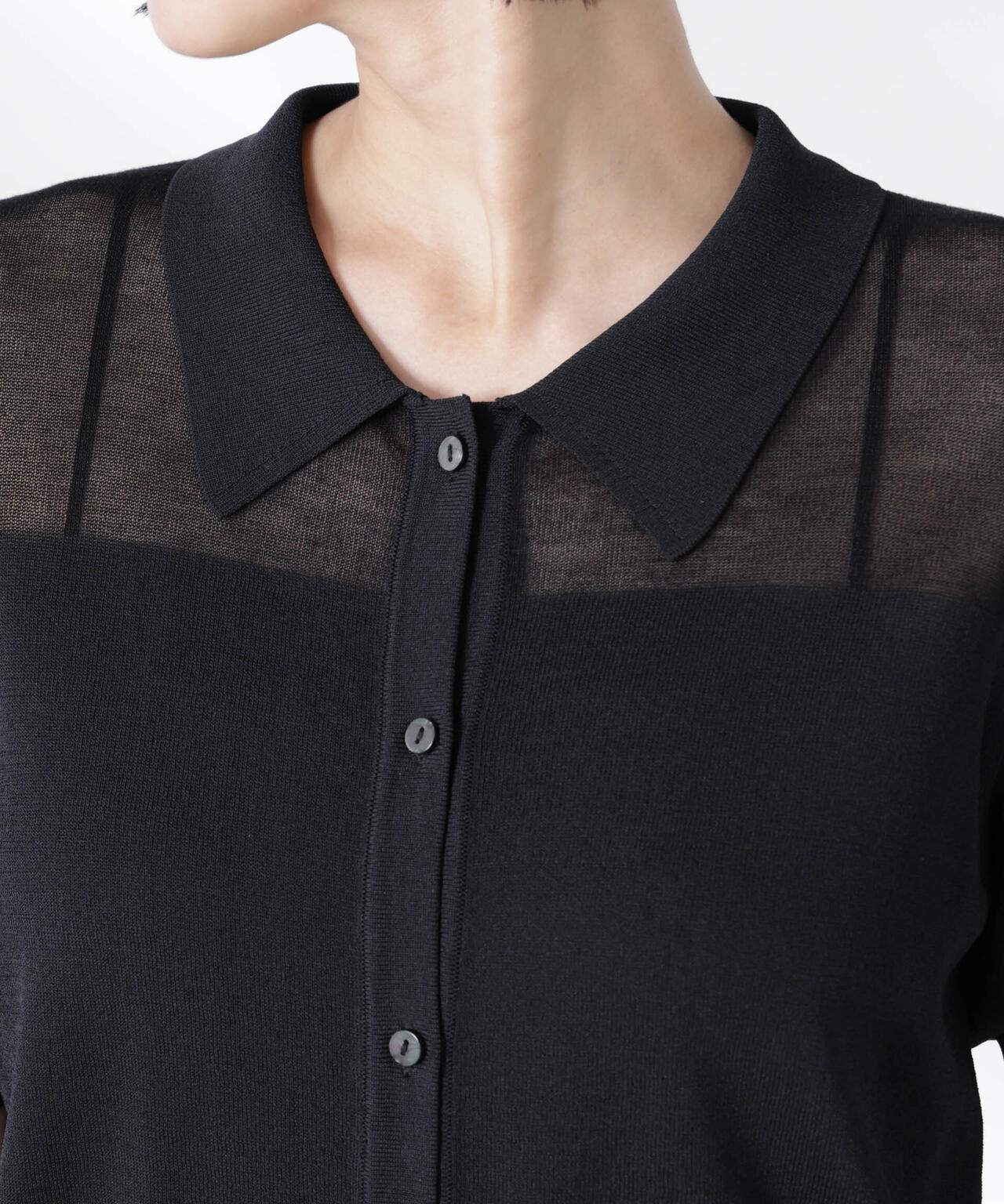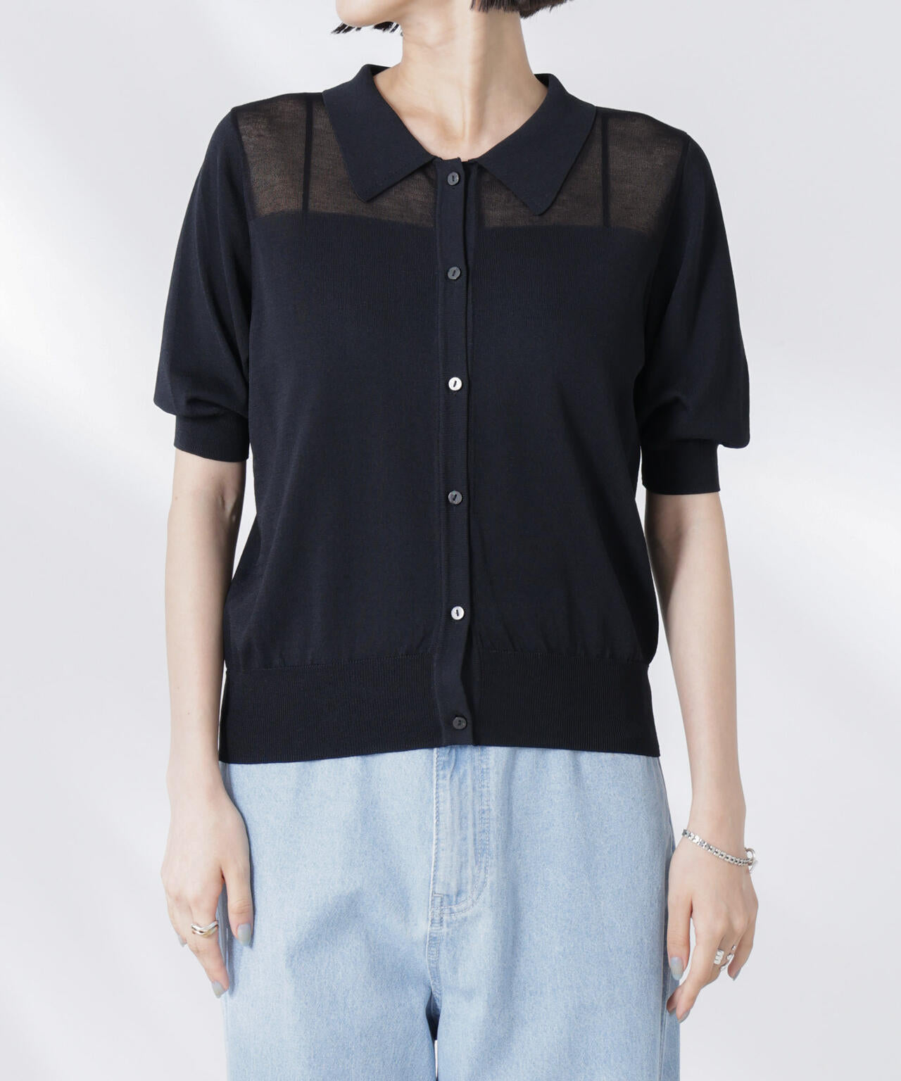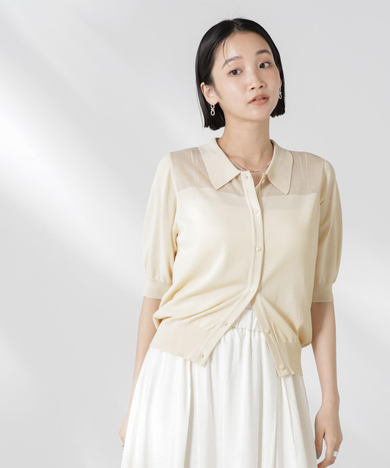 シンプルなルックスで上品さも兼ね備えたサマーニット。トレンド感のある衿付きとシアーな素材感が今年らしい一着。釦の開き具合で着こなしに変化を付けるスタイルがおすすめです。