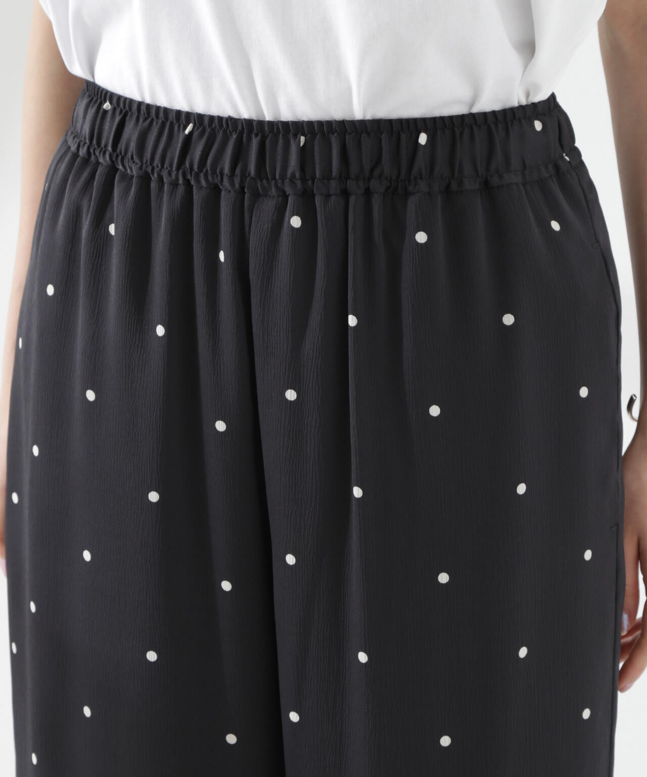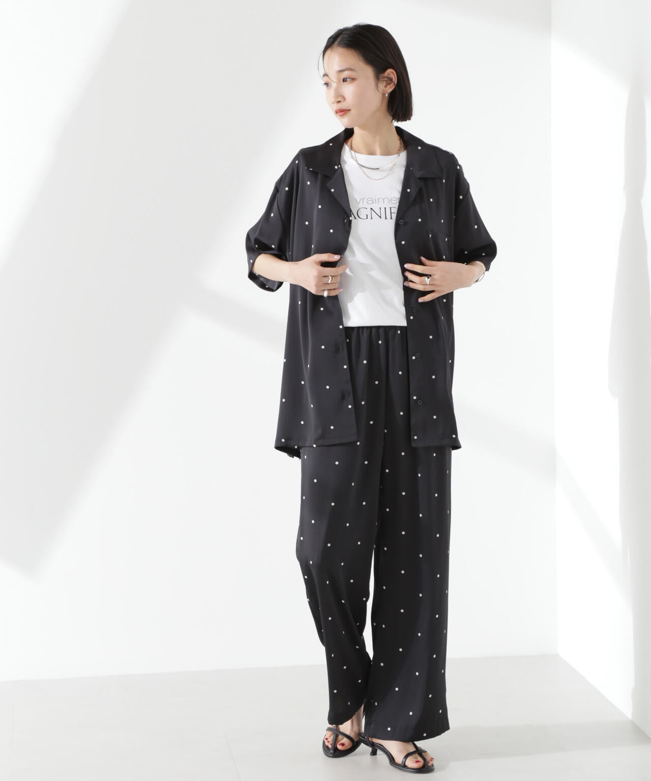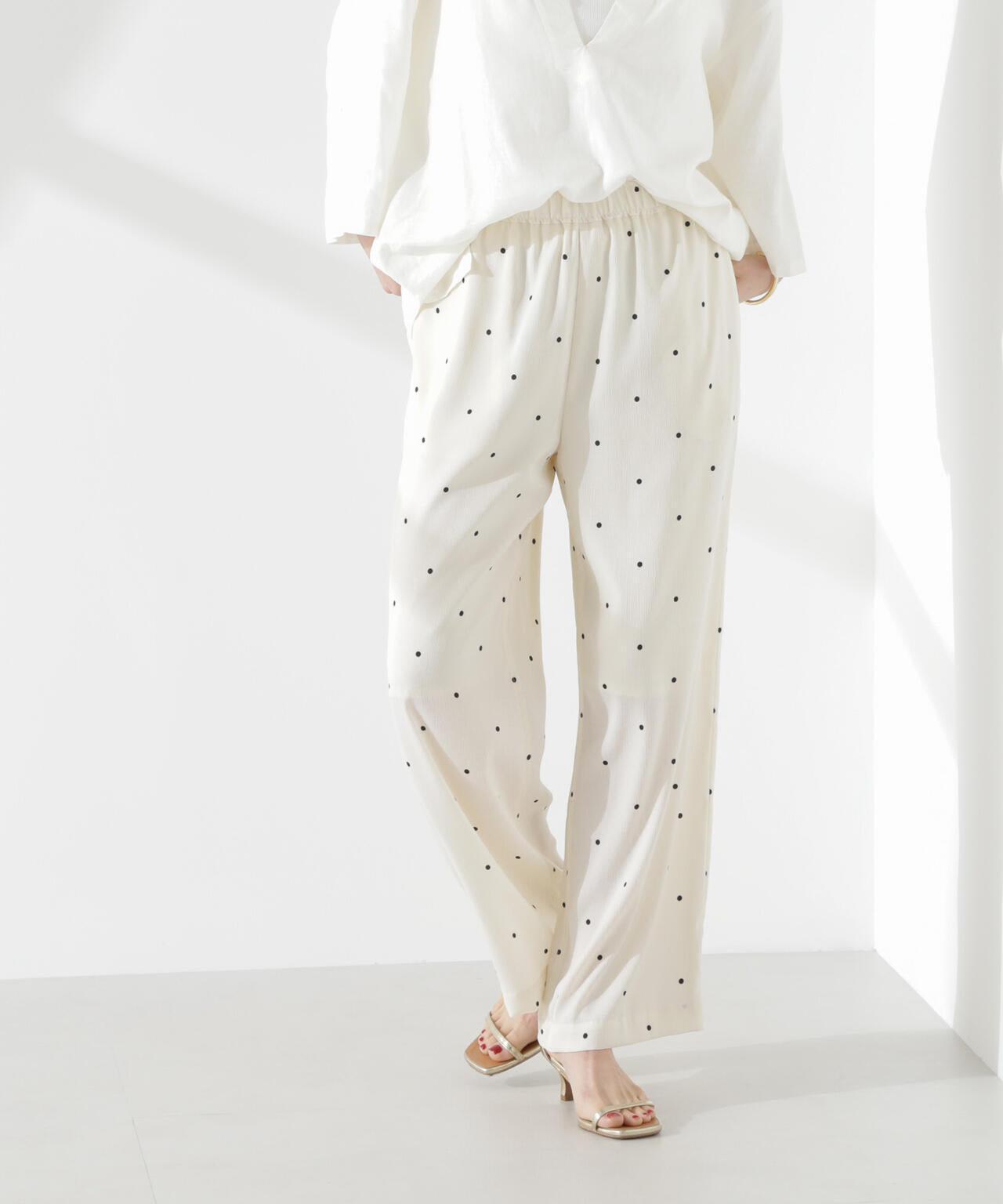 オリジナルのドット柄プリントが目をひくイージーパンツ。カジュアルでフェミニンさのあるドット柄と、ワイドストレートのシルエットが大人っぽいバランス。同素材のブラウスと合わせたセットアップスタイルもおすすめです。