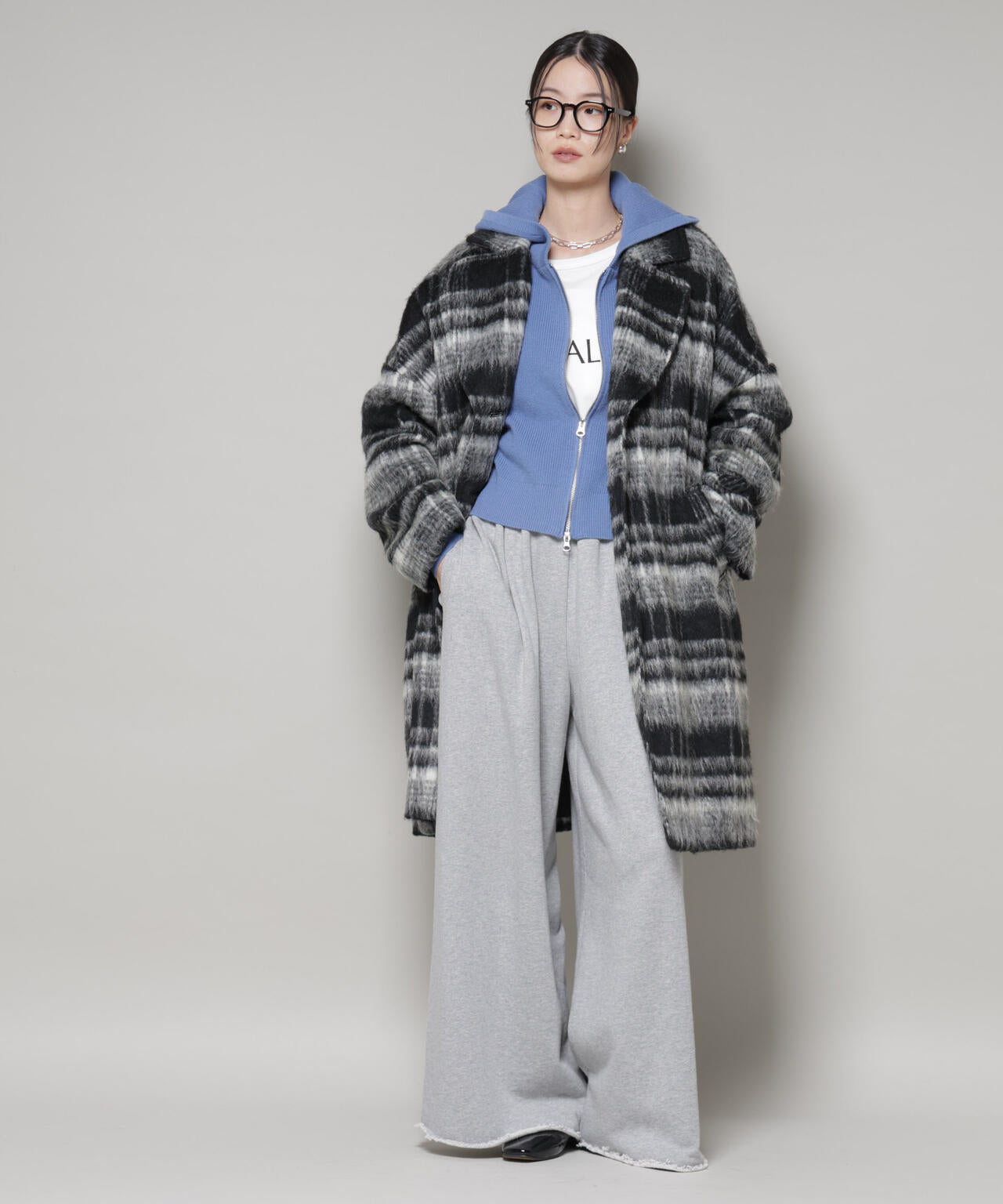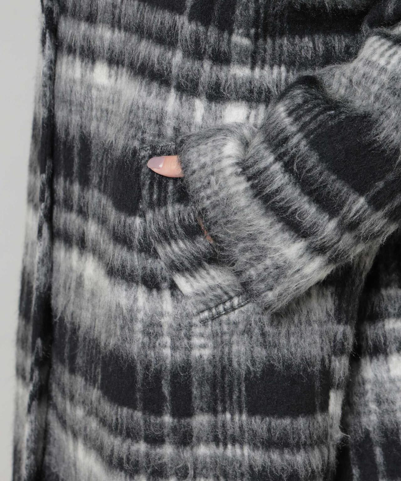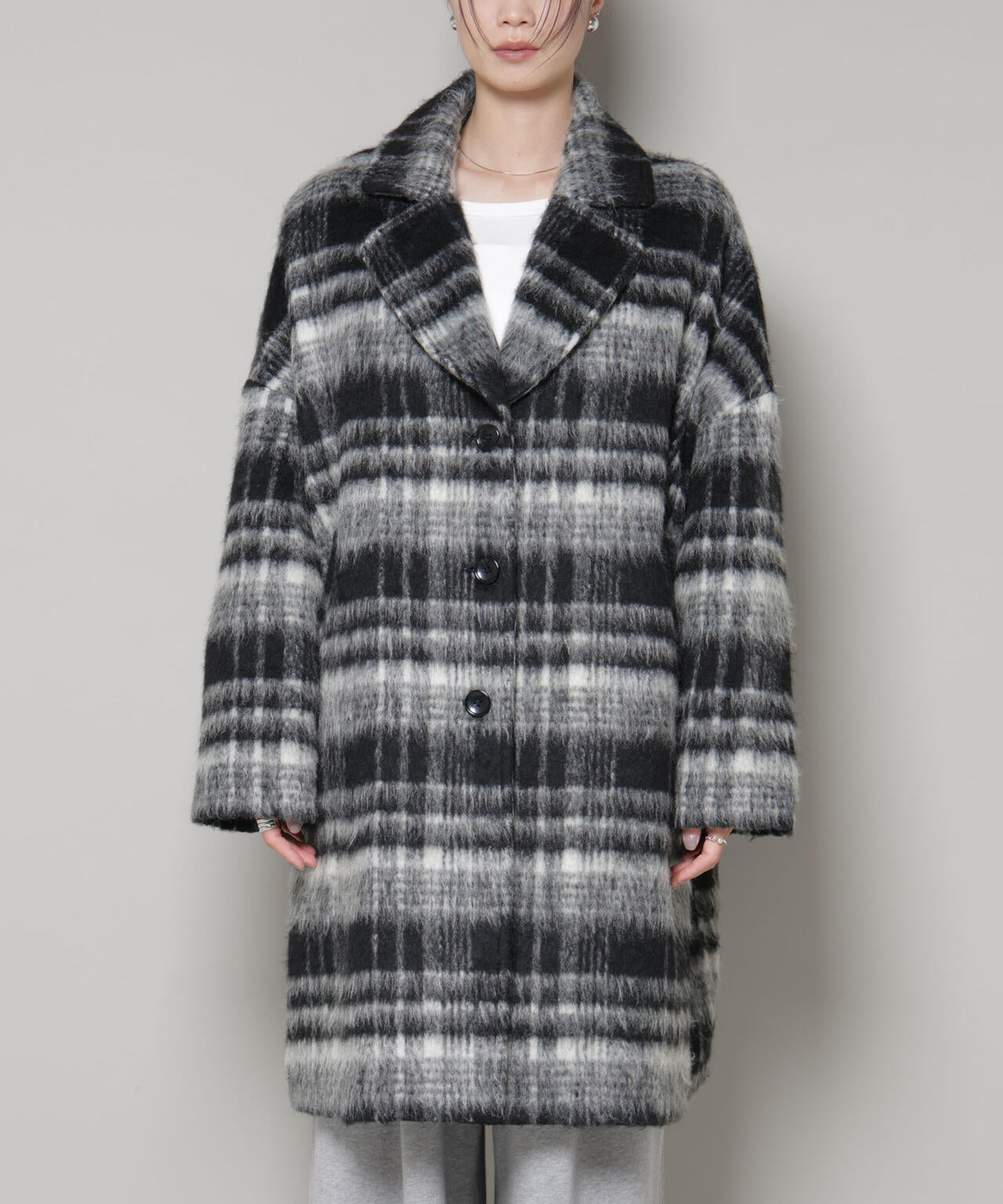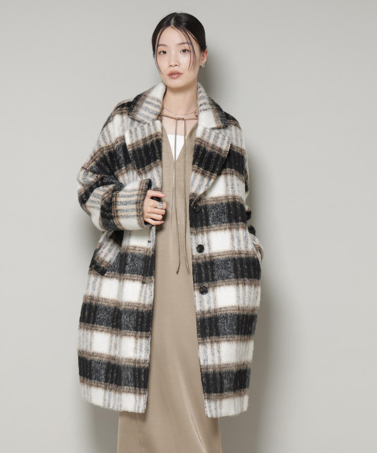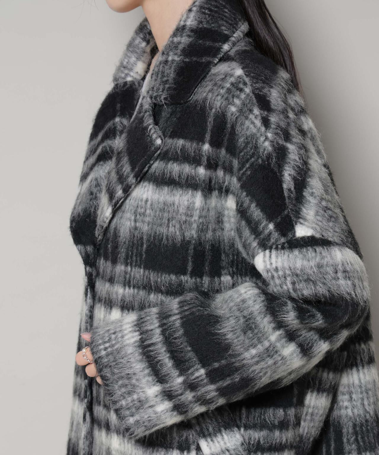 ヘアリーなシャギー素材と、存在感のある大判チェック柄が目を惹くワイドコート