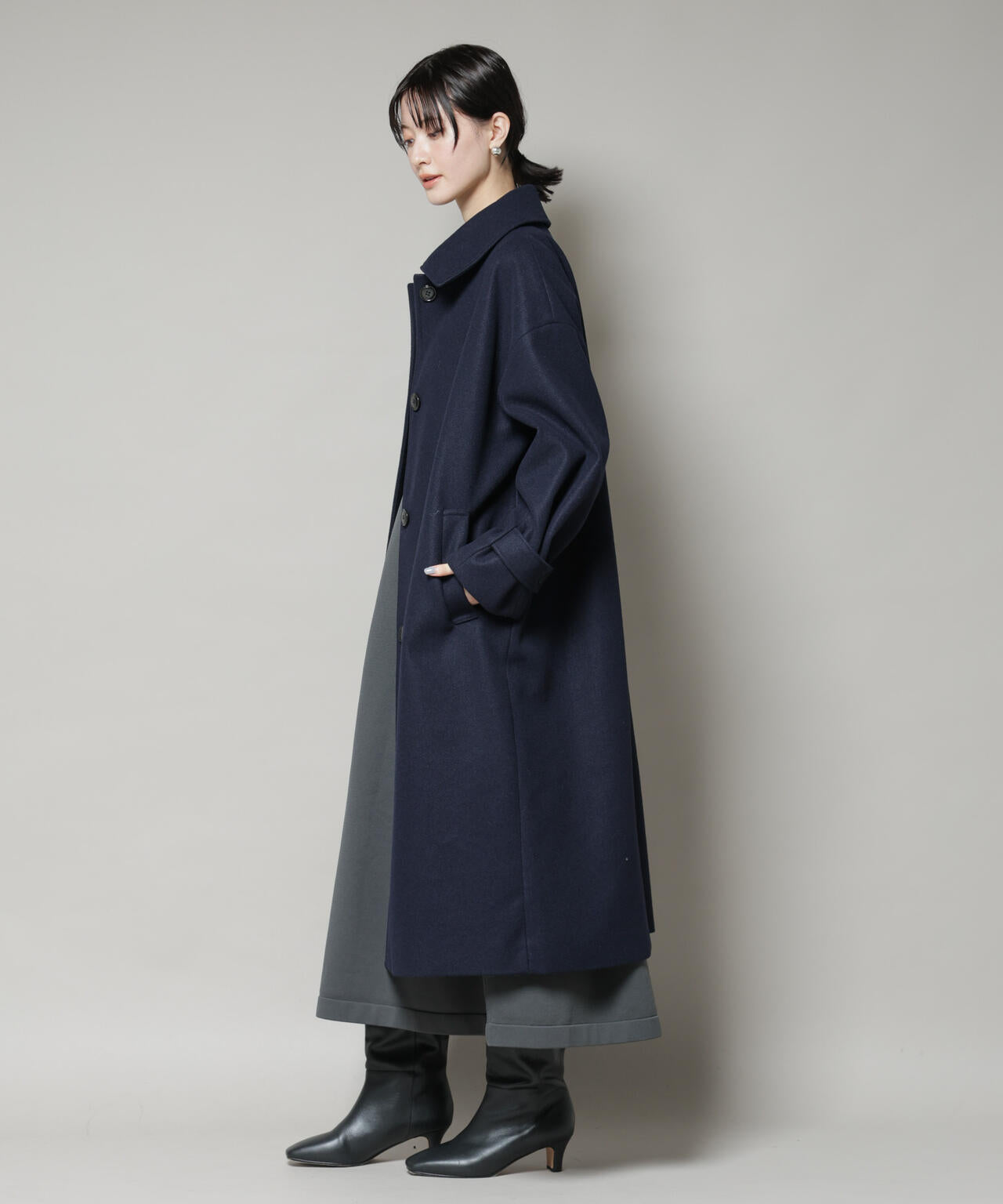 ・厚手のニットの上にも羽織りやすい程よいワイドシルエット