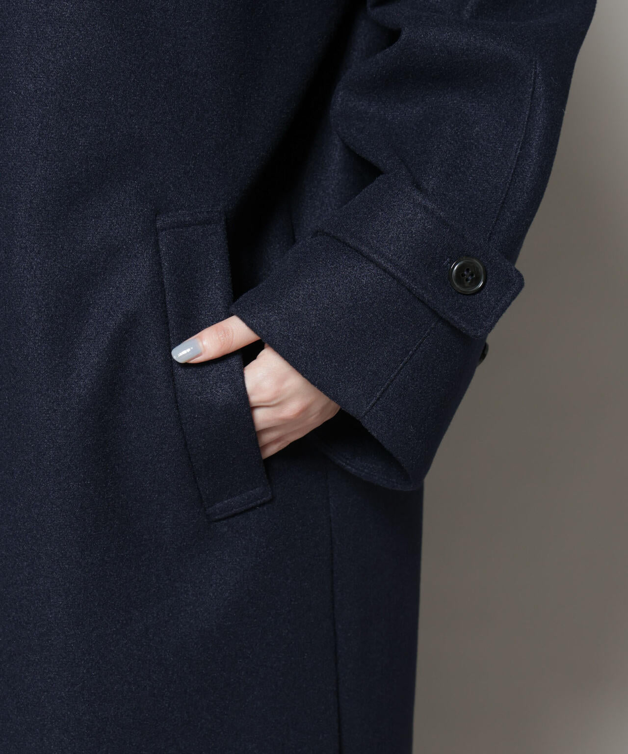 布帛ライクなウール見えのジャージー素材で仕立てた大人顔ロングコート。首元のタブを留めてハイネックとしても着用可能で、ニットやジャケット等、インナーを選ばず気軽に羽織れて秋冬に頼れる一着です。