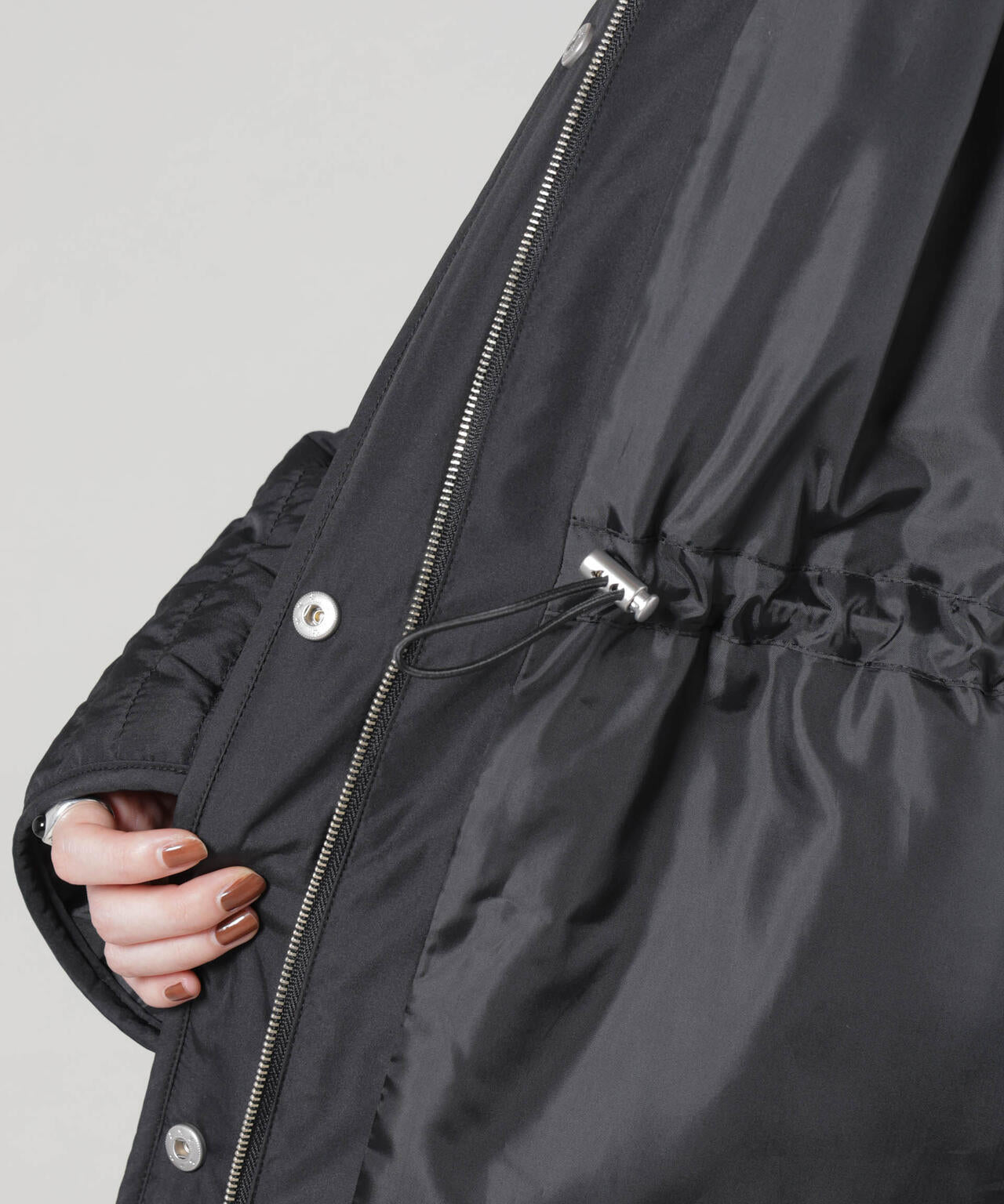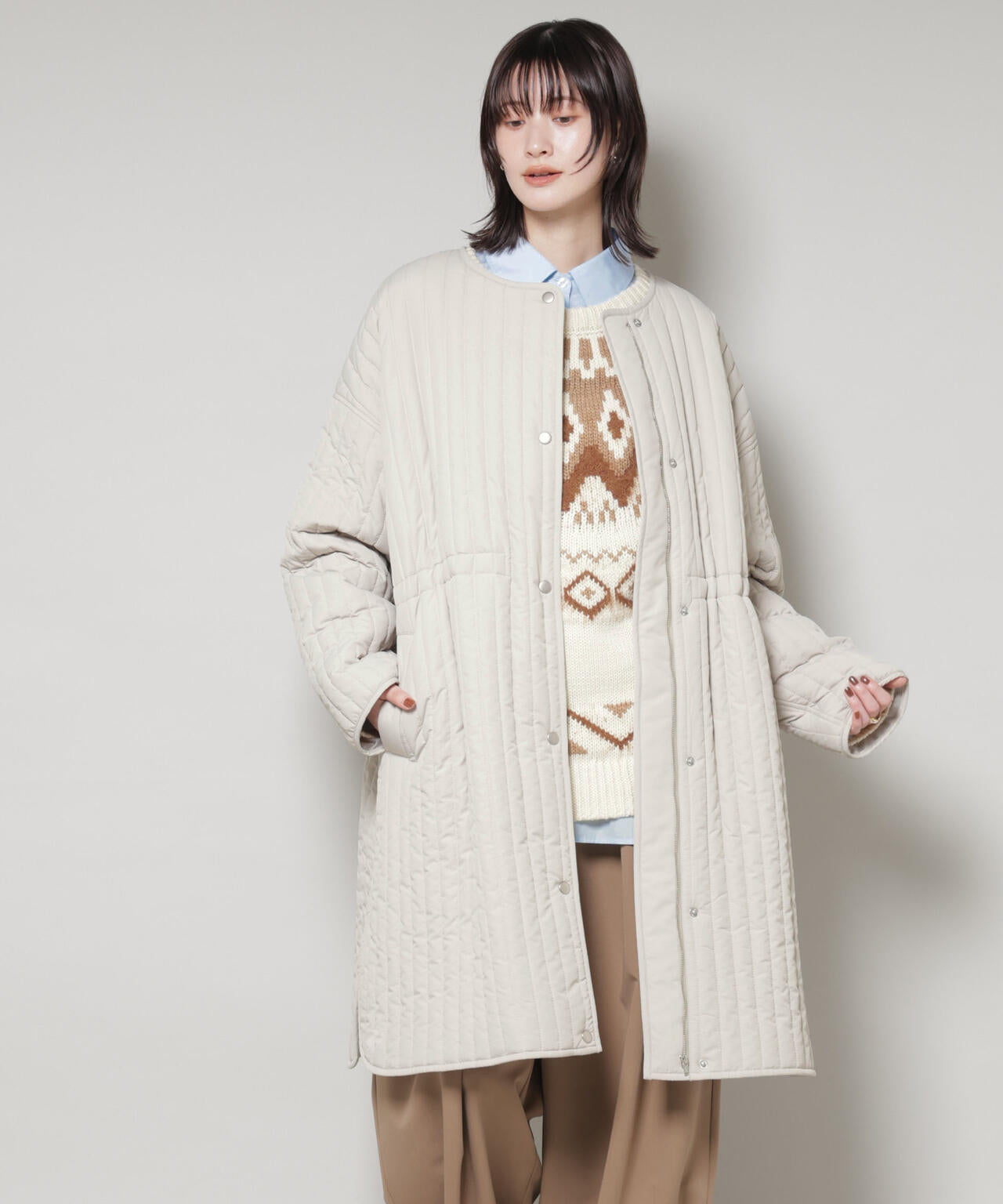 暖かな着心地の中綿ノーカラーコート。オーバーサイズながらも、縦ラインのステッチが全体をすっきり見せてくれるデザイン。マットな質感が上品さをプラスし、軽くて撥水機能も備えているため、デイリーからお出かけまで活躍する万能アウターです。