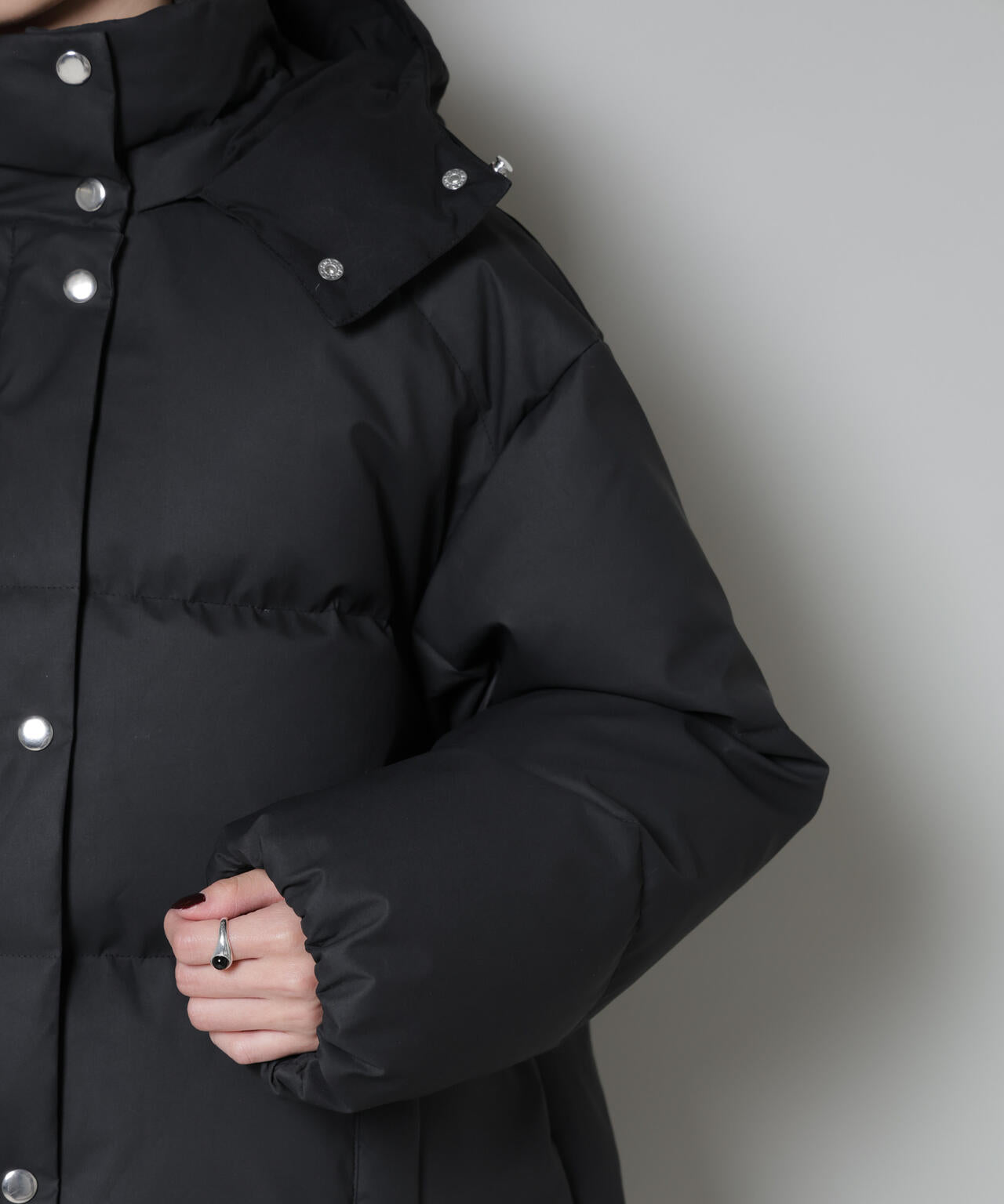 大人の女性らしさ引き立つAラインシルエットのミドル丈ダウンコート