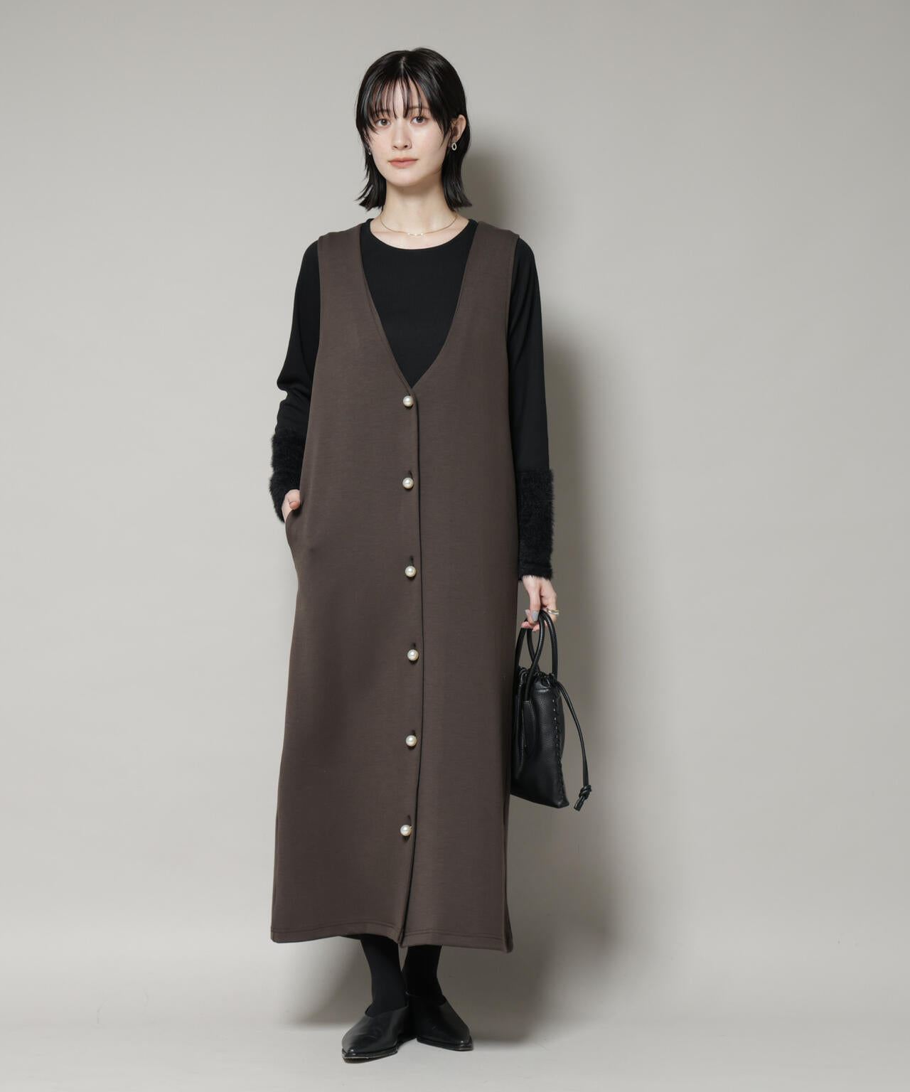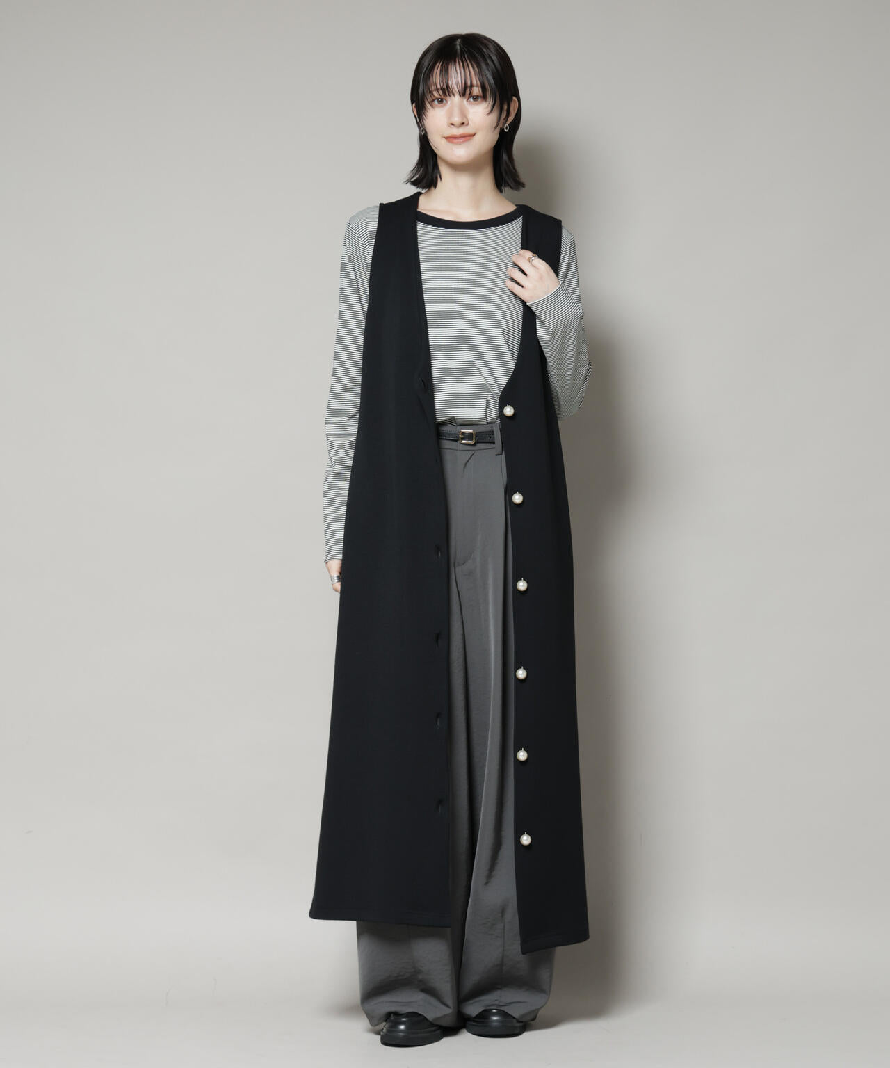 ジレワンピースの前を開けて、パンツスタイルに羽織っても素敵