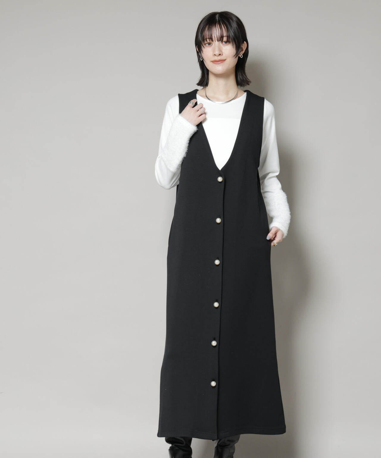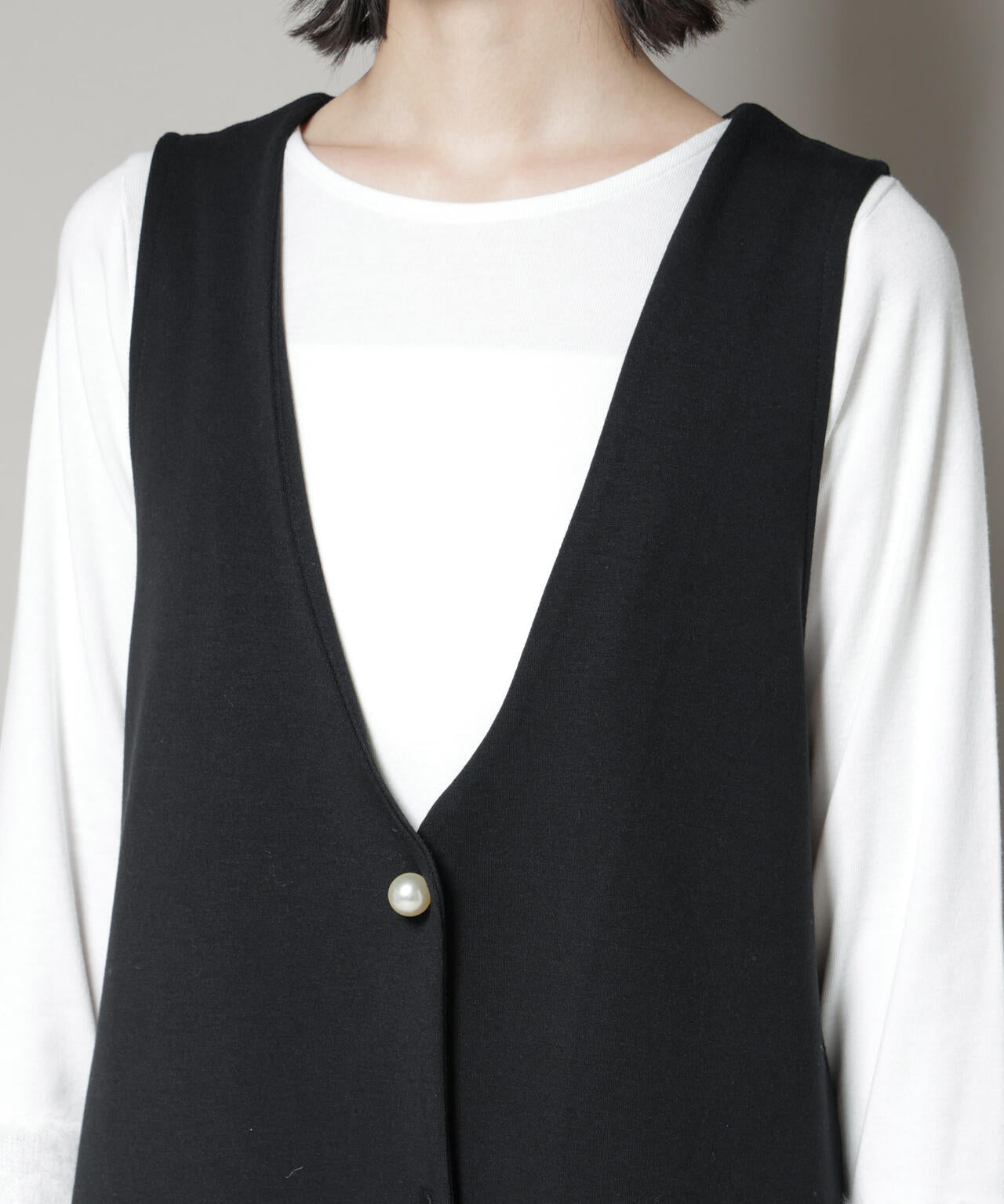 デザインカットソーとロングジレがセットになったアンサンブルワンピース。前を開けてジレとして、閉じてワンピースとして、それぞれ単品でも着回しが可能で幅広いコーディネートを楽しめるアイテムです。