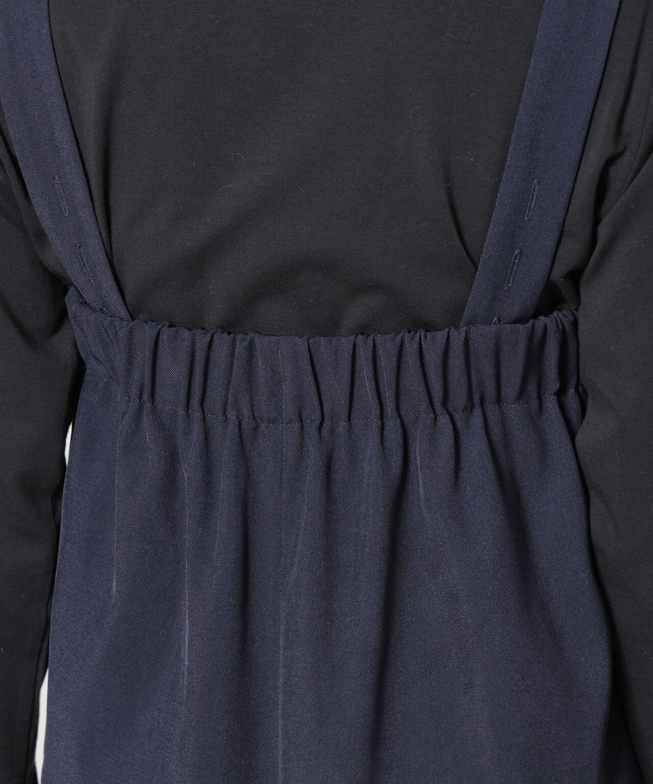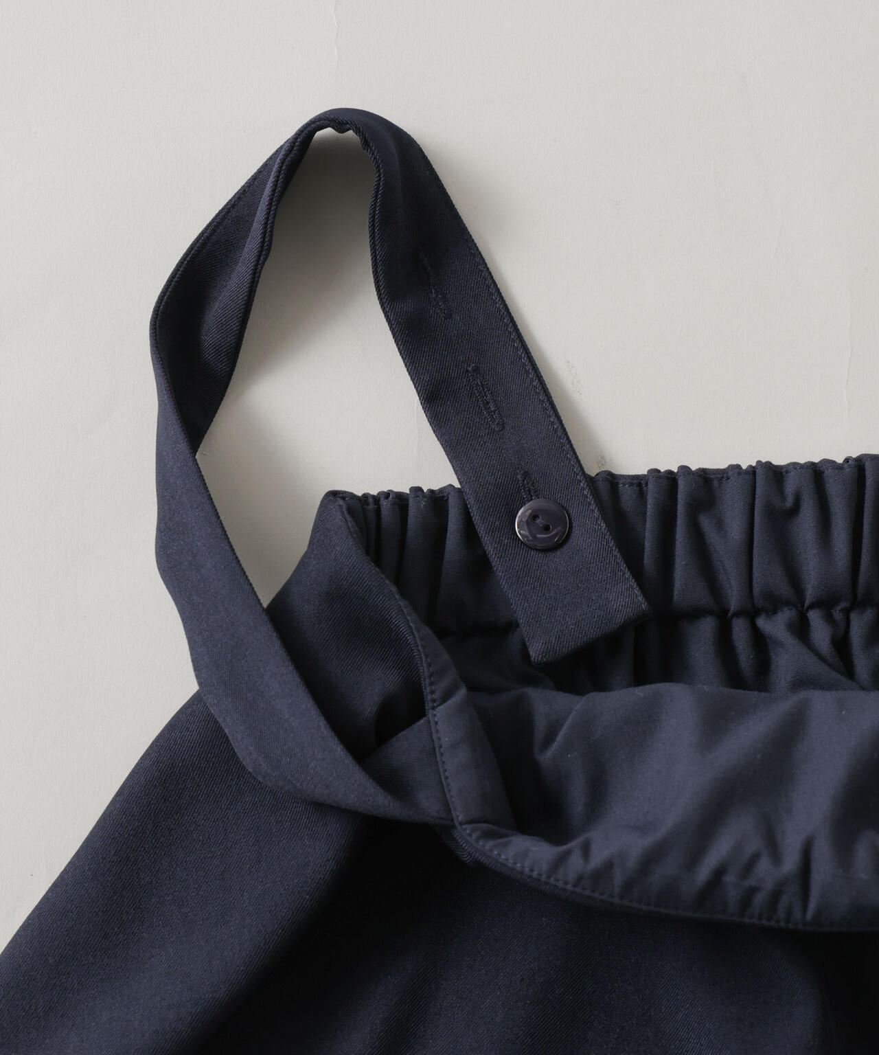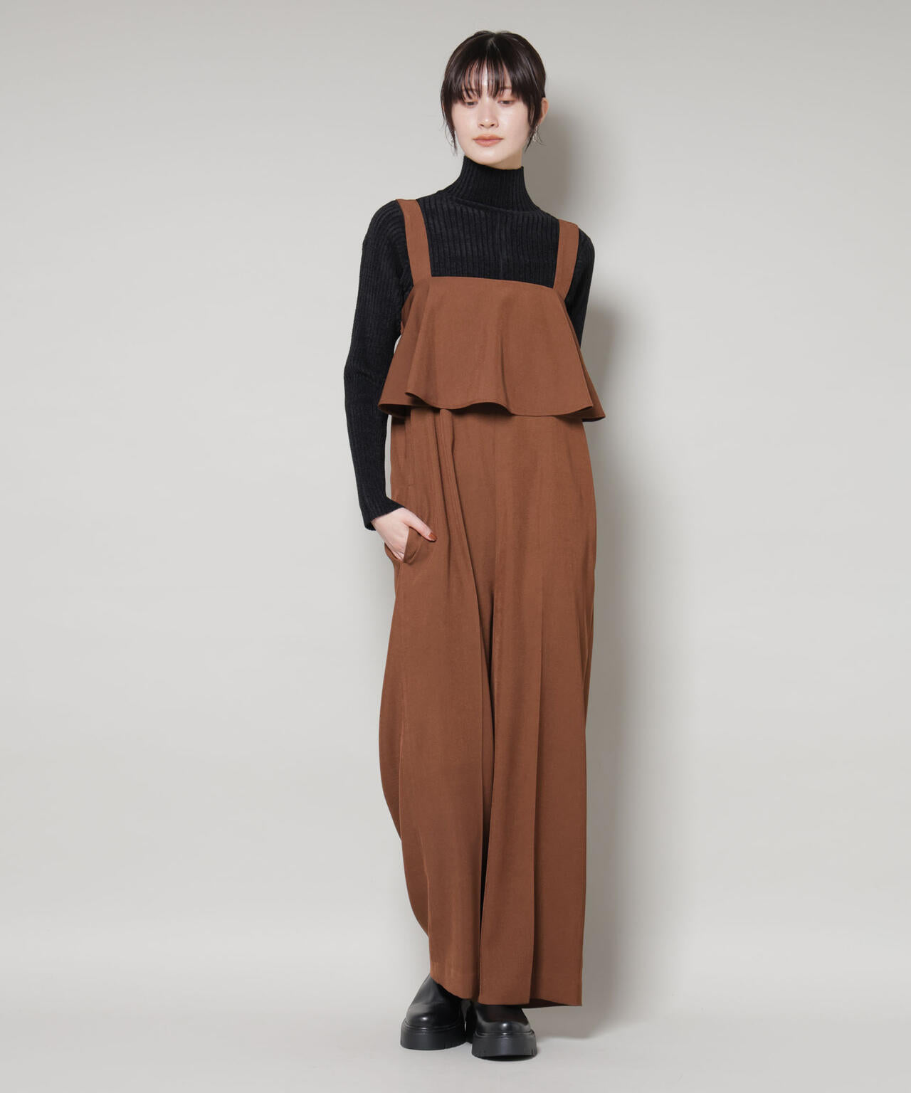 胸元のフリルデザインが女性らしいサロペットパンツ。身体のラインを拾わないややゆとりのあるシルエットで、リラックス感のある一着。インナーにリブニットやタートルトップス、上からカーディガンやジャケットを羽織ったりと、カジュアルから通勤まで幅広いスタイリングを楽しめます。