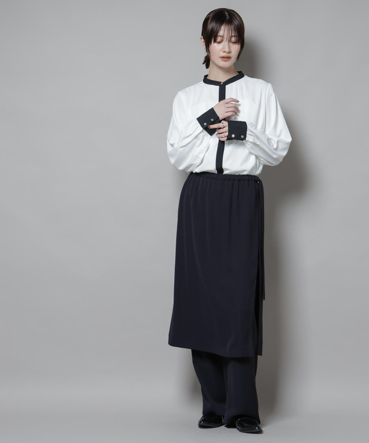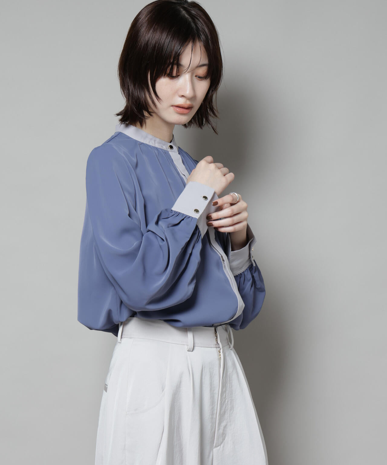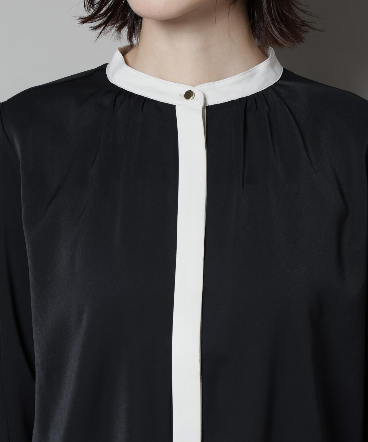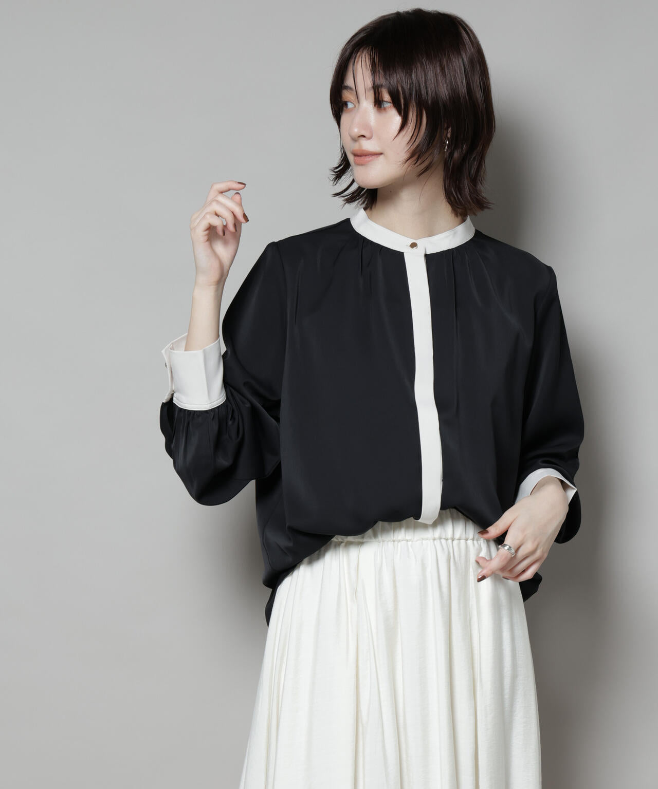 上品な配色のバイカラーデザインが目を引く着映えブラウス。衿元に入ったギャザーやスタンドカラーのデザインが、甘すぎずシャープな印象に。柔らかく、落ち感のある素材できちんと感のある着こなしが叶います。