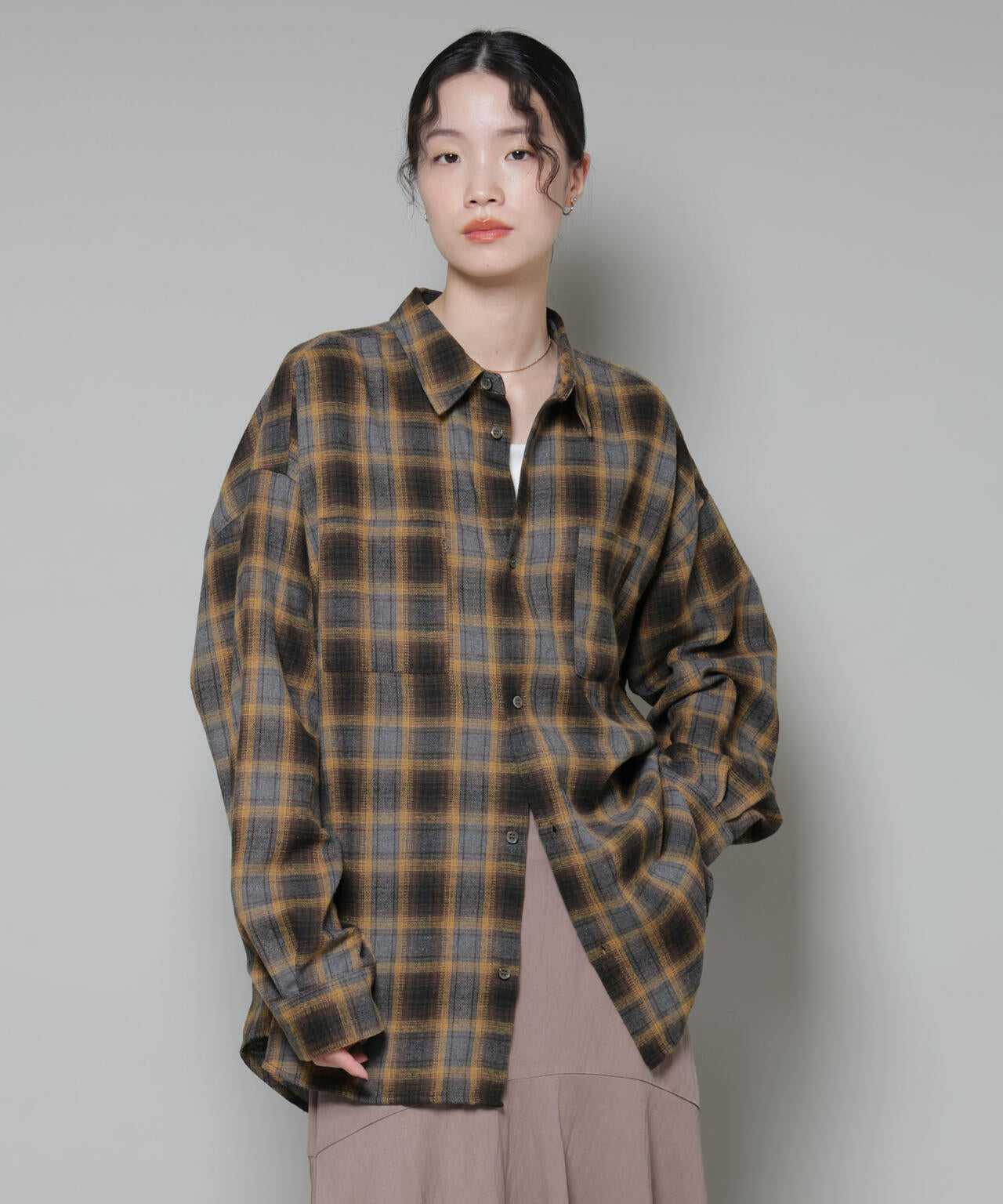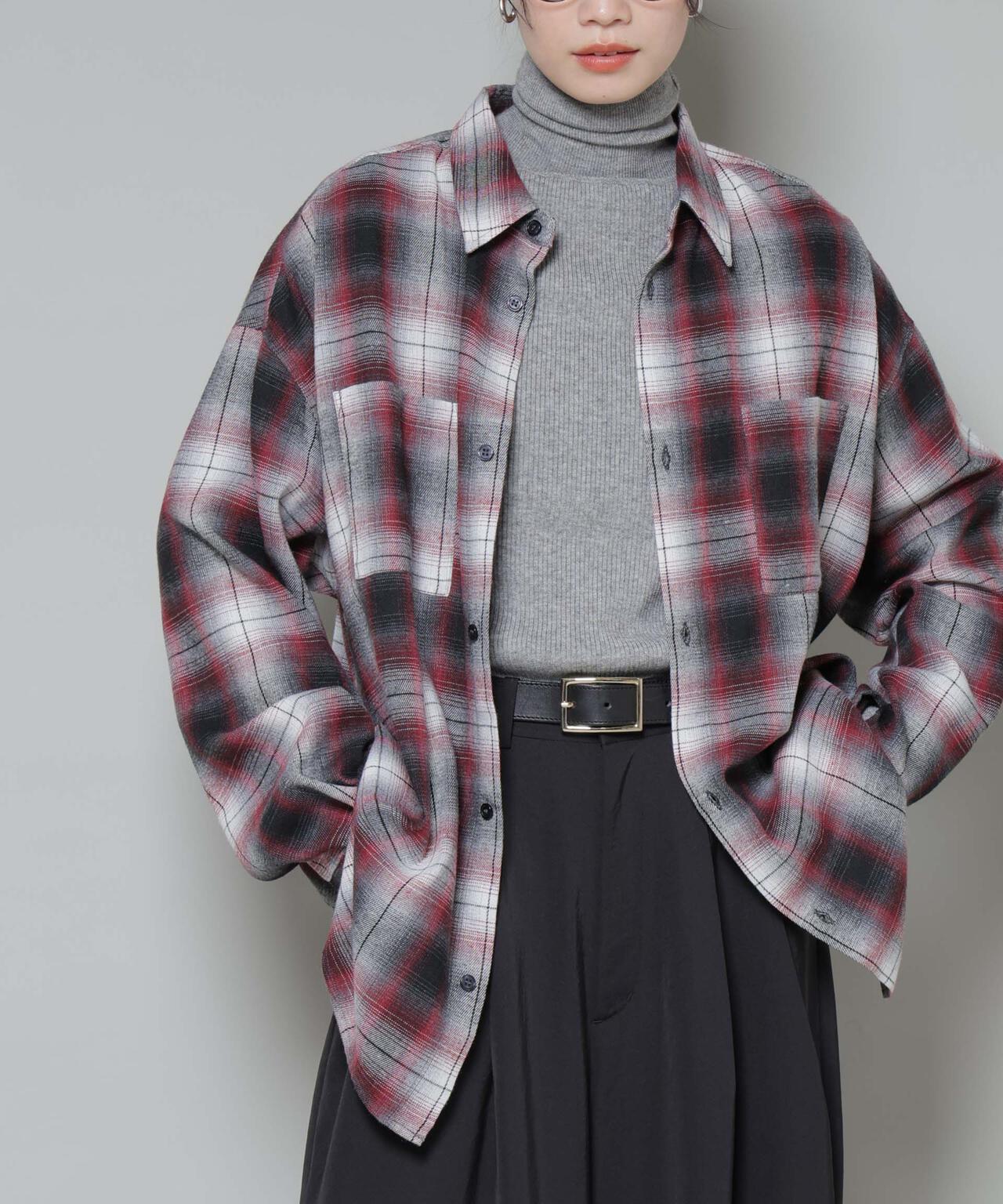 羽織りとしてもインナーとしても使える万能チェックシャツ。柔らかく軽い素材で、ほんのり起毛した温かみのある風合いが魅力。存在感のある大きめチェック柄ながら、落ち着いたトーンのカラー配色で大人っぽく仕上げた一着です。