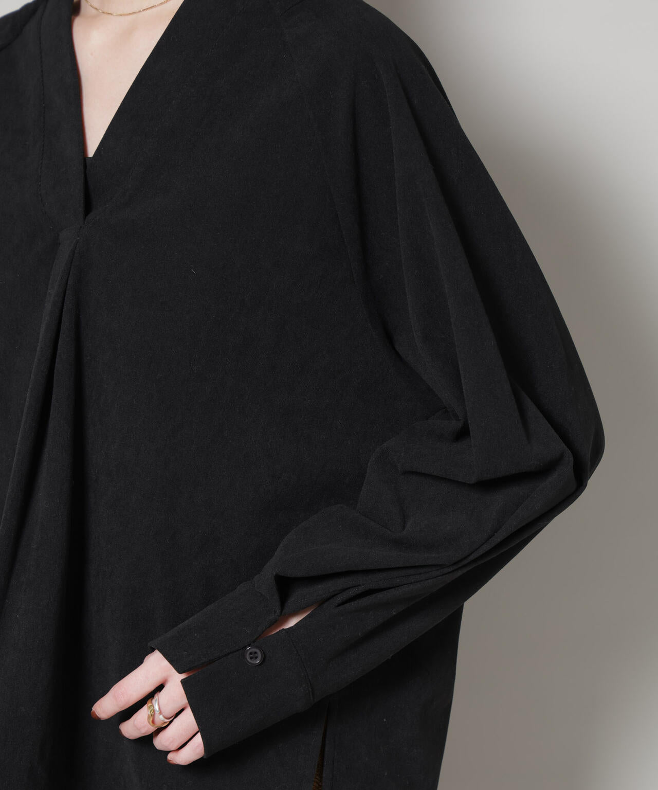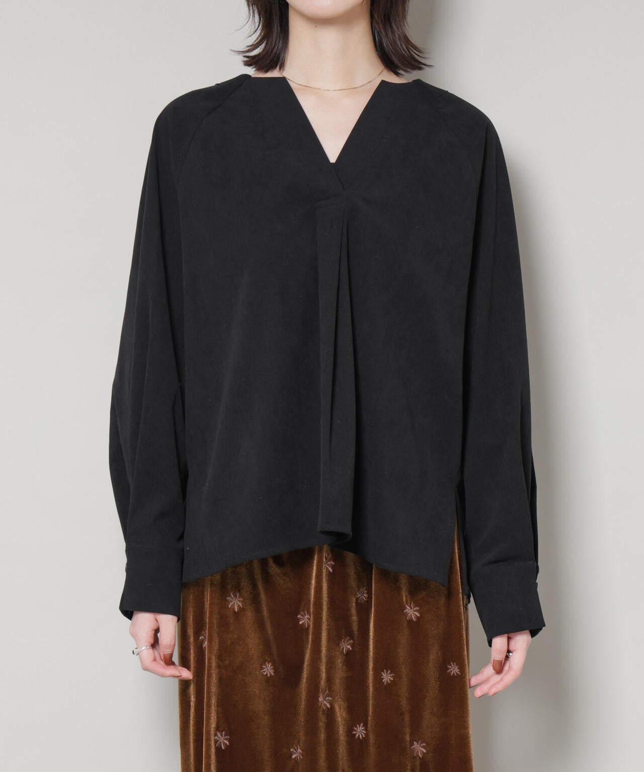 ON/OFFできちんと決まる、起毛素材のプルオーバーブラウス。シンプルなデザインながらも袖や背面のタック、ドルマン切り替え、サイドスリットなど、拘りのディティールが様になるアイテムです。