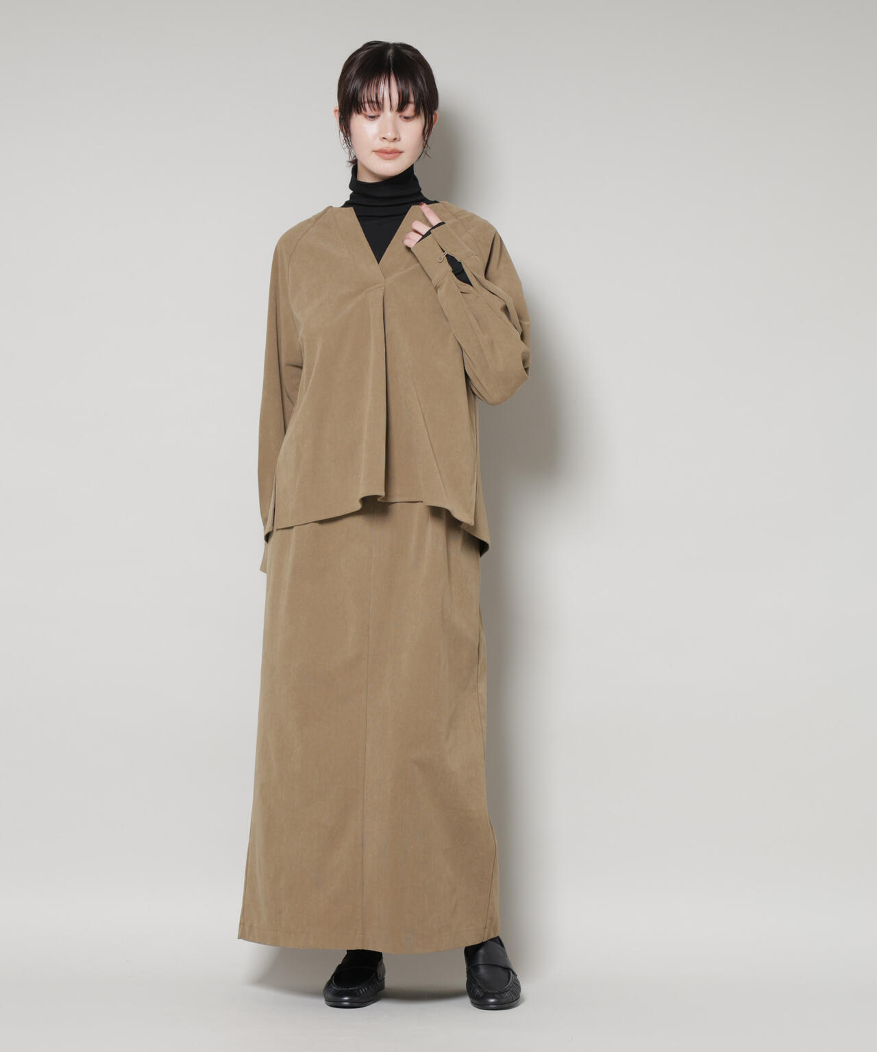 同素材のジャンパースカートの上に重ねて、セットアップコーデも◎