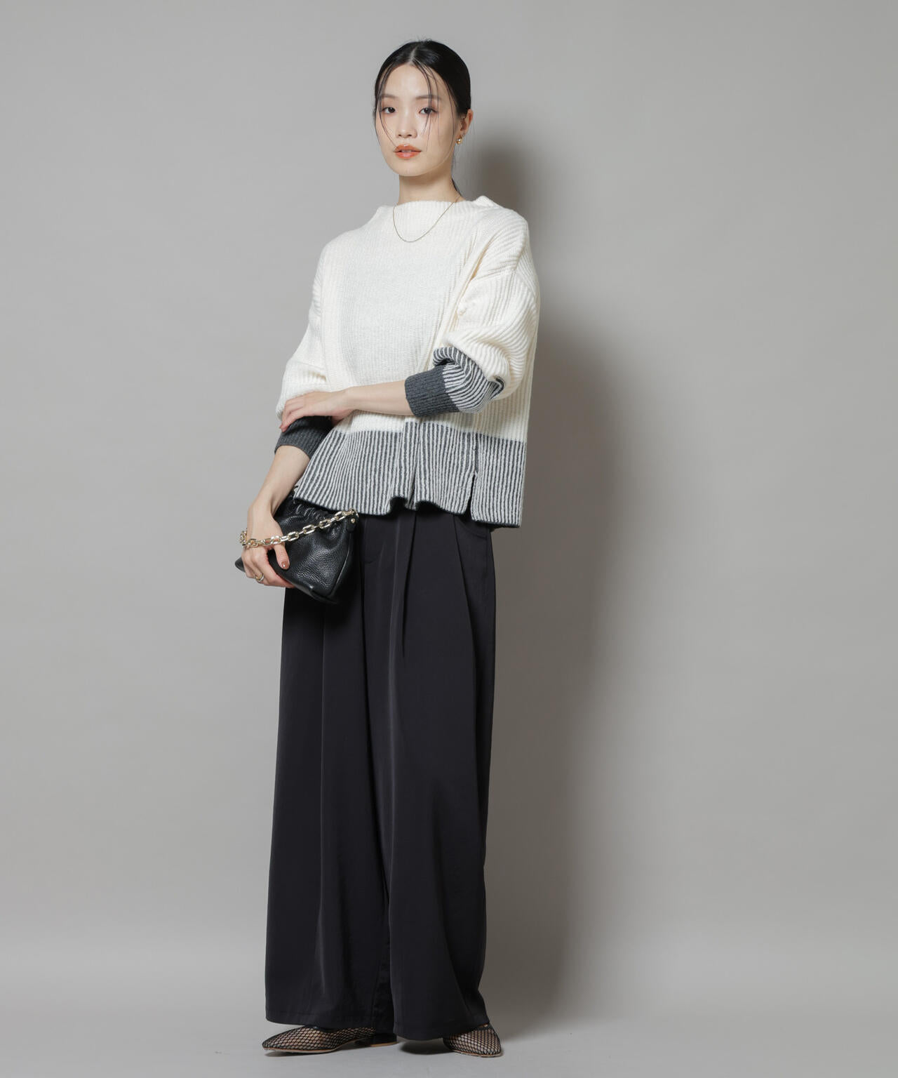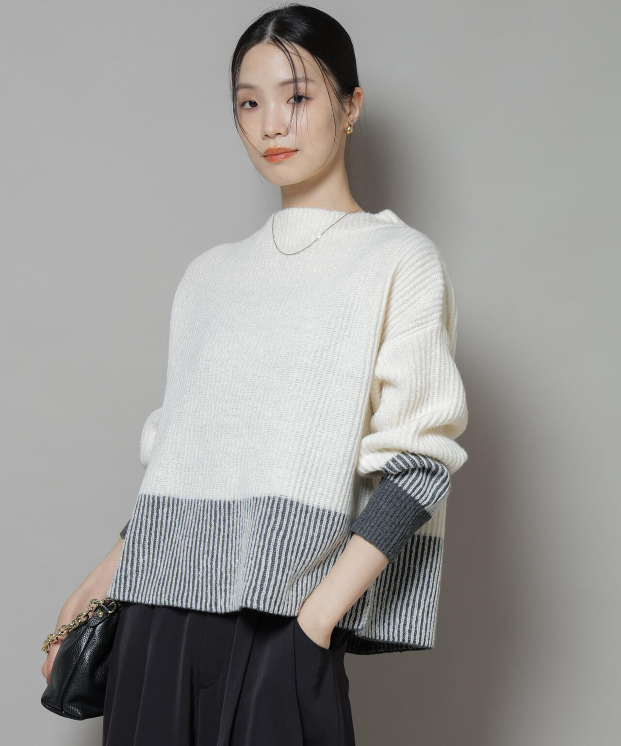目を引くバイカラーとシャドーストライプのデザインが魅力のニットトップス