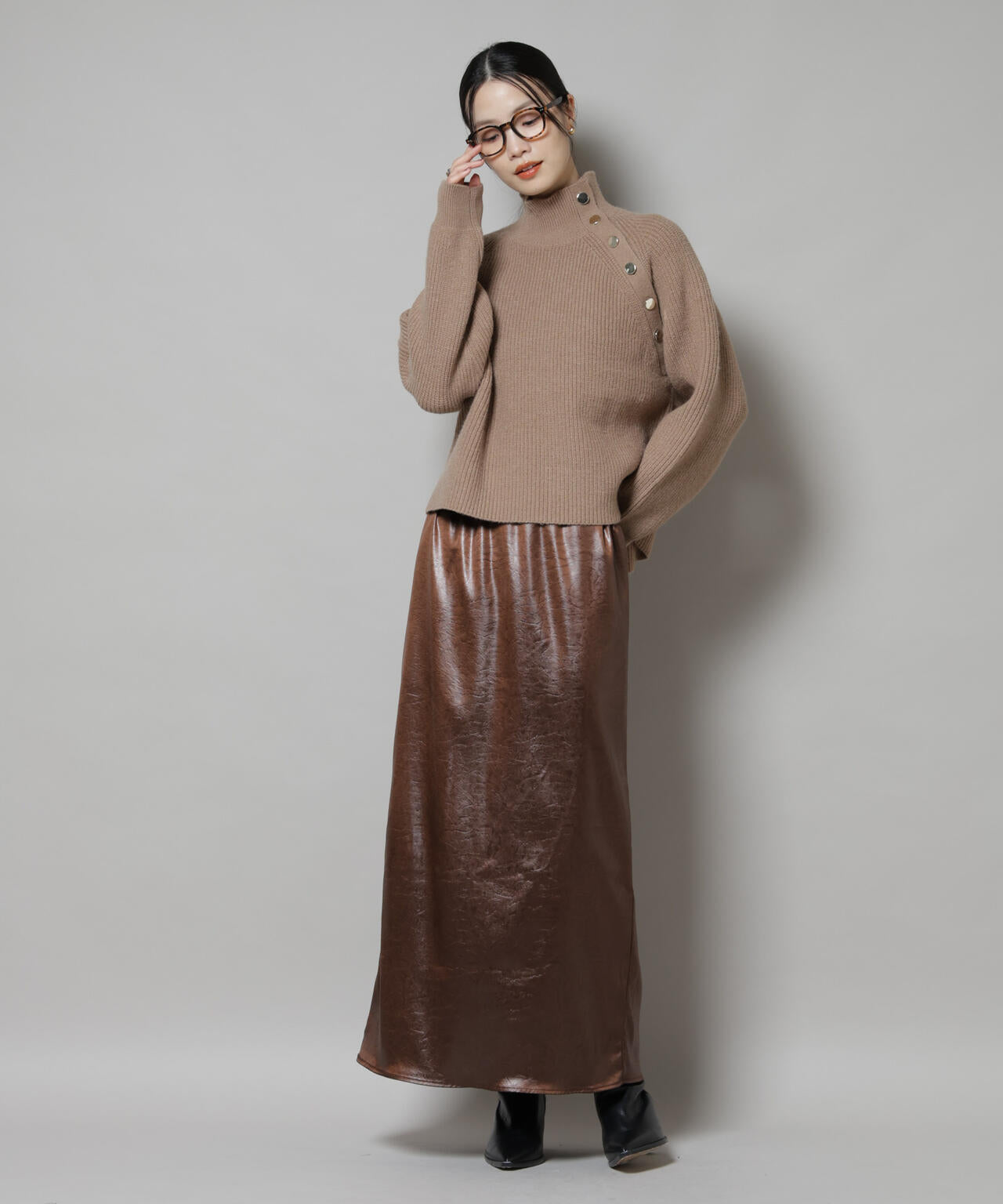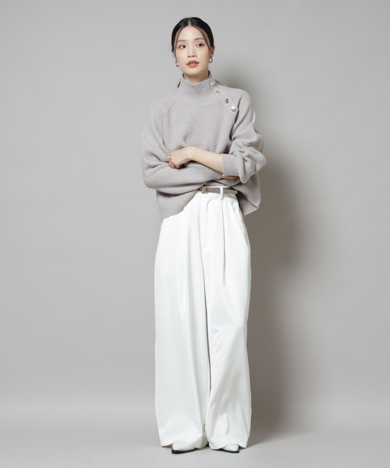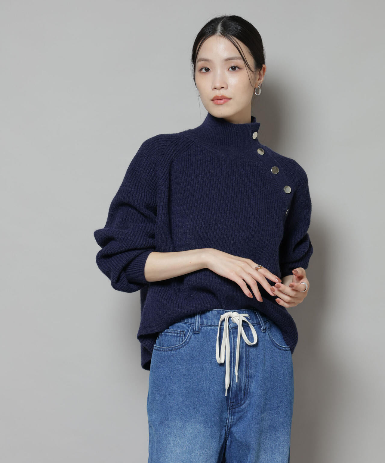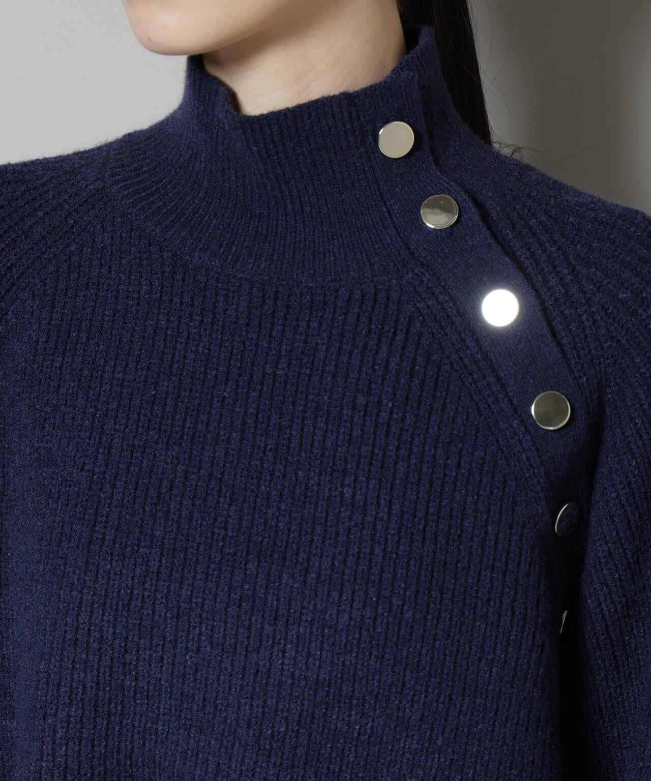 ハイネックの釦ディティールが可愛いニットプルオーバー