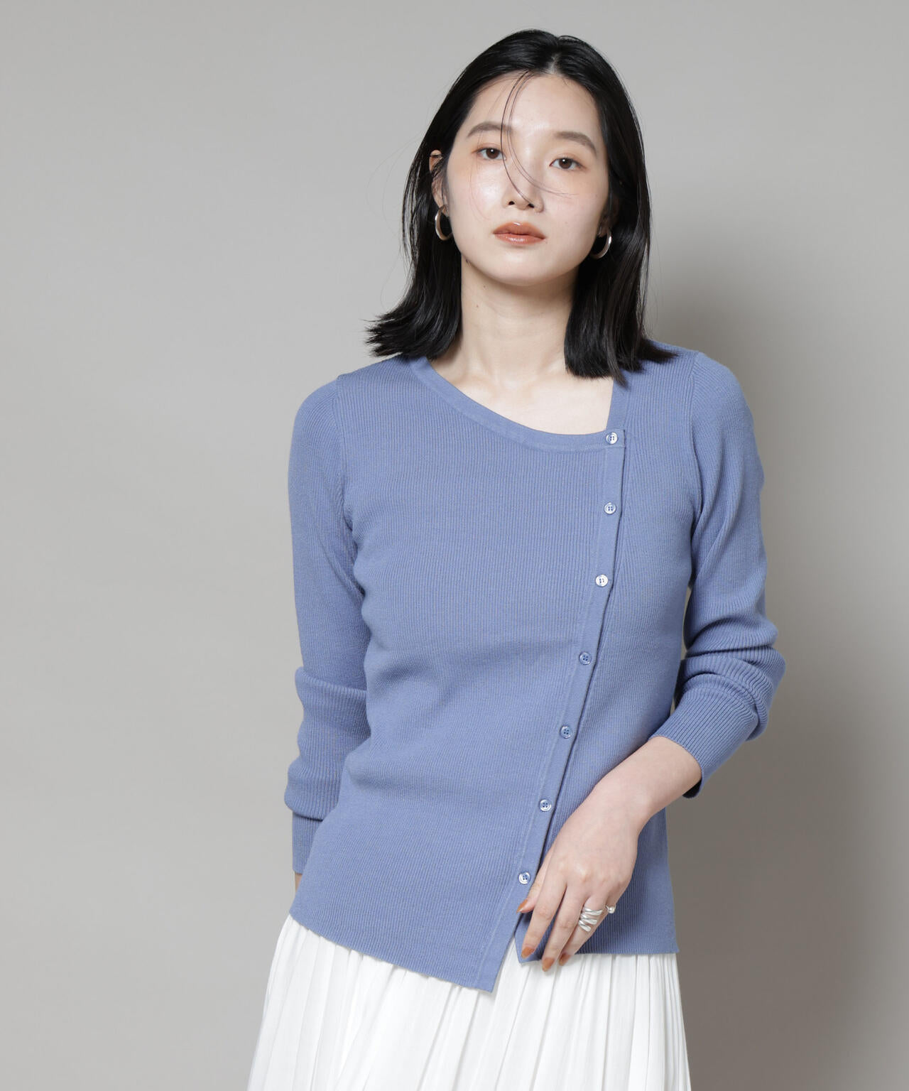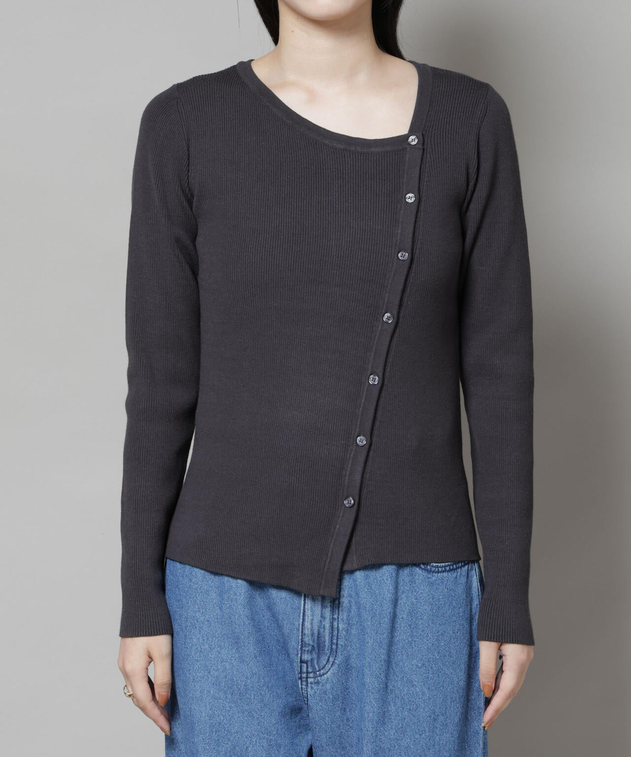 アシメネックのデザインが、上品で大人っぽい雰囲気のデザインニット。斜めに入ったボタンを全て閉めたり、上下を開けて真ん中のみ軽く閉めたり、着こなしのアレンジを楽しめるアイテムです。