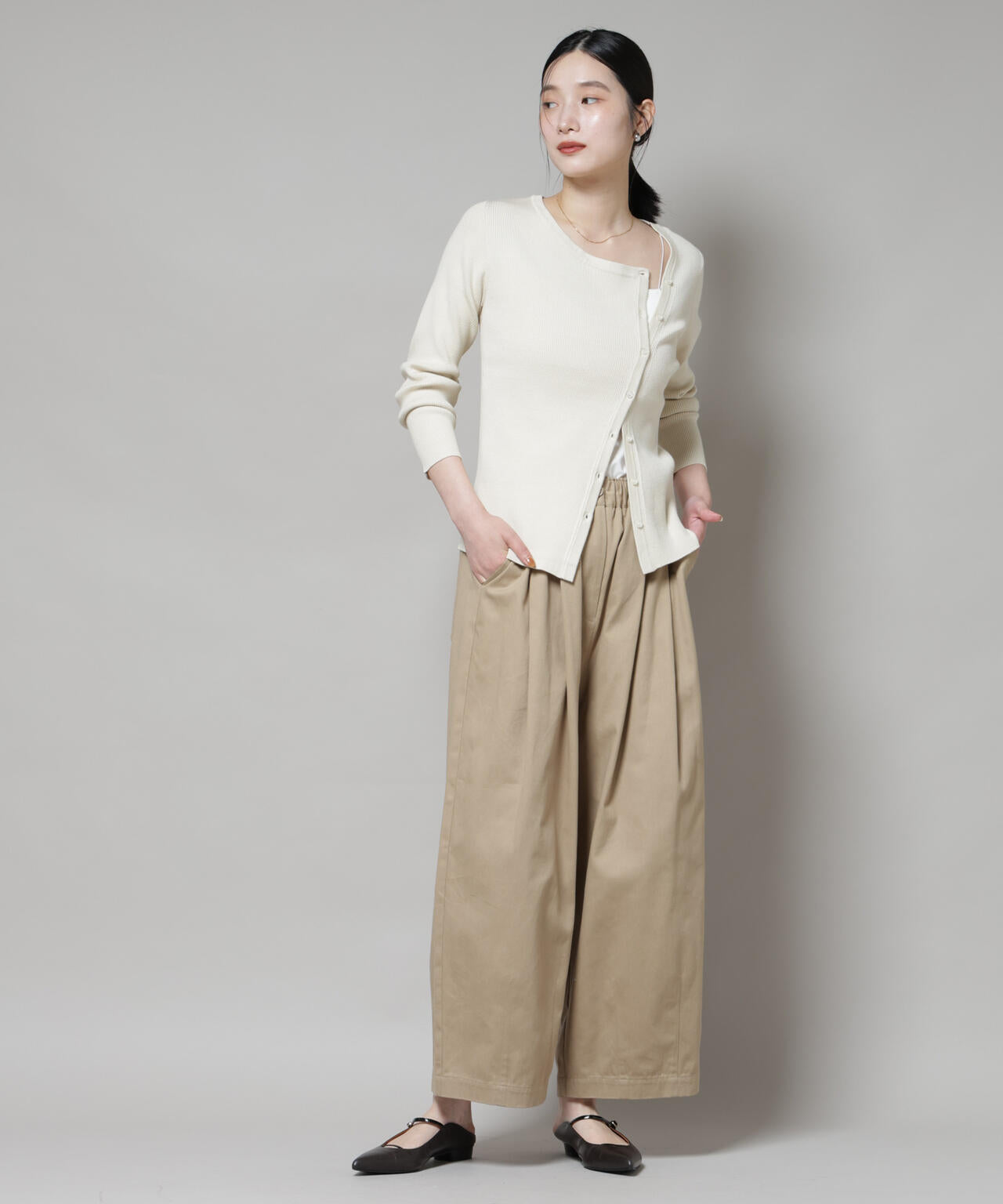 ・ベーシックで着回しやすいチャコール、ライトベージュ
