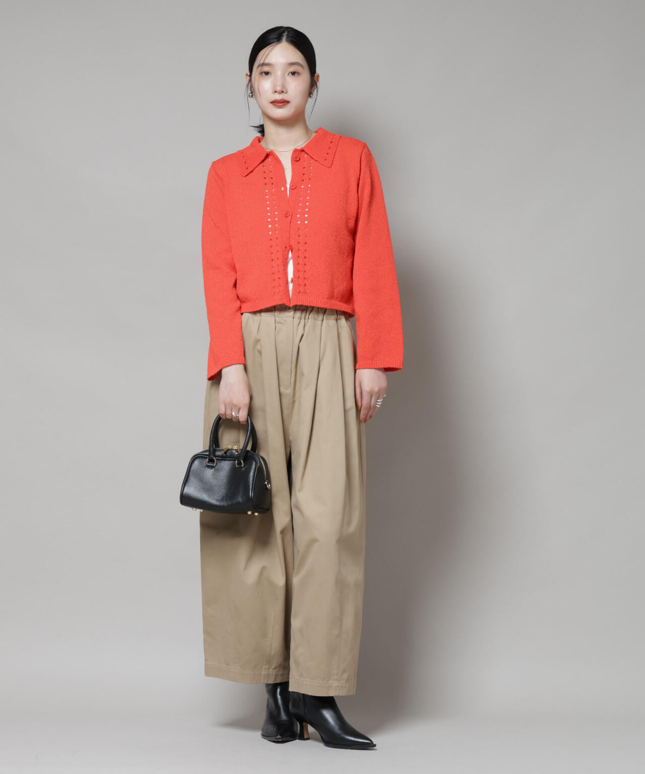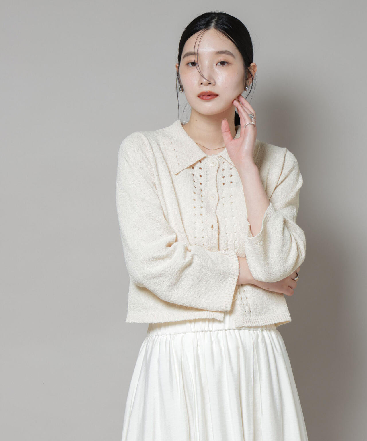 フロントと衿の規則的なアイレットディテールが目を引くニットカーディガン。前を閉めてトップスとして合わせたり、ボタンを開けてインナーとレイヤードしたり、幅広い着こなしを楽しめるアイテムです。
