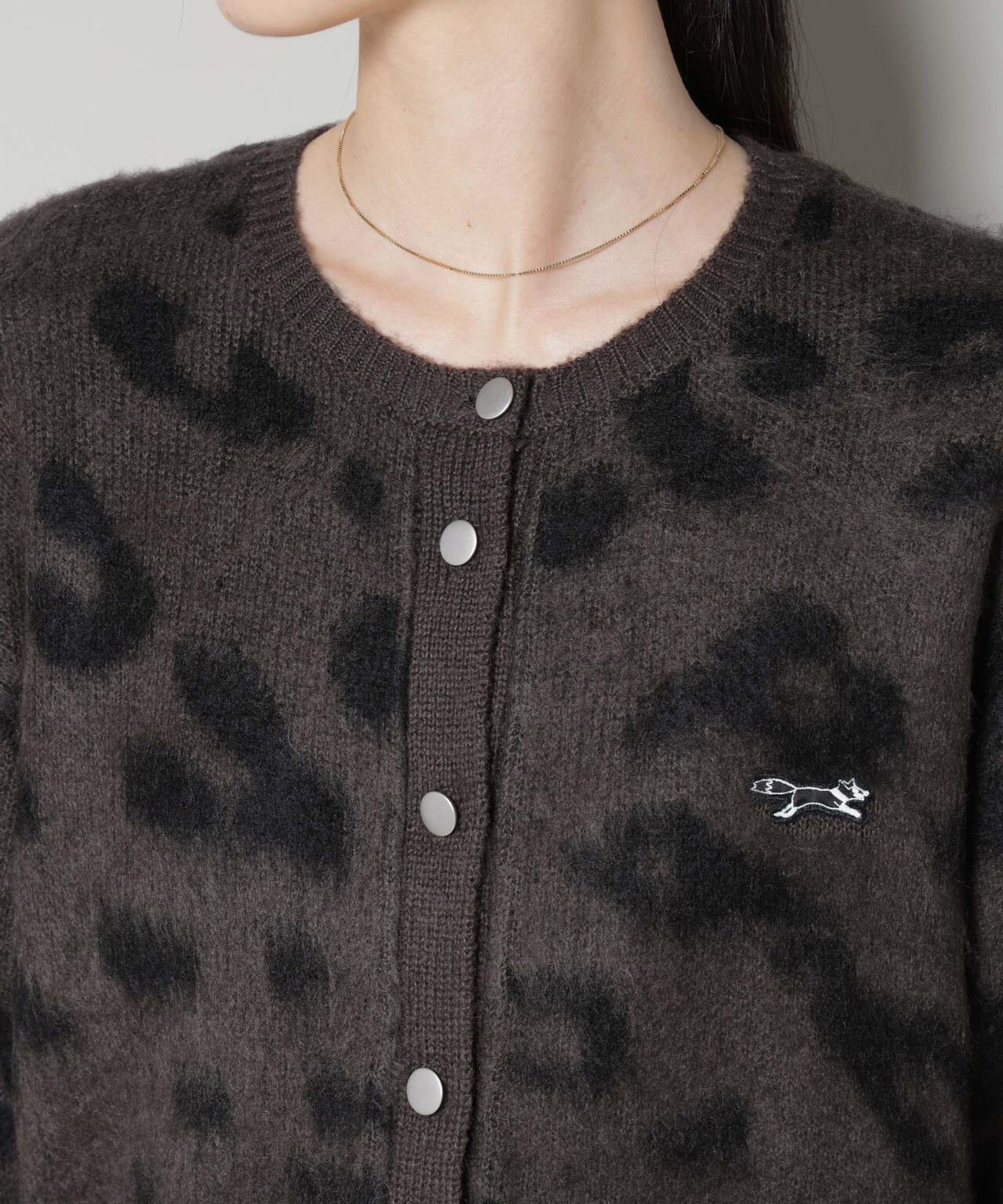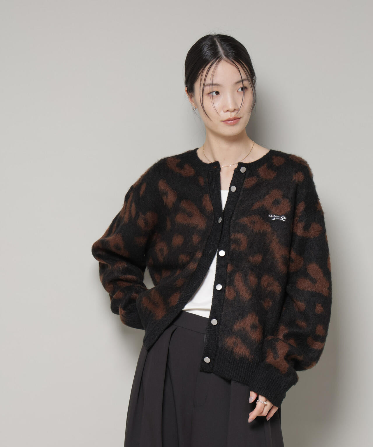 落ち着いた印象のレオパード柄が目を惹くクルーネックカーディガン。同系色の配色で仕上げたレオパード柄は、派手に見えすぎないのでコーディネートしやすいのが嬉しいポイント。ふわふわした柔らかな質感も可愛らしい一枚です。