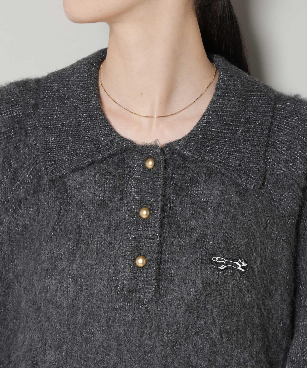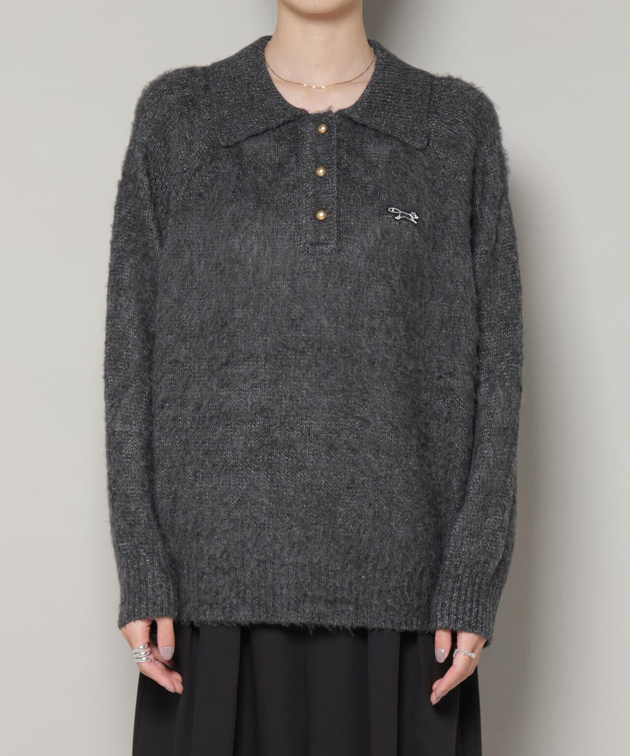 シーズンムードが高まる、起毛感のあるシャギー素材のプルオーバーニット。フロントのゴールド釦がキレイ目な印象の衿付きデザインで、ON/OFFでサマになるアイテムです。