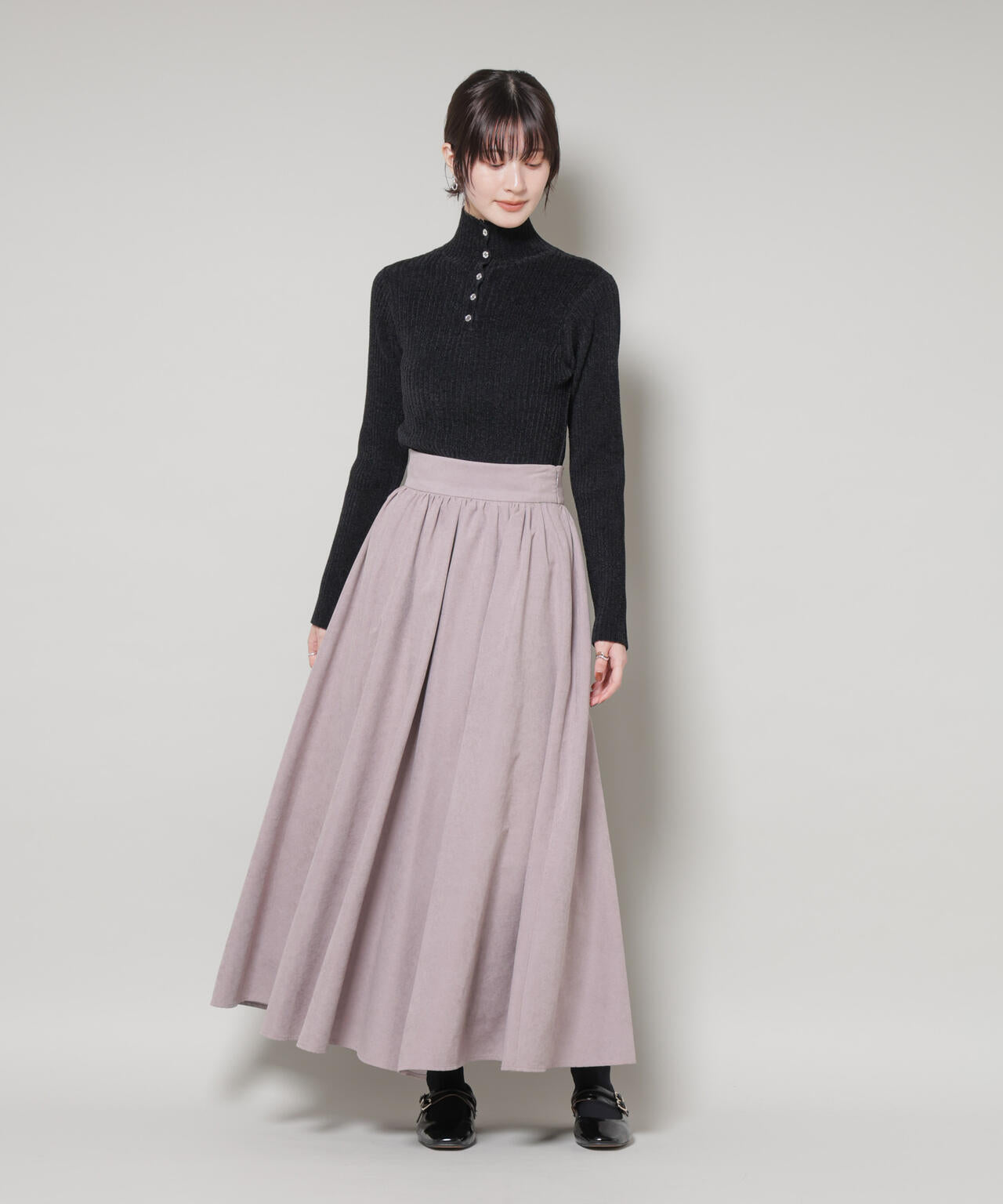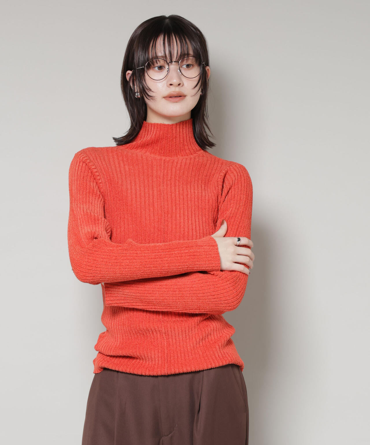 顔周りをすっきり見せてくれるハイネックニットトップス