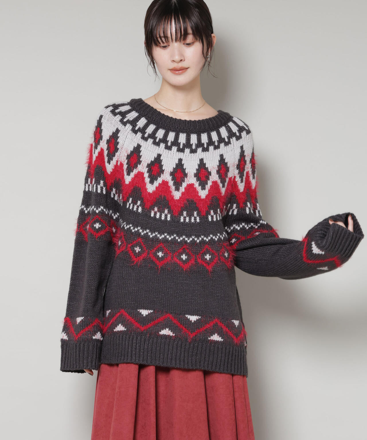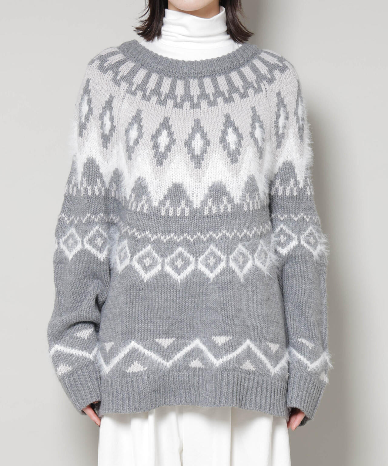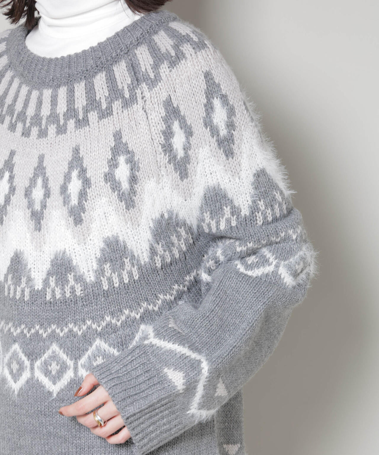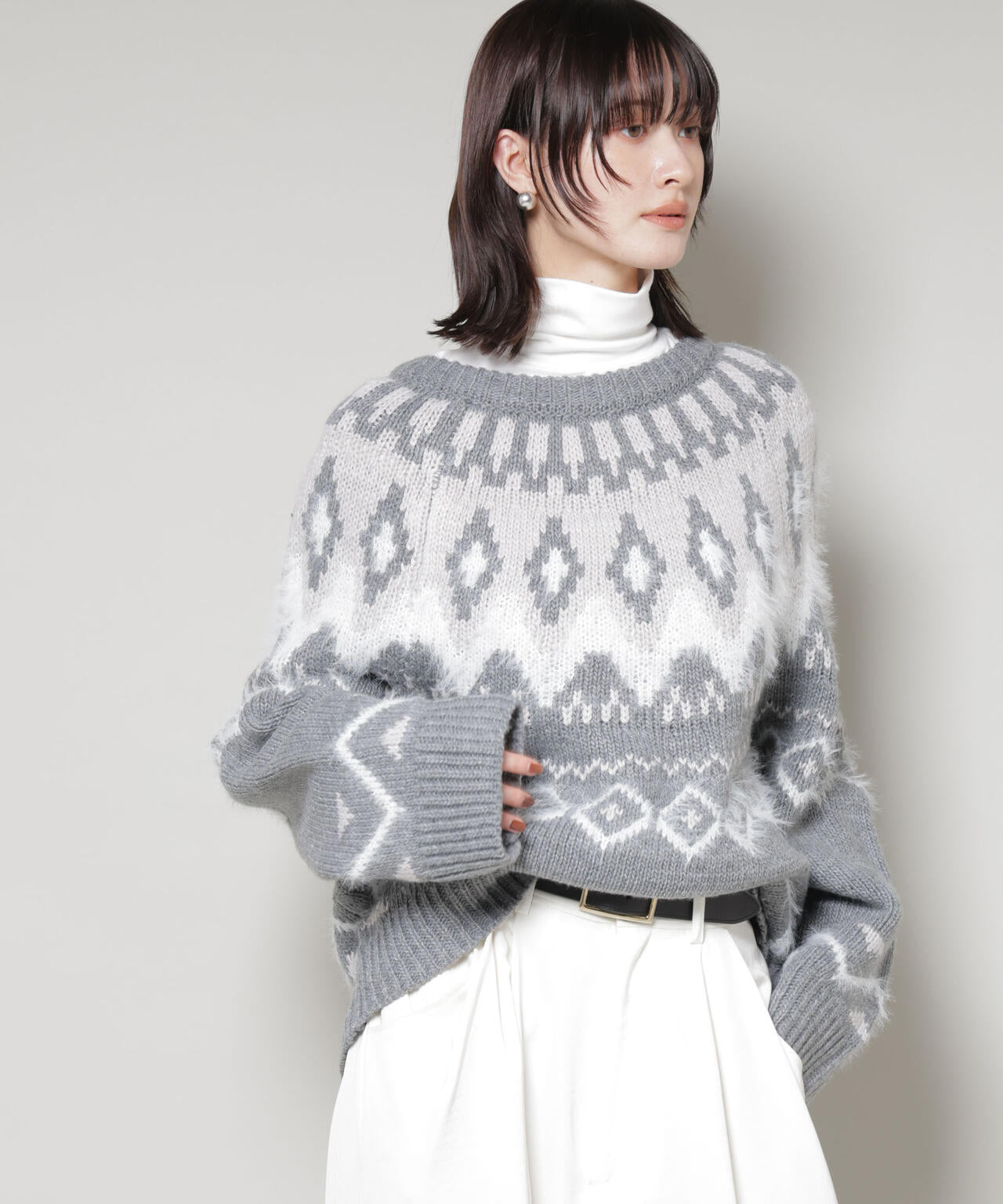 ・求心柄が主役になる、シャギーミックス素材のニットトップス