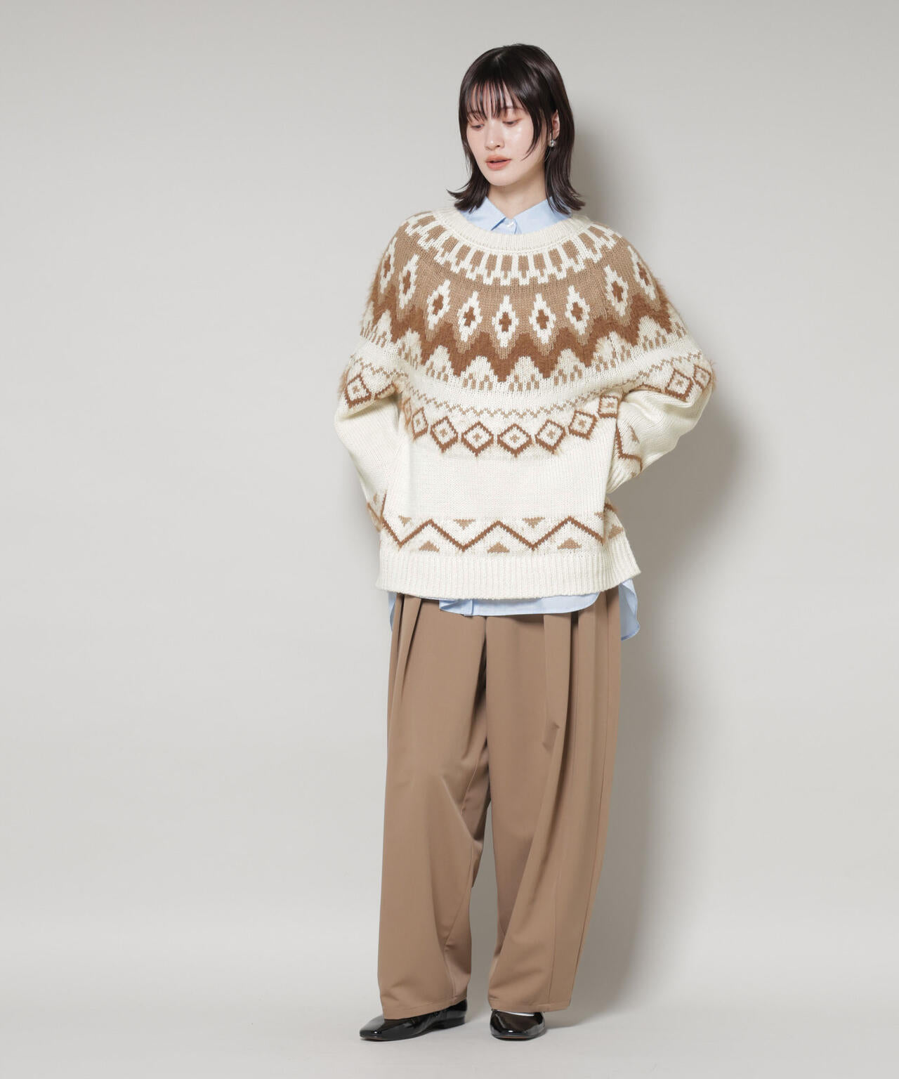 1枚で存在感抜群の、大人の求心柄ニットプルオーバー。ゆったりとしたシルエットでスカートにもパンツにも合わせやすく、デイリーの着回しに重宝します。