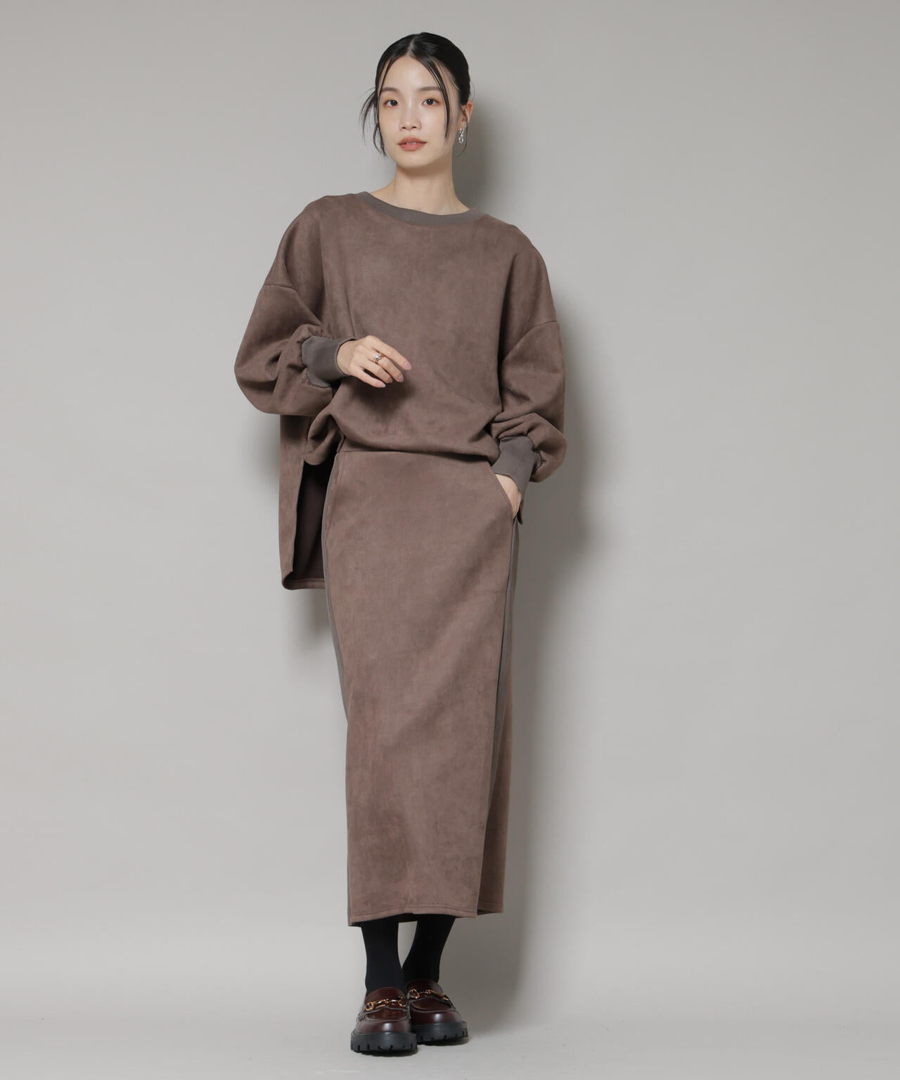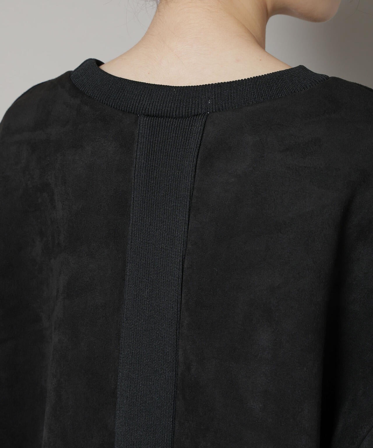 上品な雰囲気のフェイクスエード素材で仕立てたプルオーバートップス。シンプルなデザインながら、センターバック部分にリブラインを施しデザイン性もプラス。同素材展開のスカートとのセットアップスタイルもおすすめです。