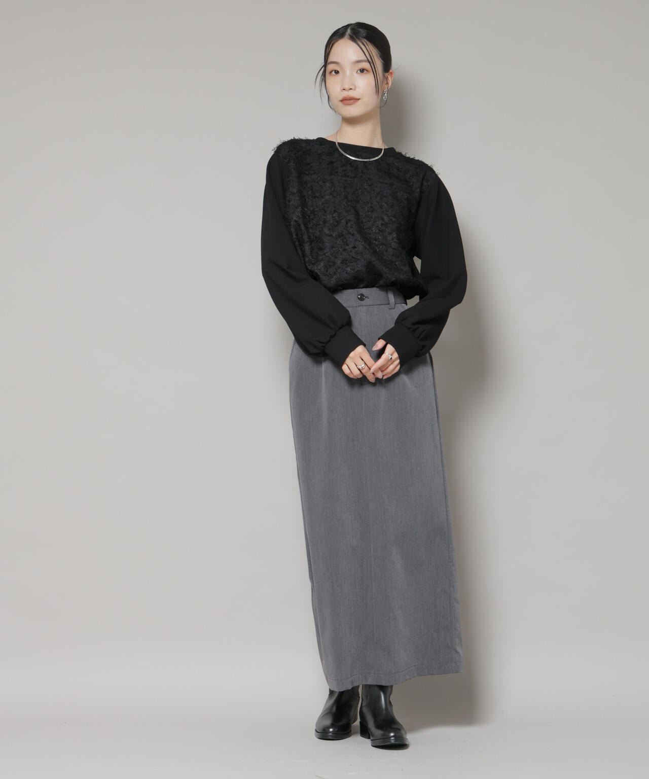 ・異素材を組み合わせたブラウスライクなプルオーバー