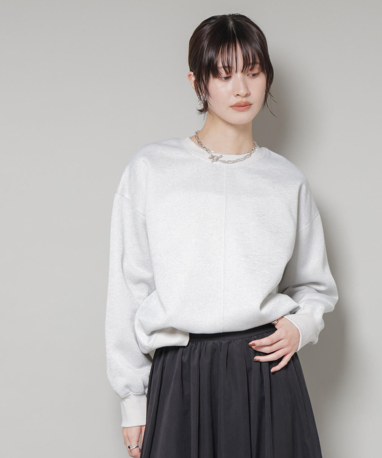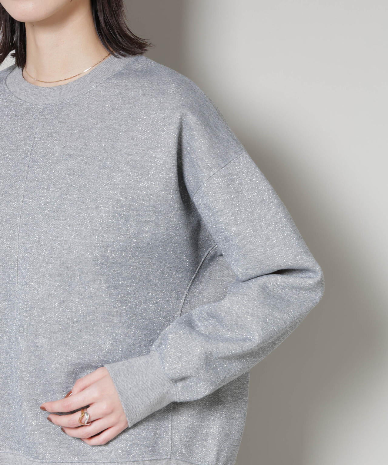 さりげないラメ感が華やかさをプラスするカットソートップス。ややワイドな袖と丸みのあるシルエットで、リラックス感がありながらも女性らしい印象に。裏毛のカットソー素材で肌触りも良く、カジュアルながらも上品さを感じられる一枚です。