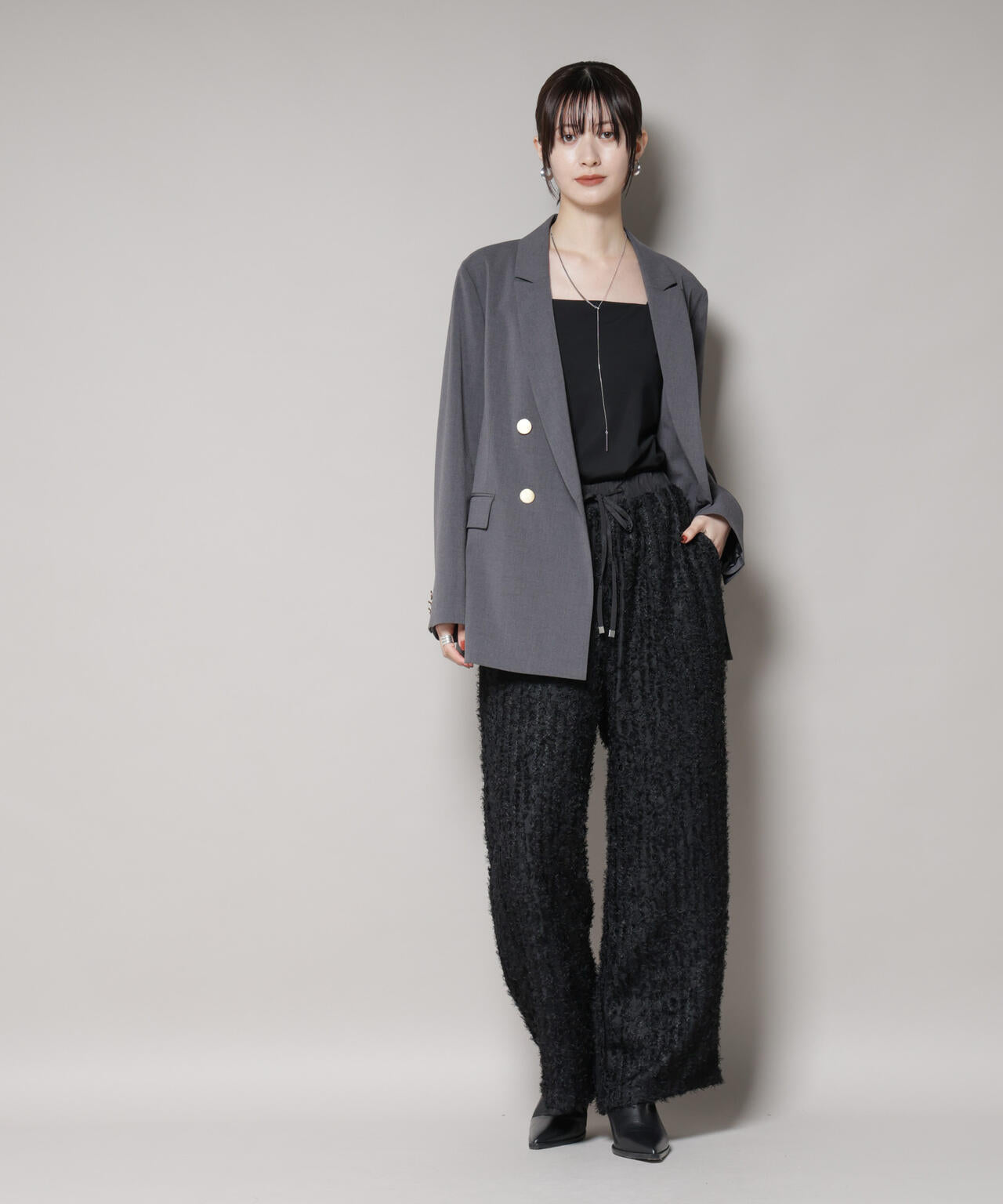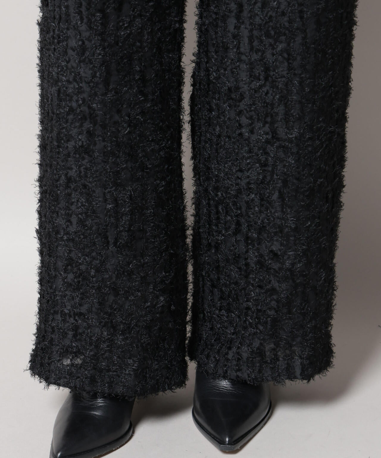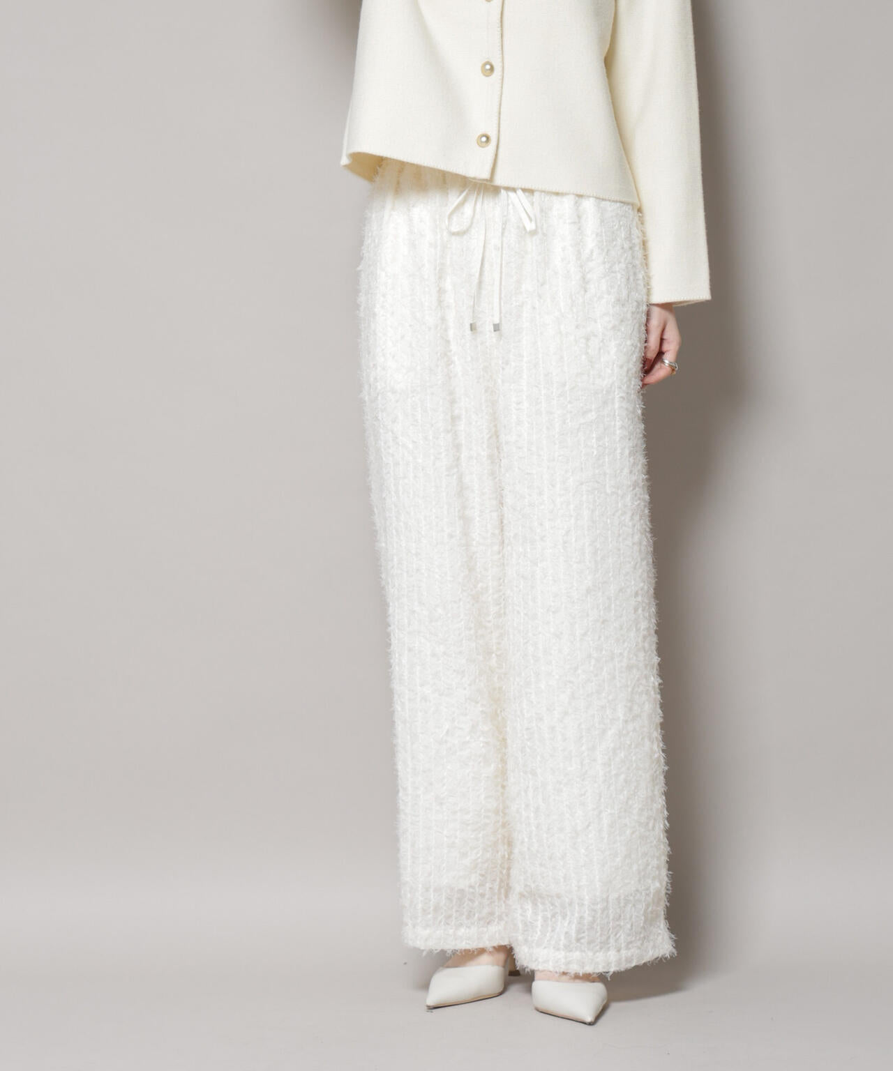 トレンド感のあるフリンジジャガード素材が目を惹くワイドイージーパンツ