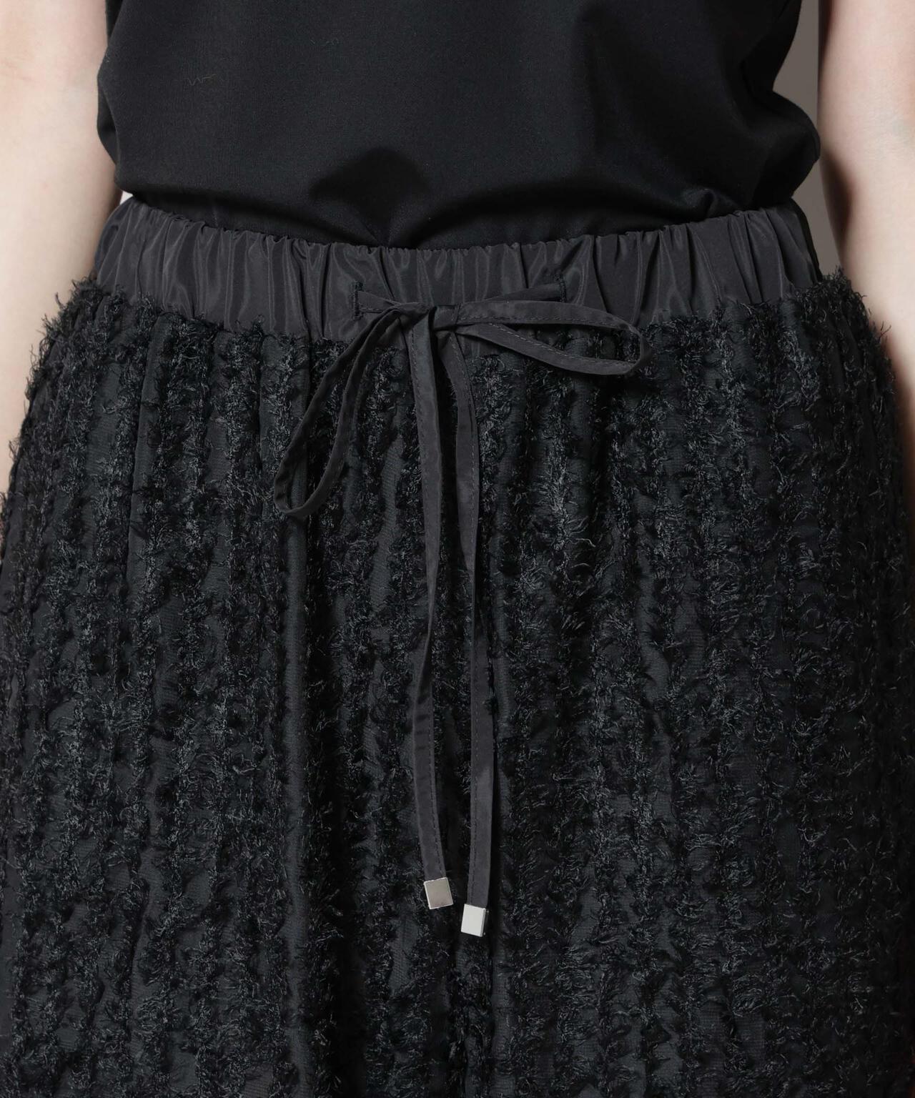 トレンド感のあるフリンジジャガード素材が目を惹くワイドイージーパンツ。動きに合わせて揺れる表情豊かな素材感が特徴◎。シンプルなトップスと合わせるだけで、こなれ感もあるスタイリングが叶う大人カジュアルボトムです。