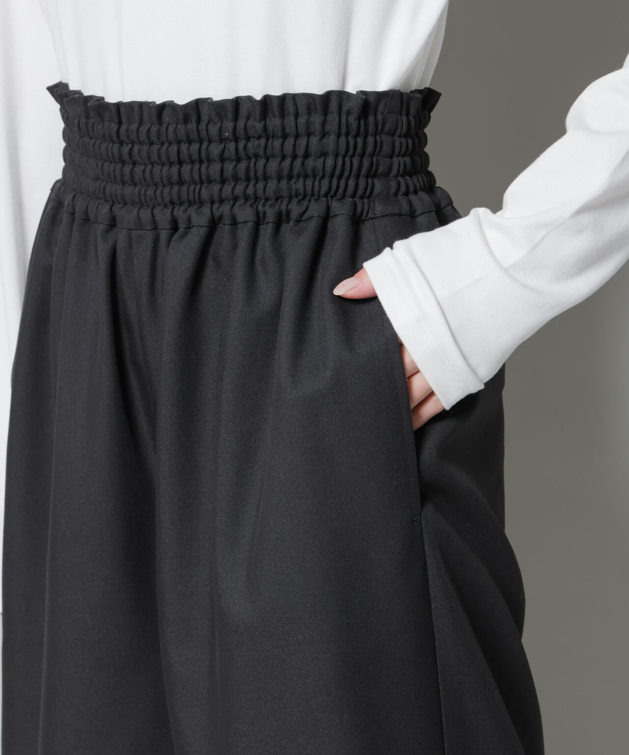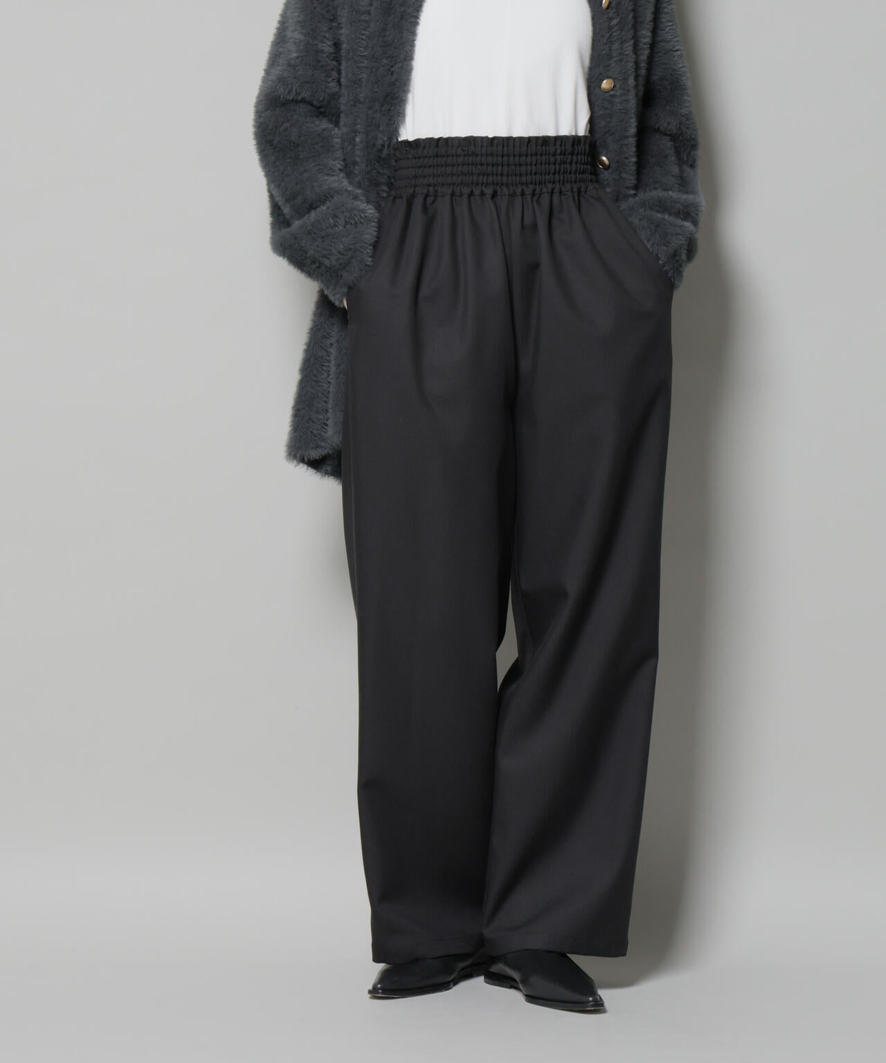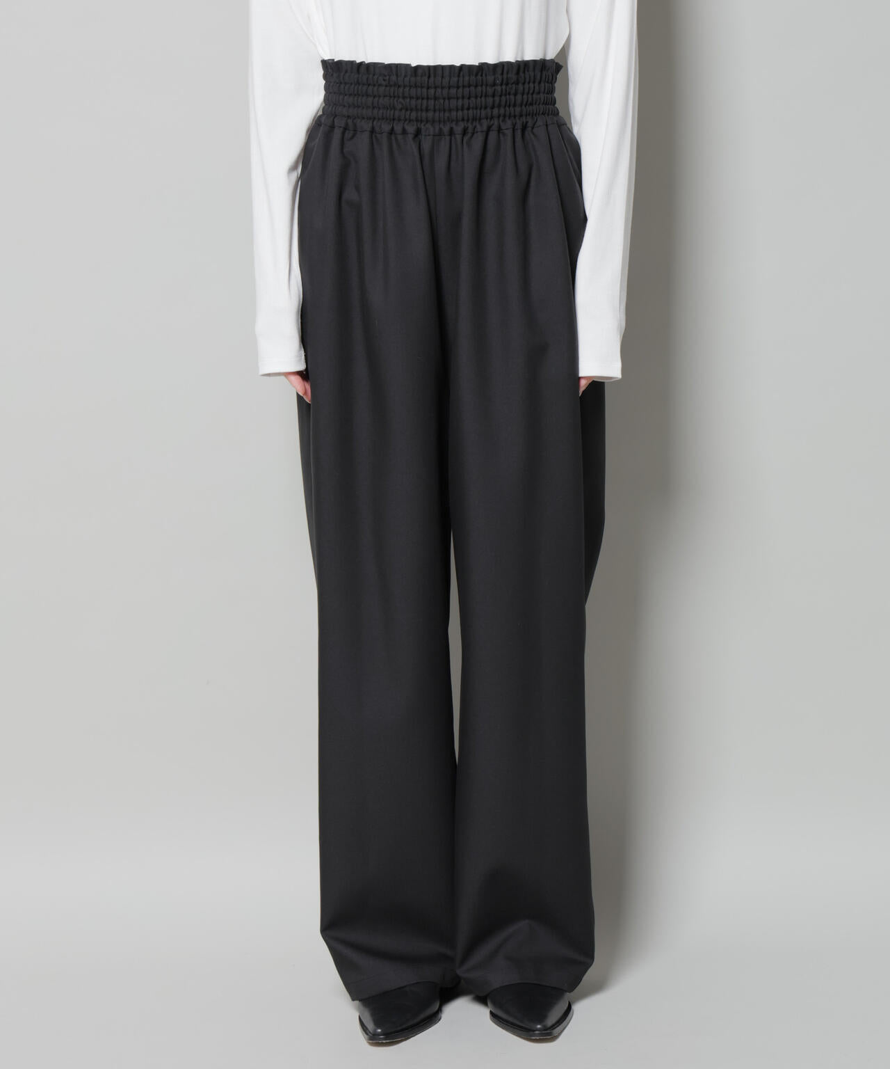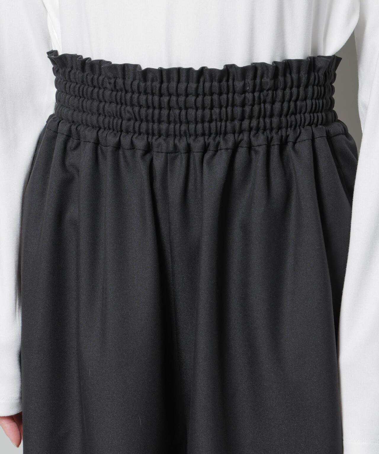 程良い落ち感とウエストのシャーリングデザインがリラックス感のあるワイドパンツ