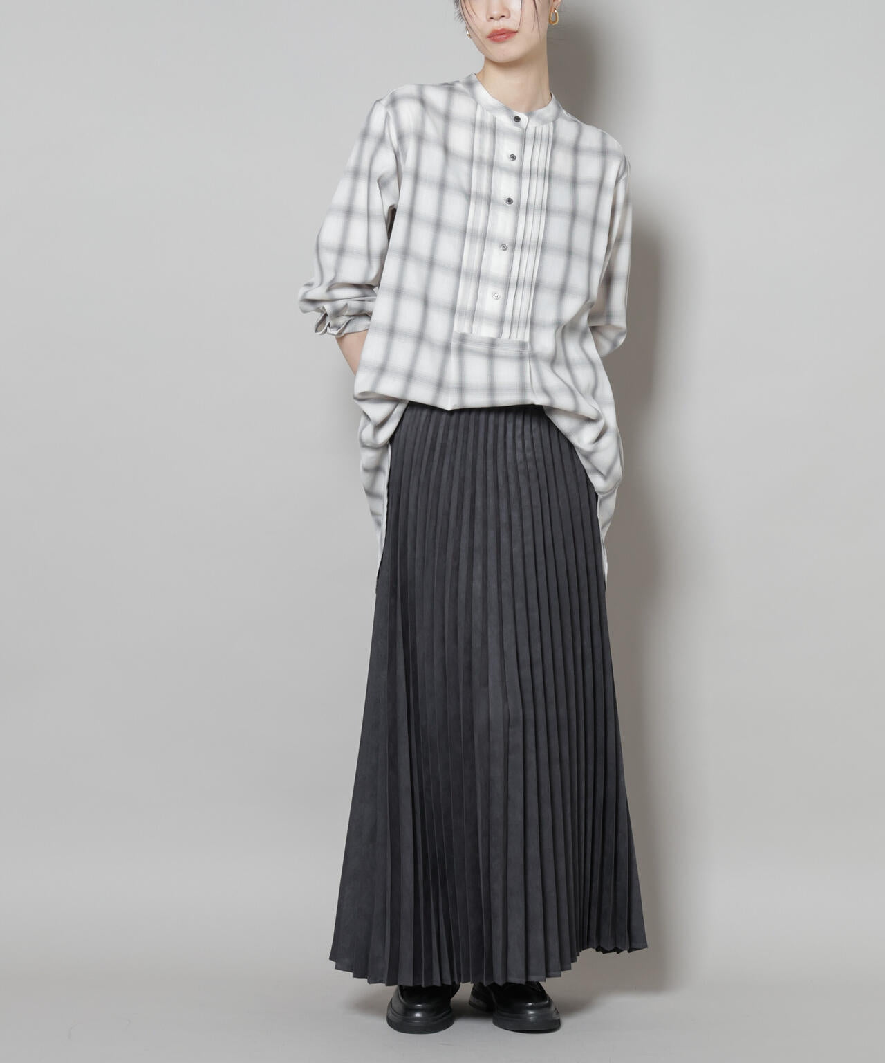 着るだけで今っぽさを纏える、フェイクスエード素材で仕立てたプリーツスカート。ニットやスウェットを合わせたり、ジャケットを合わせたり、幅広いコーディネートを楽しめます。