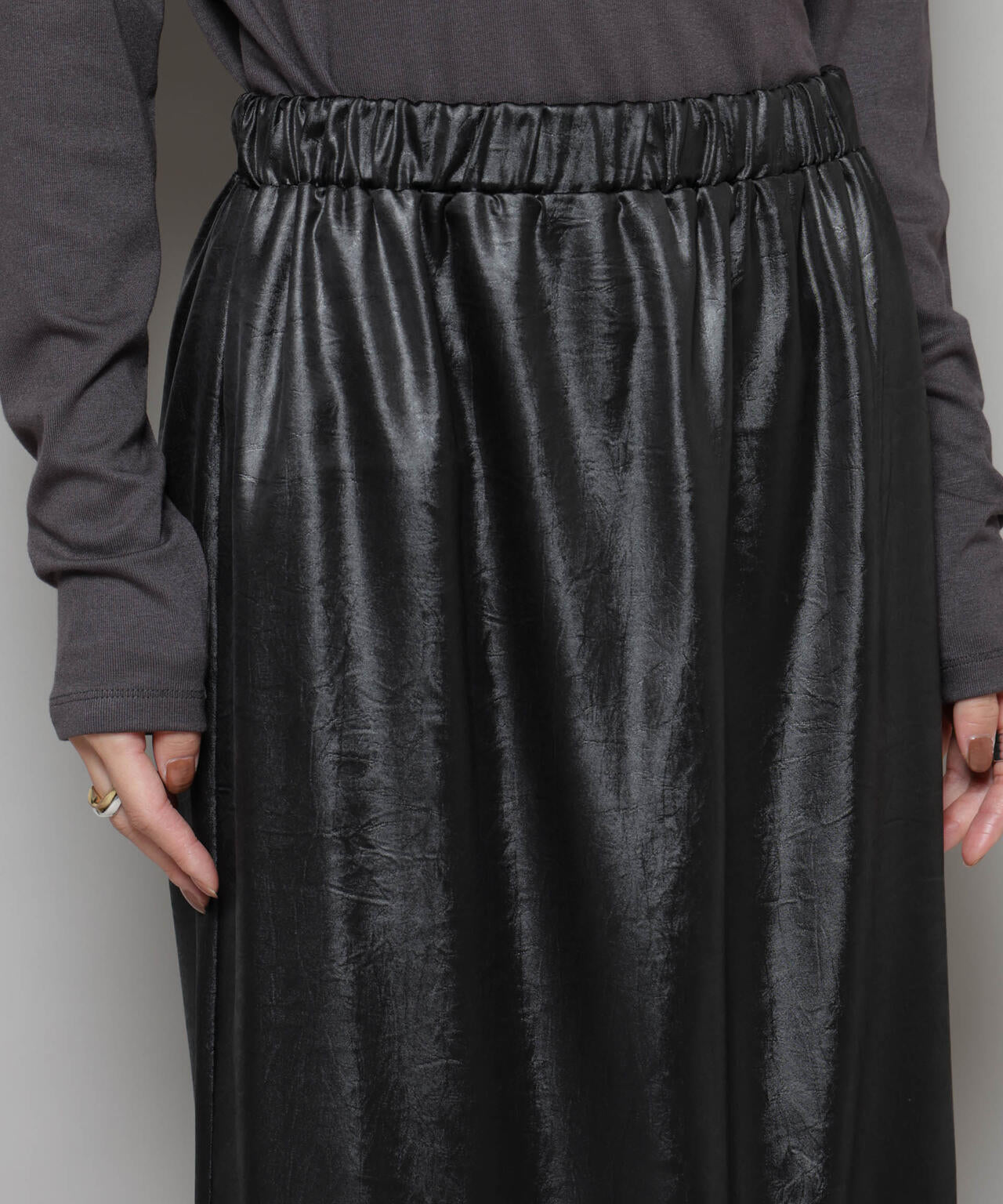 レザーライクな微光沢が大人っぽい印象のロングスカート
