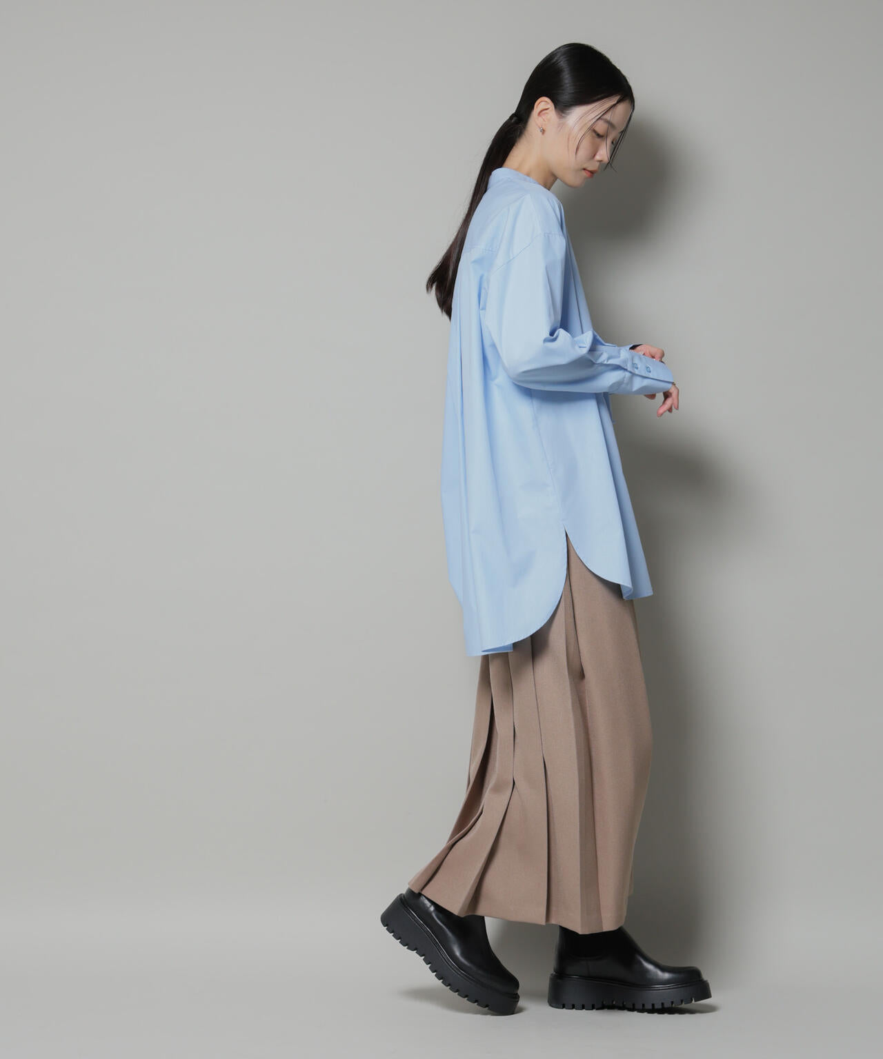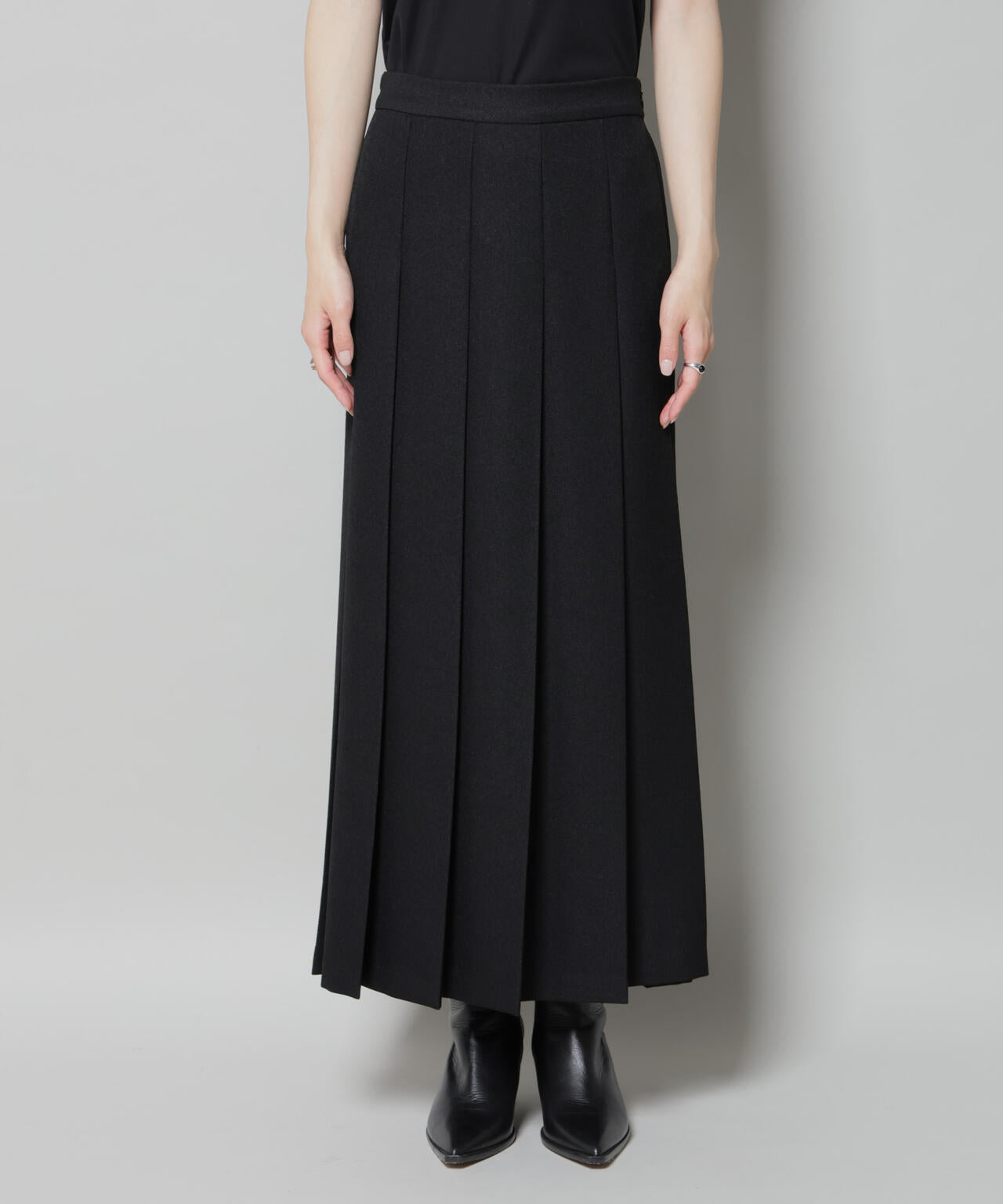 太幅のプリーツが今年らしい印象のロングプリーツスカート。腰回りがスッキリ見えるよう、ヒップ回りまではプリーツが開かず、裾にかけて広がるシルエットに拘りました。きちんと感あるデザインながらもカジュアルダウンしやすく、ON/OFFで活躍するアイテムです。