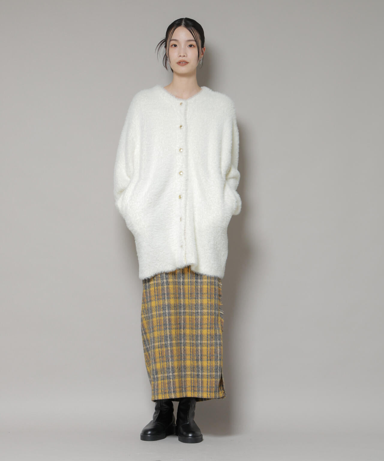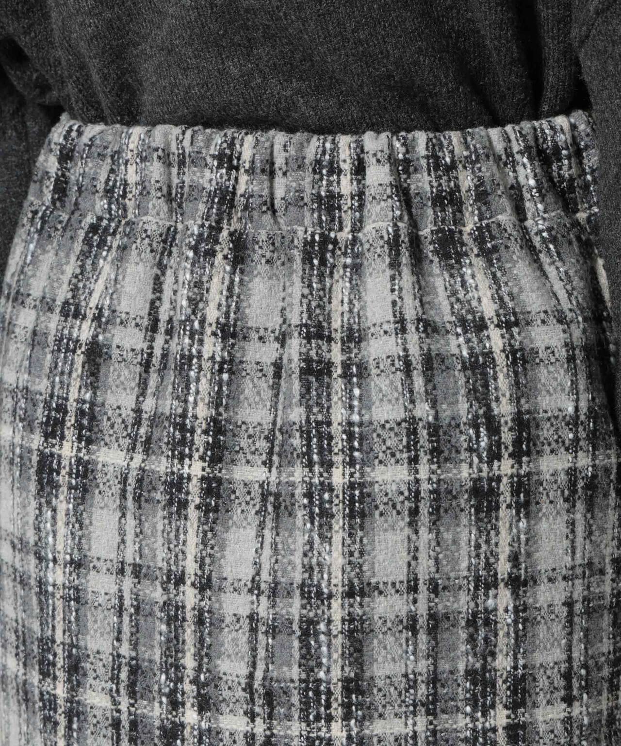 秋めくチェック柄が印象的なIラインスカート。縦に入ったフリンジがデザイン性とスタイルアップを実現。シンプルなトップスと合わせるだけでサマになる主役のデザインです。