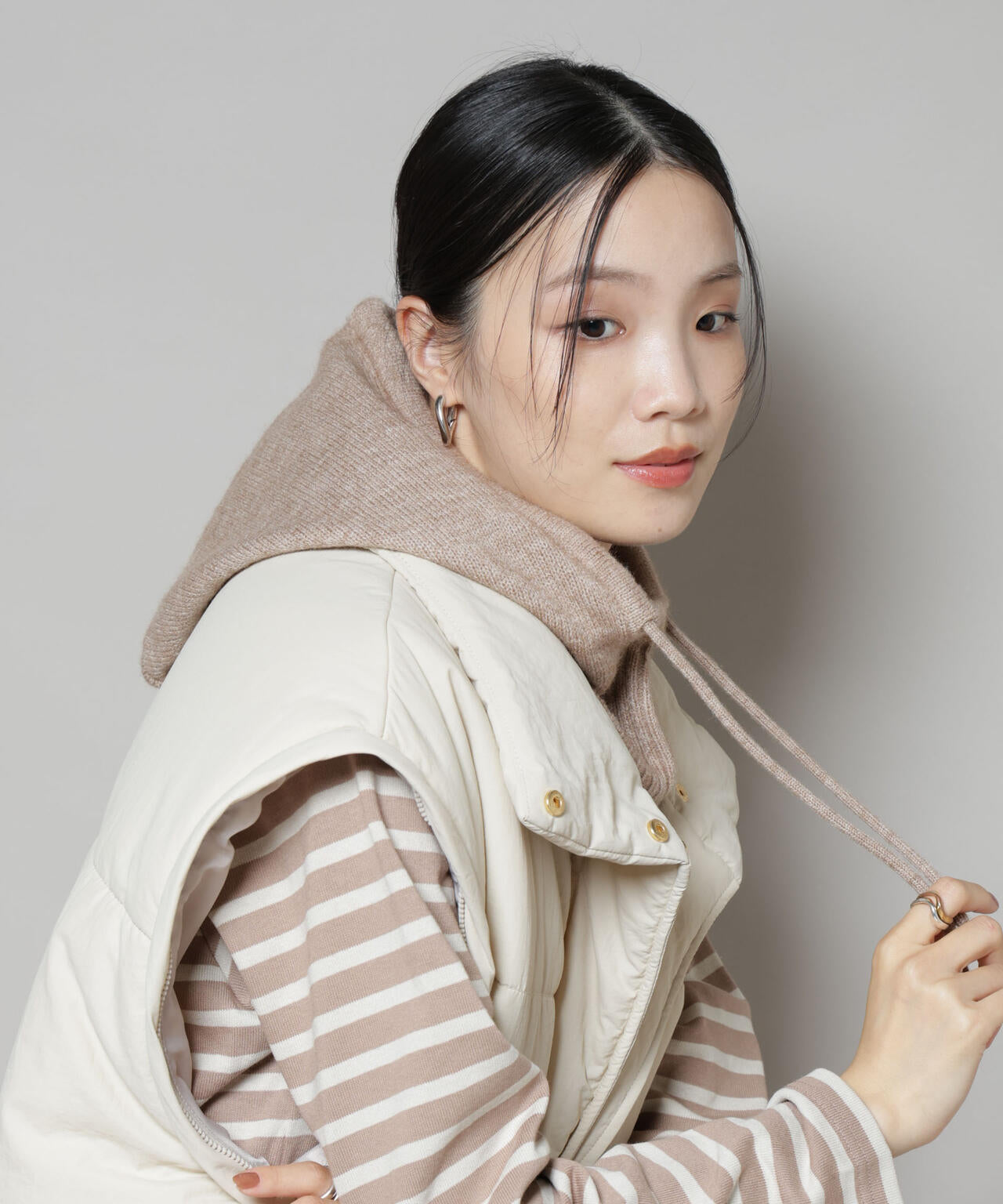 フードをかぶらずにそのままおろして、フード付きネックウォーマーのような使い方もオススメ
